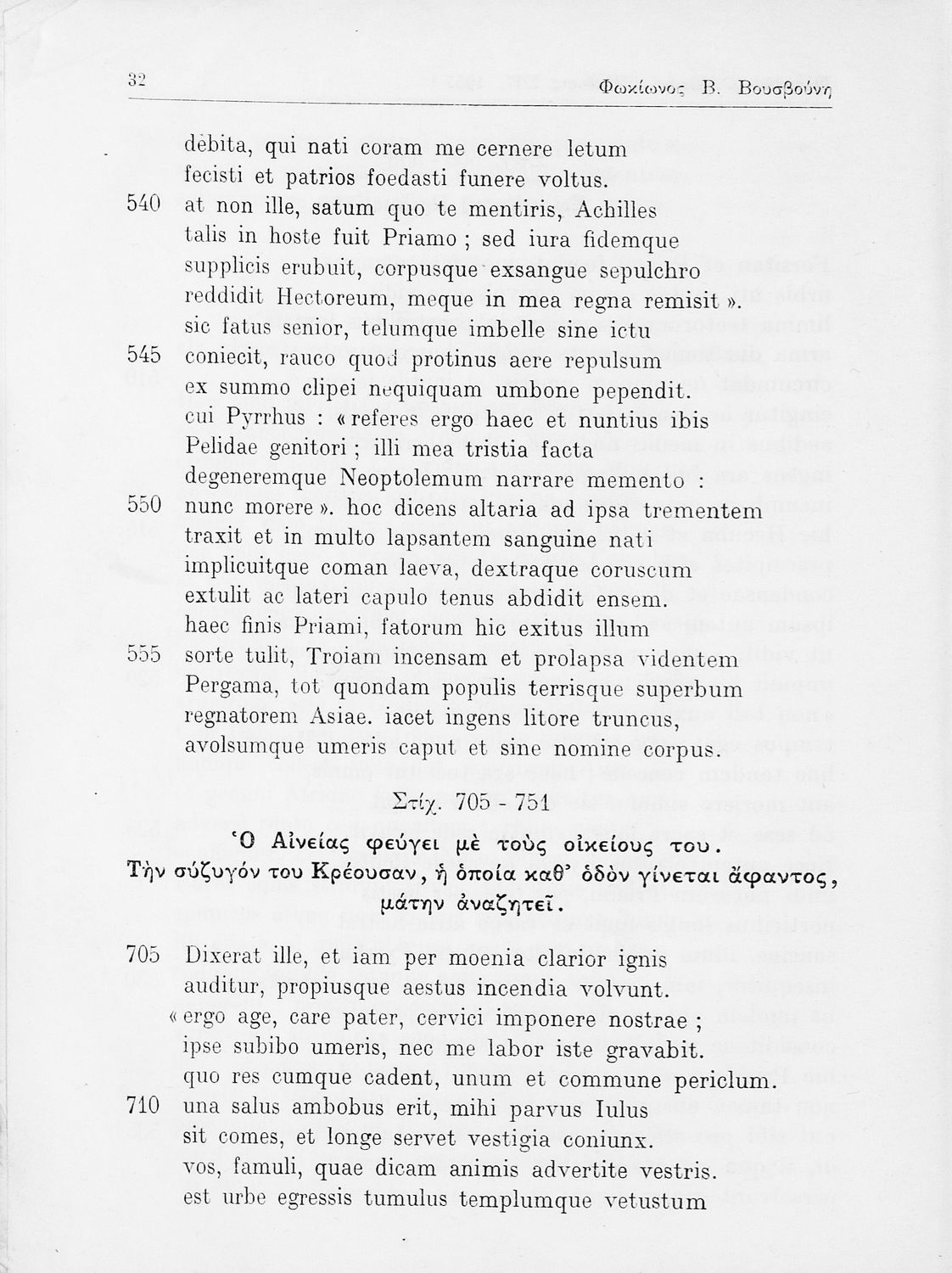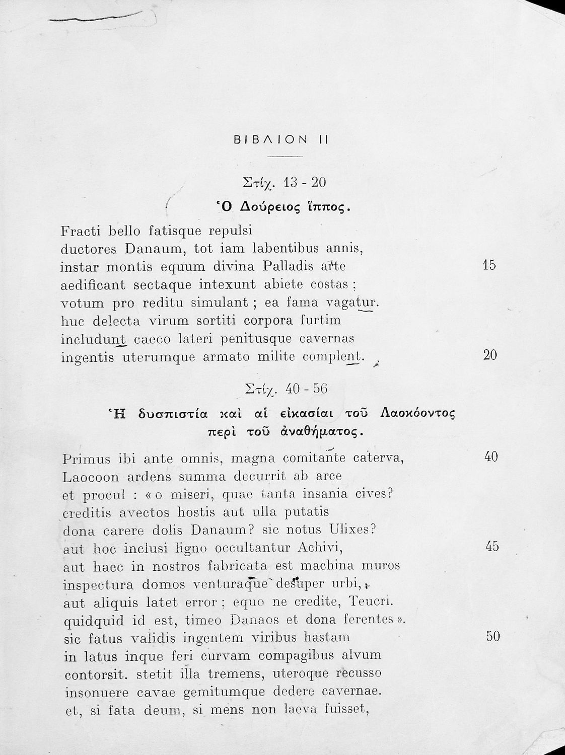 Βαθμίδα εκπαίδευσης: Δευτεροβάθμια Μάθημα: Λατινικά Γλώσσα: Απλή καθαρεύουσα Παρουσίαση περιεχομένου: Σχολικό εγχειρίδιο Λατινικών που περιέχει αποσπάσματα από έργα τριών Λατίνων συγγραφέων, βιογραφικά σημειώματα των συγγραφέων, εισαγωγικά σχόλια, και ερμηνευτικές παρατηρήσεις. |