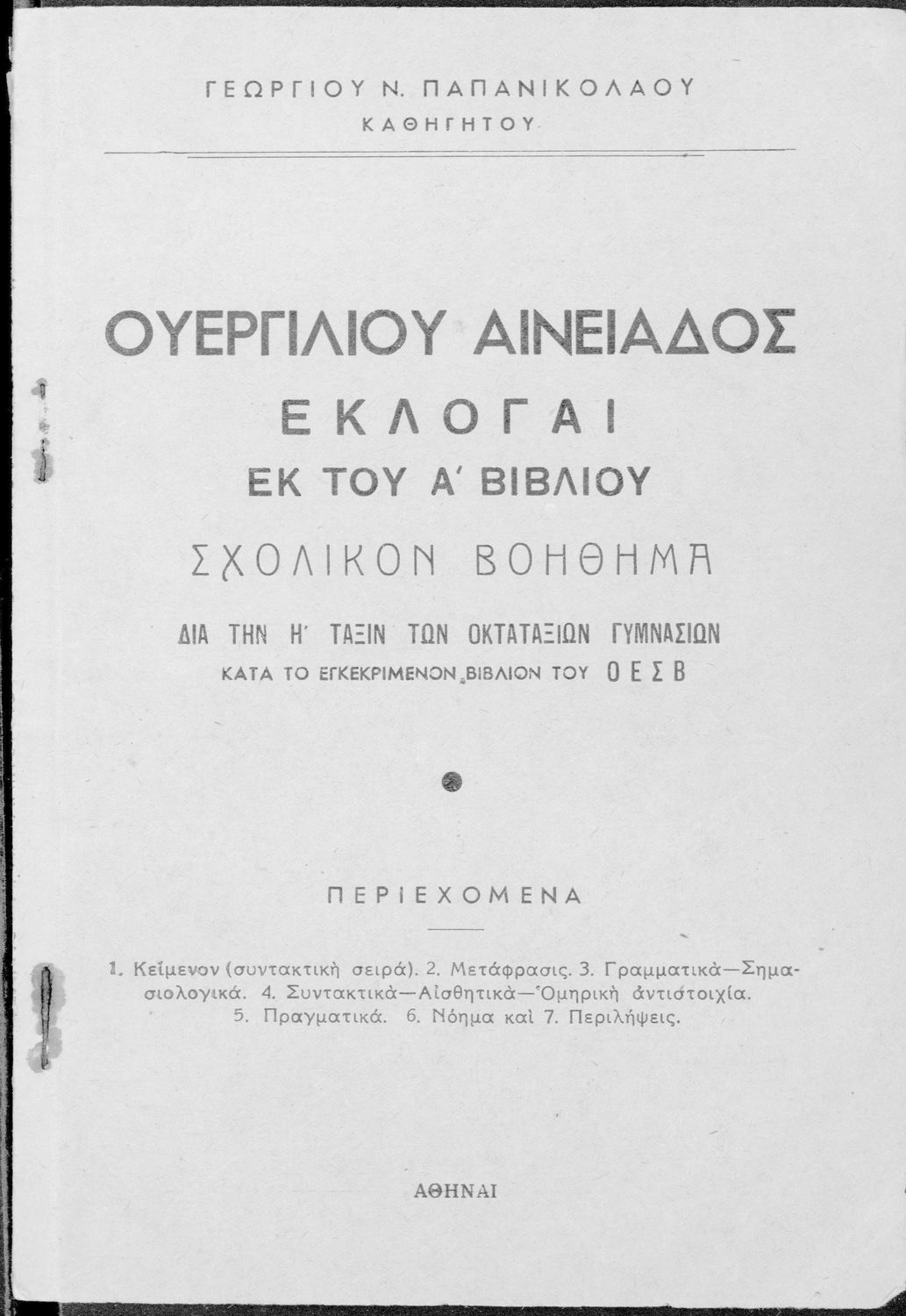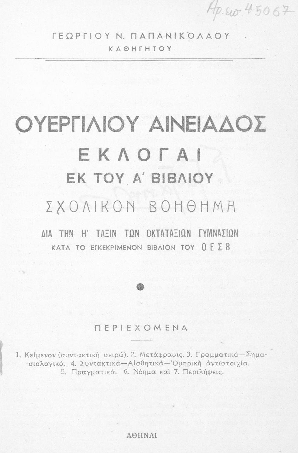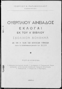 Κωδικός αναγνώρισης: 01-45067 Τίτλος: Ουεργιλίου Αινειάδος Εκλογαί εκ του Α΄ βιβλίου Σχολικόν βοήθημα δια την Η΄ τάξιν των Οκταταξίων Γυμνασίων Συγγραφέας: Πόπλιος Βιργίλιος Μάρων (P. Vergilius Maro), Γεώργιος Ν. Παπανικολάου (μετάφραση/σχόλια) Μέγεθος και υπόστρωμα: Μαθητικό βοήθημα, 20εκ., μαλακό εξώφυλλο, 56 σελίδες. |