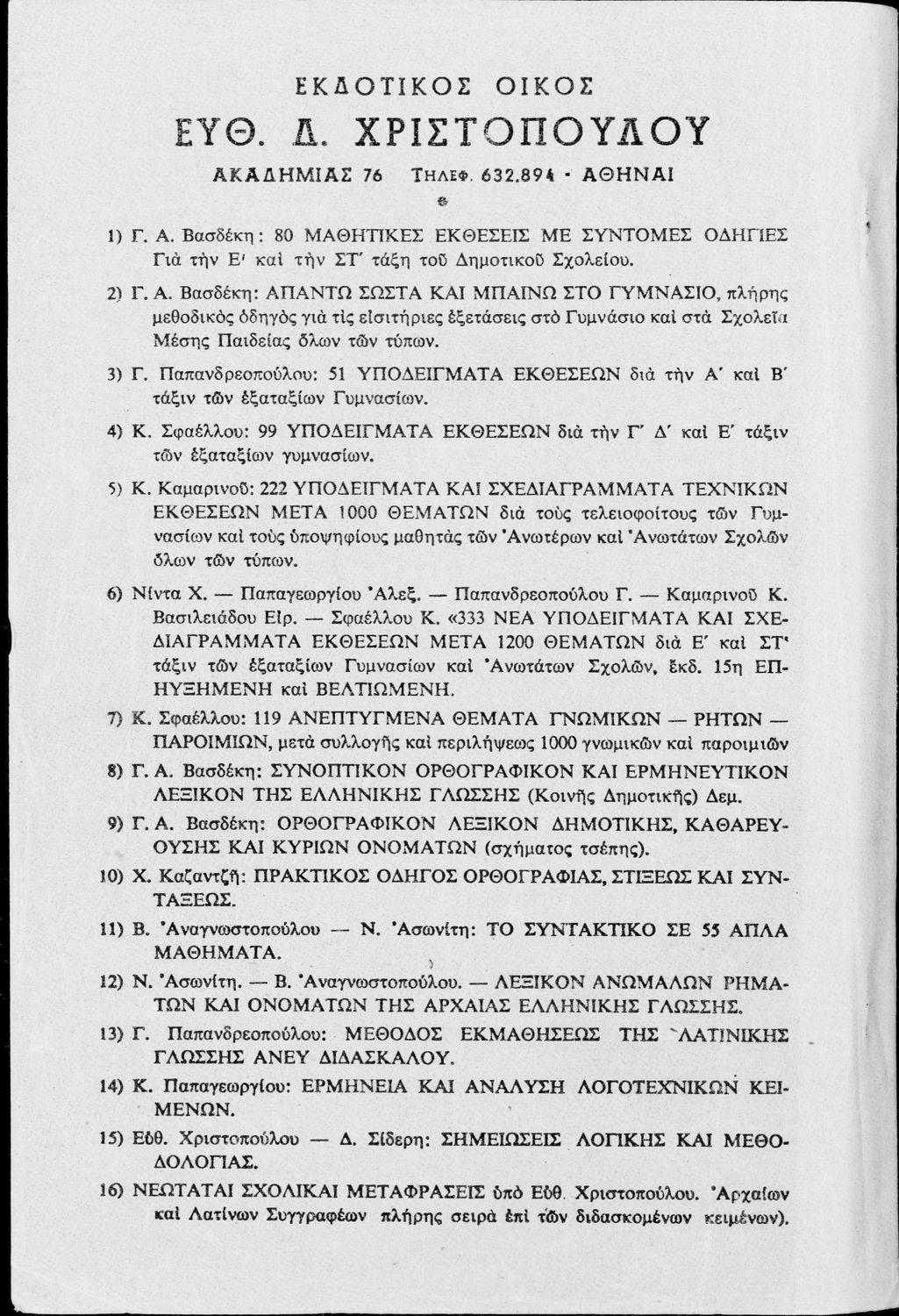 Μαθητικό βοήθημα Νέων Ελληνικών για τις Γ΄, Δ΄, Ε΄ Εξαταξίων Γυμνασίων και Εμπορικών Σχολών που περιλαμβάνει υποδείγματα εκθέσεων, περιγραφές, διηγήσεις, επιστολές, αναλύσεις λογοτεχνικών έργων, σχεδιαγράμματα