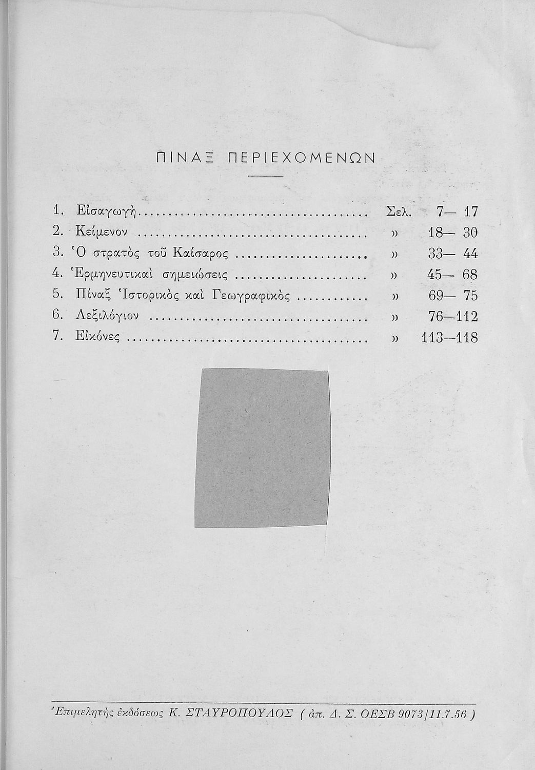 Σχολικό εγχειρίδιο Λατινικών που περιέχει αποσπάσματα από τα απομνημονεύματα του Ιούλιου Καίσαρα, σύντομο βιογραφικό σημείωμα, εισαγωγή στο έργο και πραγματολογικά και γλωσσικά σχόλια. Ο συγγραφέας ήταν καθηγητής της Λατινικής Φιλολογίας στο Πανεπιστήμιο Αθηνών.