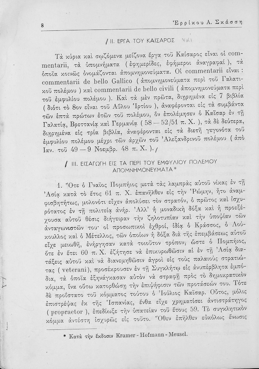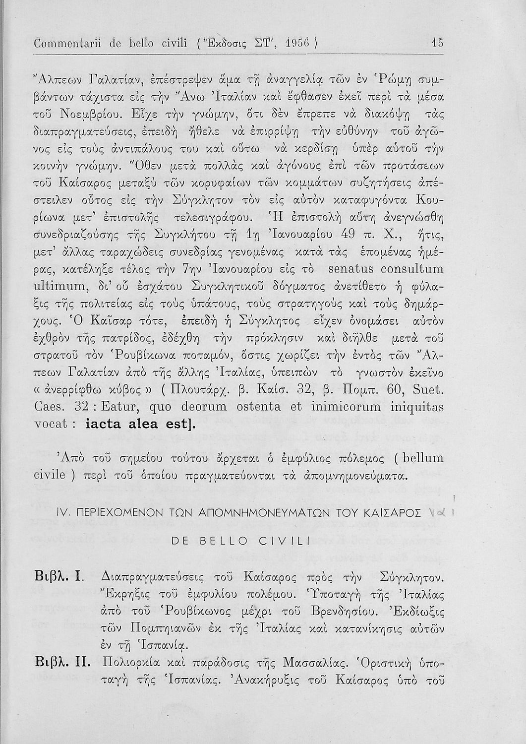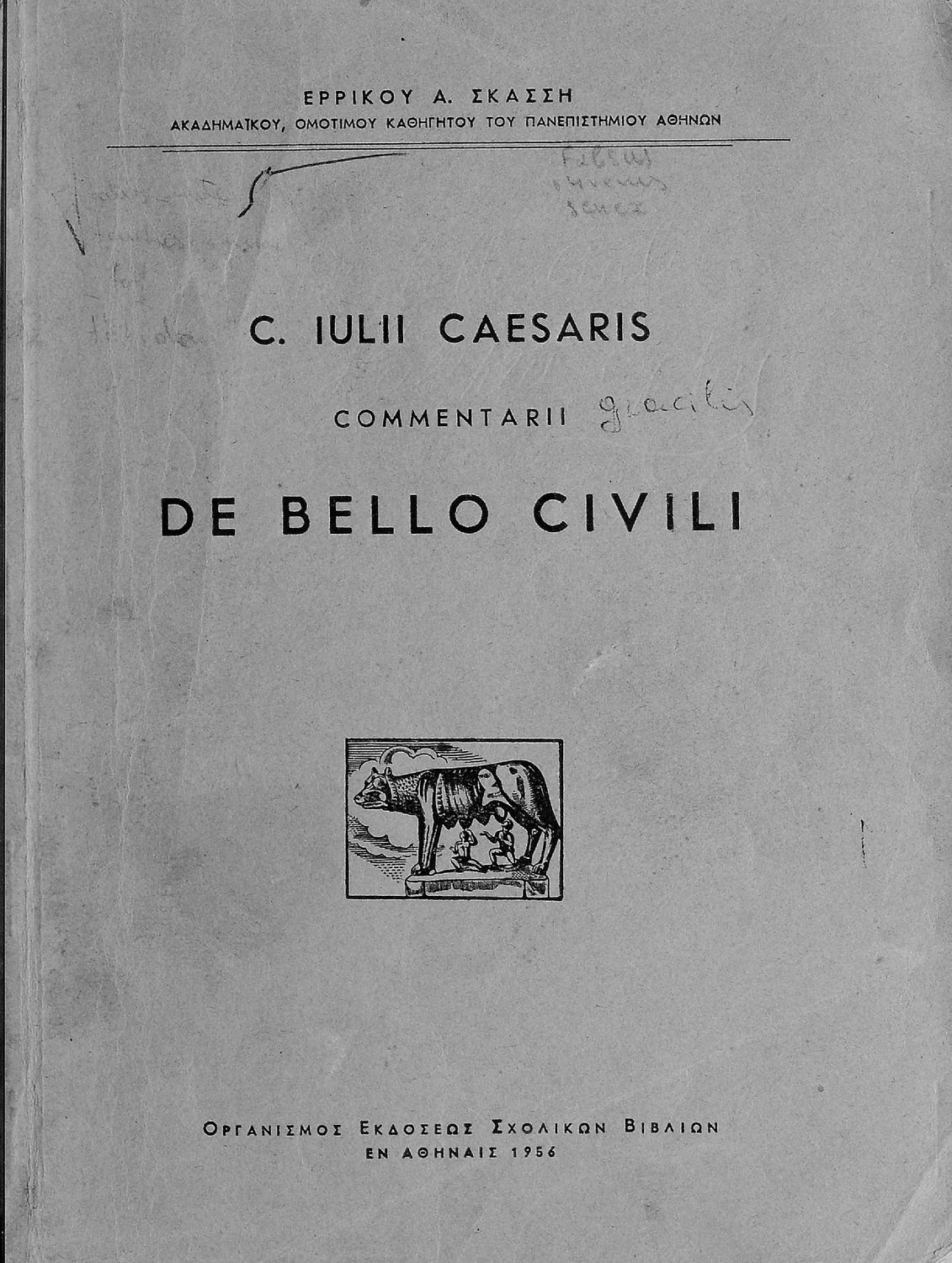 Σχολικό εγχειρίδιο Λατινικών που περιέχει αποσπάσματα από τα απομνημονεύματα του Ιούλιου Καίσαρα, σύντομο βιογραφικό σημείωμα, εισαγωγή στο έργο και πραγματολογικά και γλωσσικά σχόλια. Ο συγγραφέας ήταν καθηγητής της Λατινικής Φιλολογίας στο Πανεπιστήμιο Αθηνών.