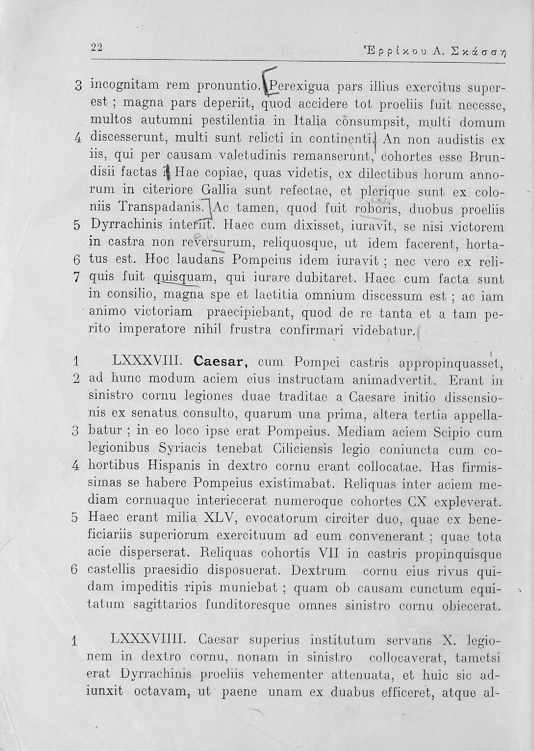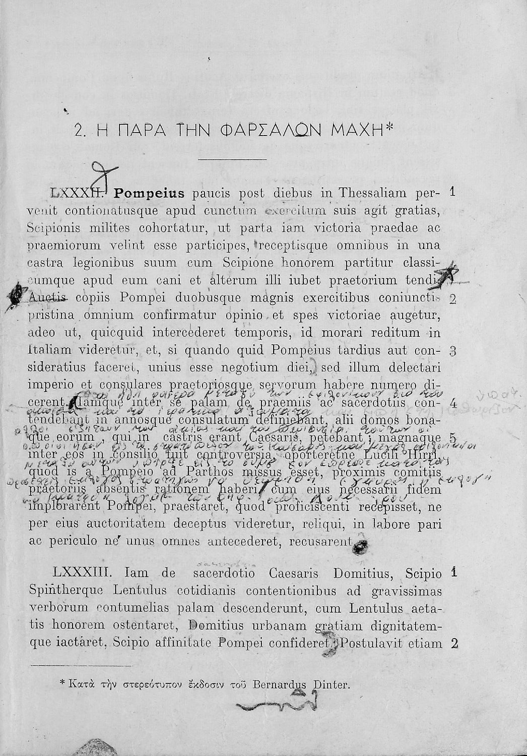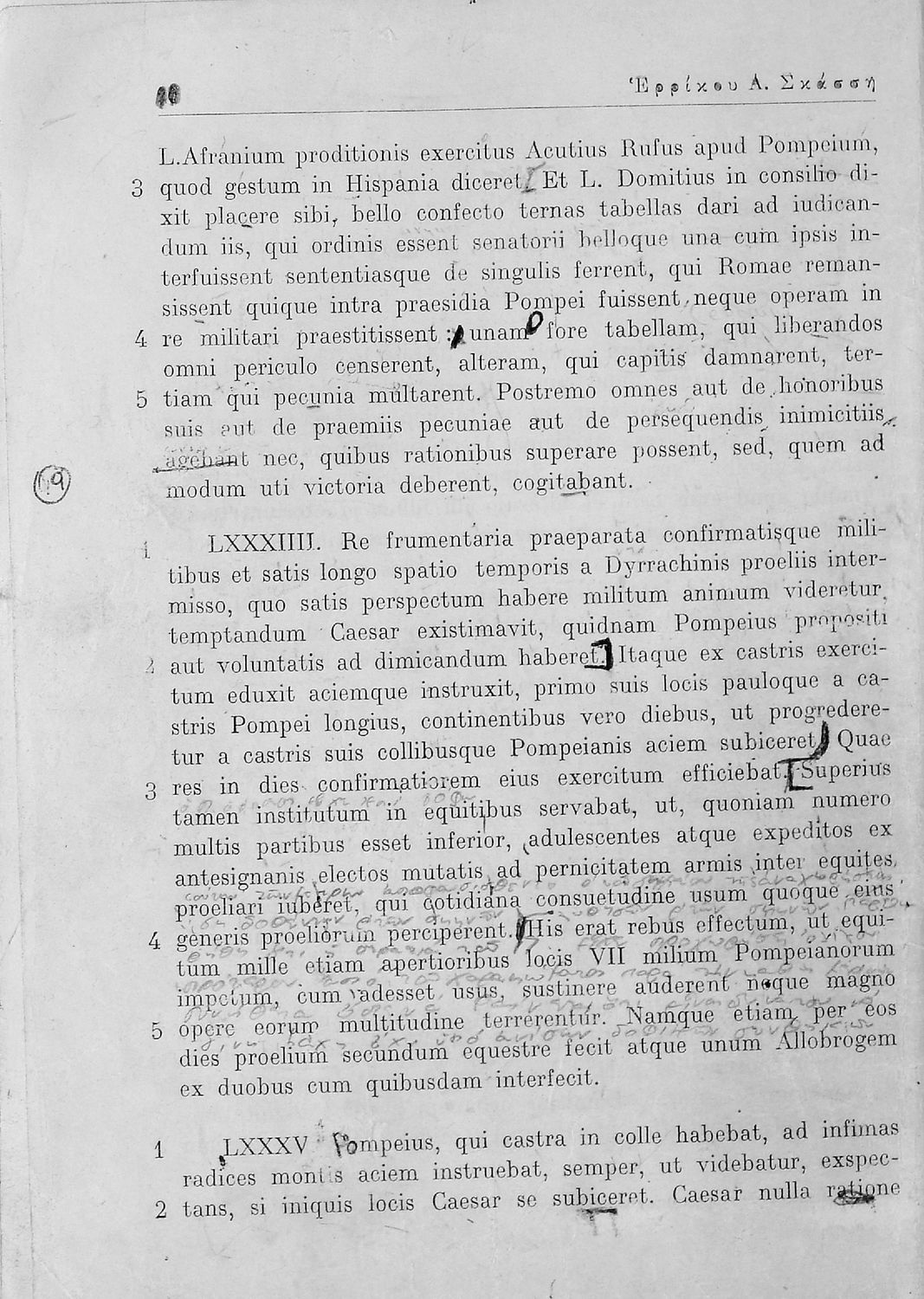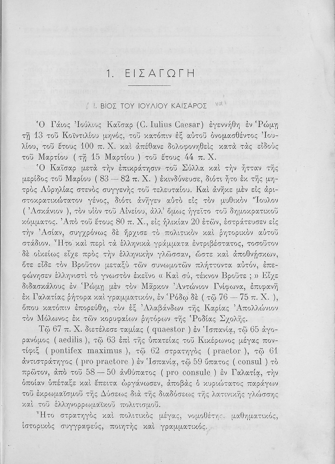 Βαθμίδα εκπαίδευσης: Δευτεροβάθμια Μάθημα: Λατινικά Γλώσσα: Απλή καθαρεύουσα Παρουσίαση περιεχομένου: Σχολικό εγχειρίδιο Λατινικών που περιέχει αποσπάσματα από τα απομνημονεύματα του Ιούλιου Καίσαρα, σύντομο βιογραφικό σημείωμα, εισαγωγή στο έργο και πραγματολογικά και γλωσσικά σχόλια. Ο συγγραφέας ήταν καθηγητής της Λατινικής Φιλολογίας στο Πανεπιστήμιο Αθηνών. |