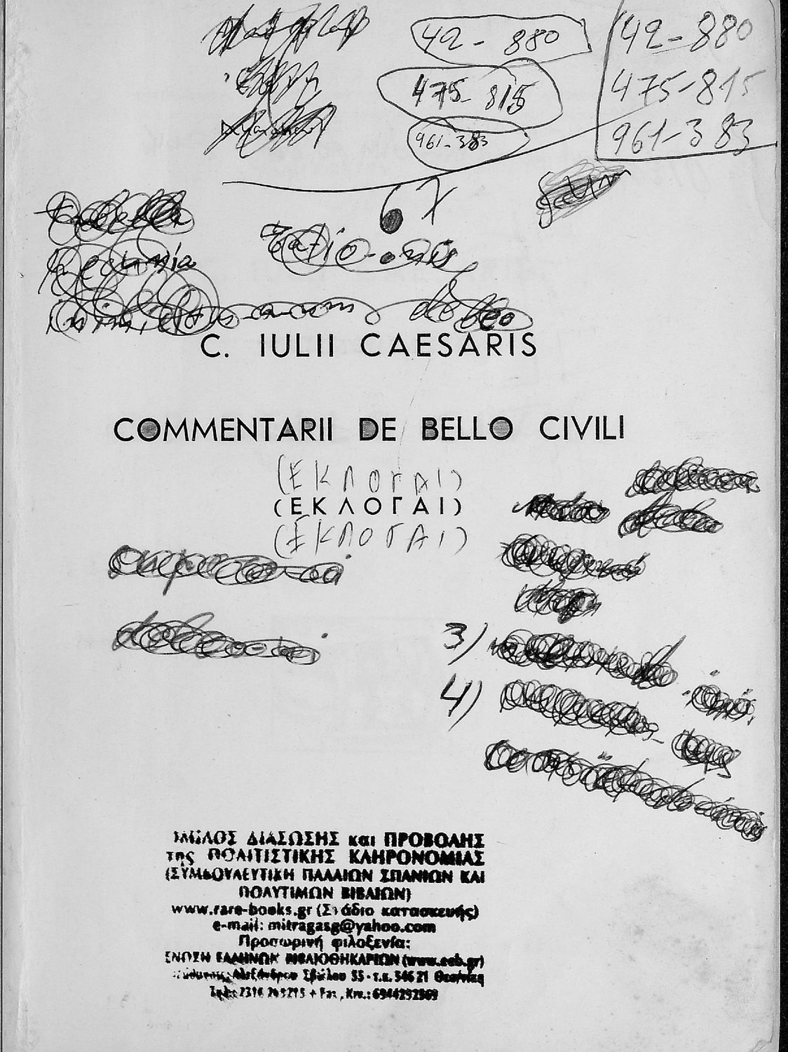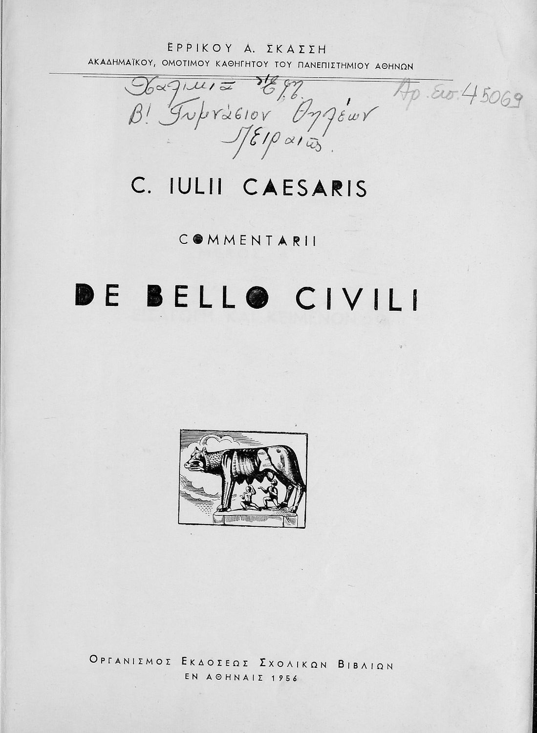 Κωδικός αναγνώρισης: 01-45069 Τίτλος: C. Iulii Caesaris Commentarii de bello civili Συγγραφέας: Γ. Ιούλιος Καίσαρας (C. Julius Caesar), Ερρίκος Σκάσσης (εισαγωγή, σχόλια) Μέγεθος και υπόστρωμα: Σχολικό εγχειρίδιο, 20εκ., μαλακό εξώφυλλο, 112 σελίδες. Σκίτσα και χάρτες (ασπρόμαυρα). |