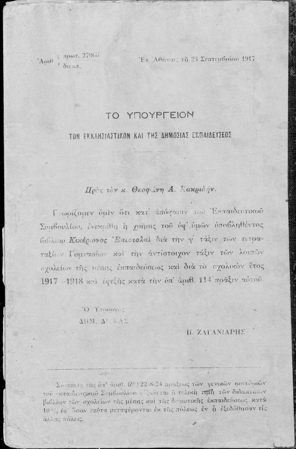 Μάρκου Τυλλίου Κικέρωνος Επιστολαί αι προς διδασκαλίαν εν τοις Γυμνασίοις υπό του Υπουργείου ωρισμέναι (δια την Γ΄ τάξιν)