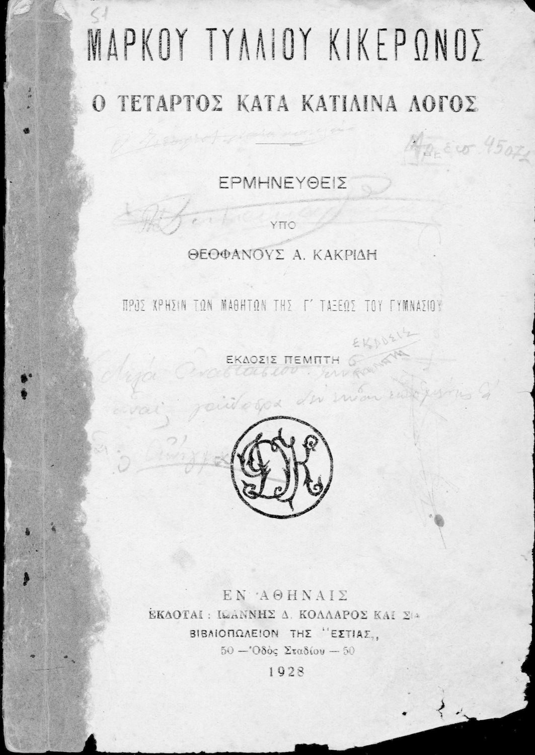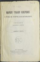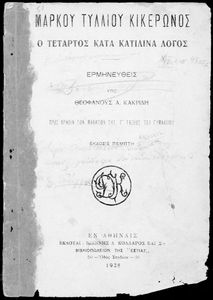 Τίτλος: Μάρκου Τυλλίου Κικέρωνος Ο τέταρτος κατά Κατιλίνα Λόγος προς χρήσιν των μαθητών της Γ΄ τάξεως του Γυμνασίου