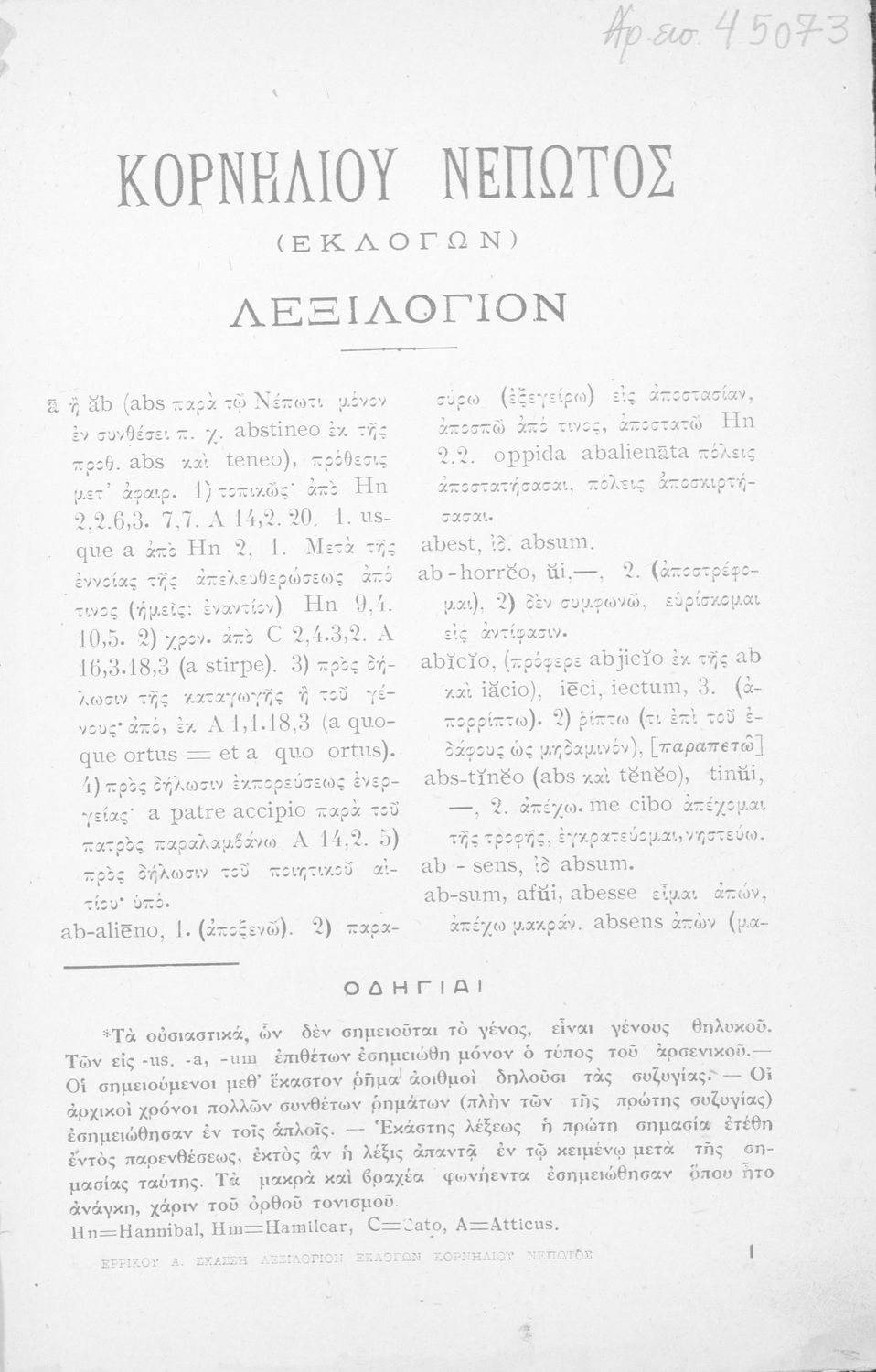 Κωδικός αναγνώρισης: 01-45073 Τίτλος: Λεξιλόγιον Κορνηλίου Νέπωτος (Εκλογών) Συγγραφέας: Ερρίκος Σκάσσης Μέγεθος και υπόστρωμα: Σχολικό εγχειρίδιο, 21εκ., μαλακό εξώφυλλο, 55 σελίδες. |