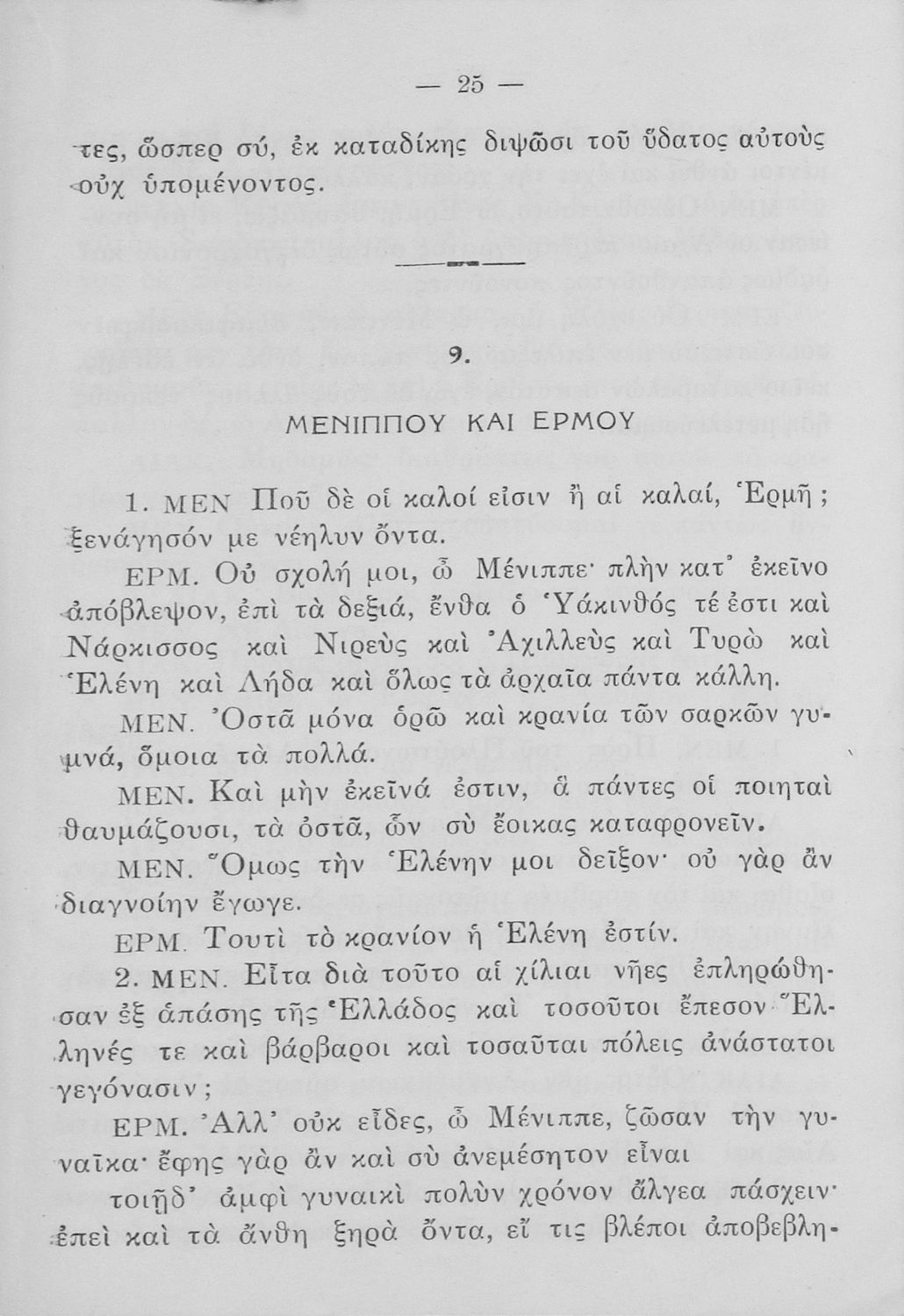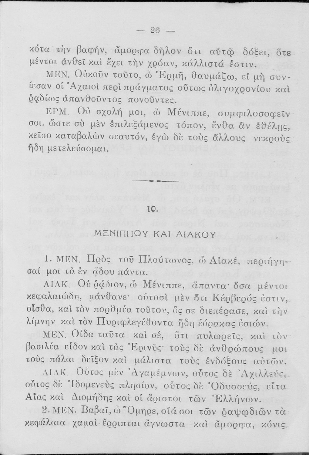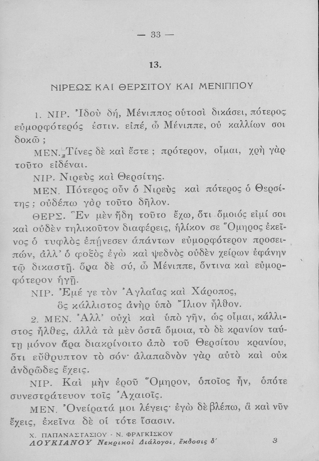 Σχολικό εγχειρίδιο Αρχαίων Ελληνικών Α΄ Γυμνασίου που περιλαμβάνει εισαγωγή στη ζωή και το έργο του Λουκιανού, αποσπάσματα από του Νεκρικούς διαλόγους και ερμηνευτικές σημειώσεις.