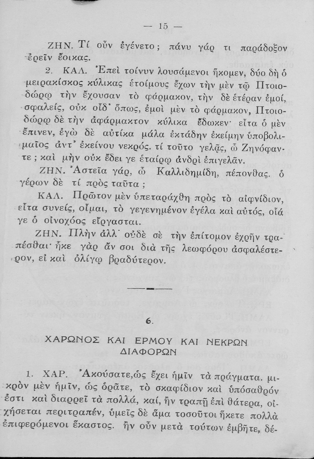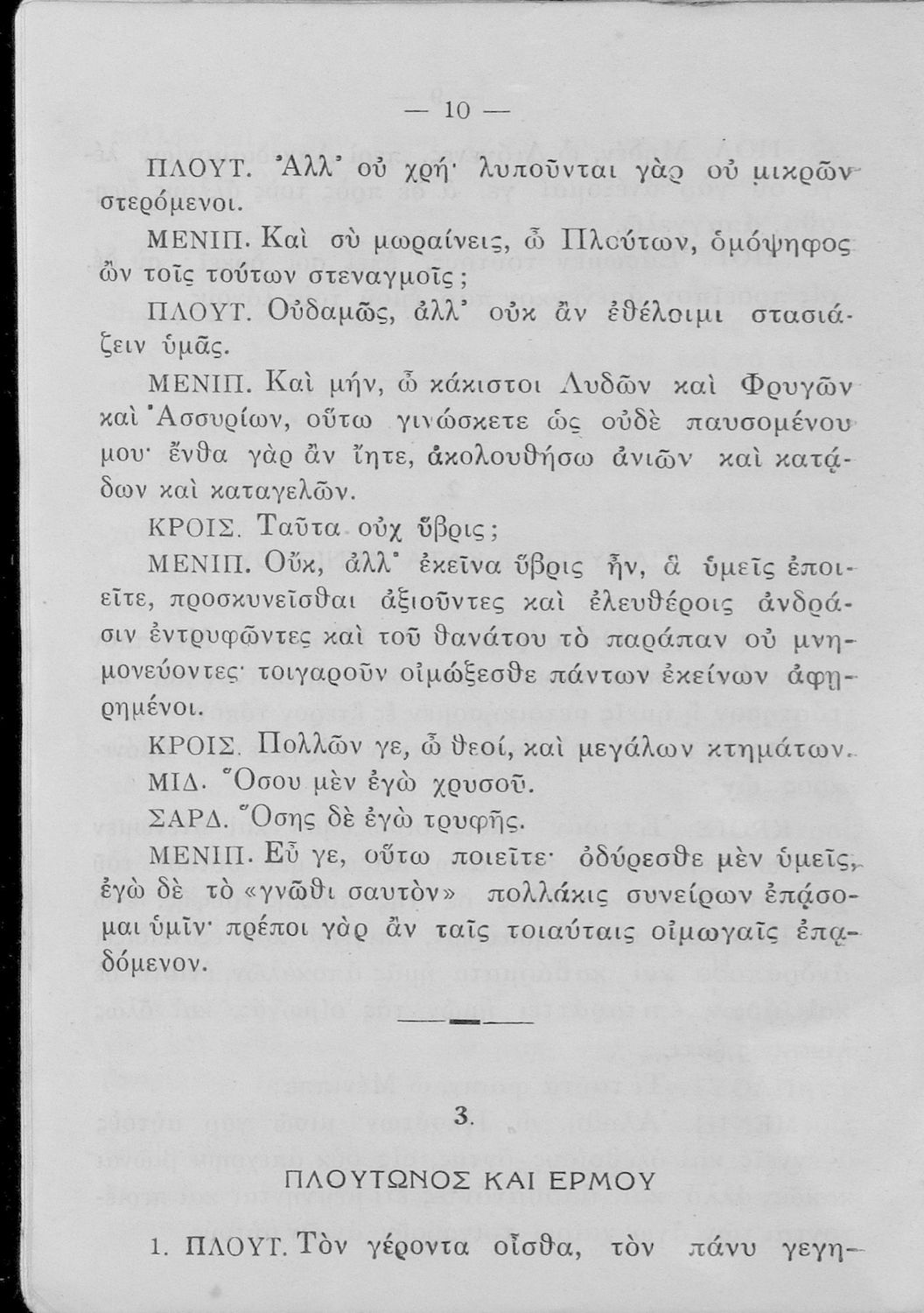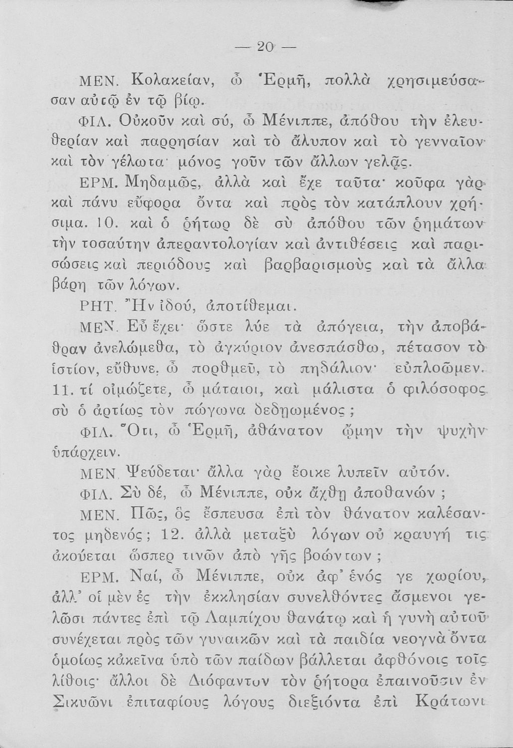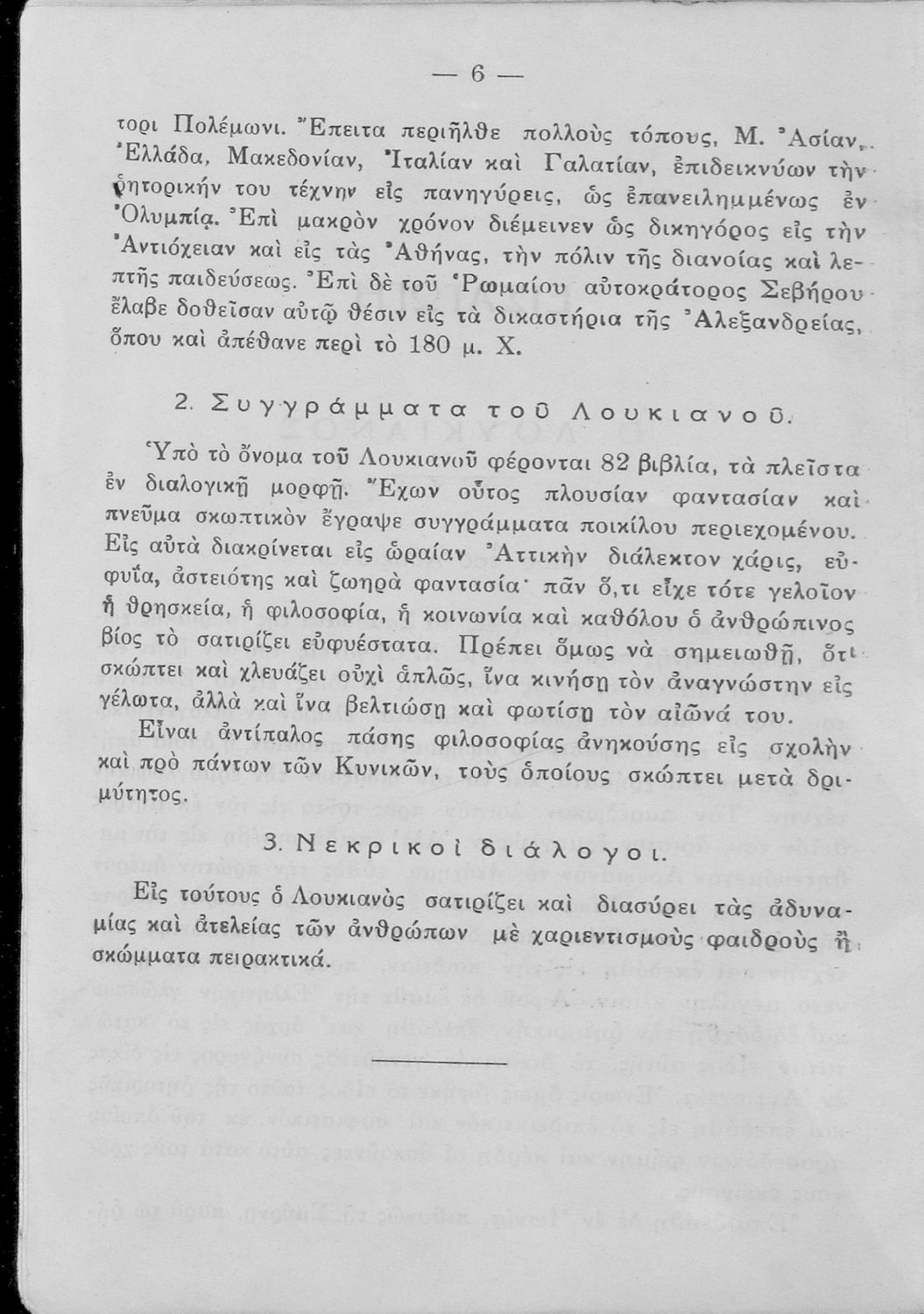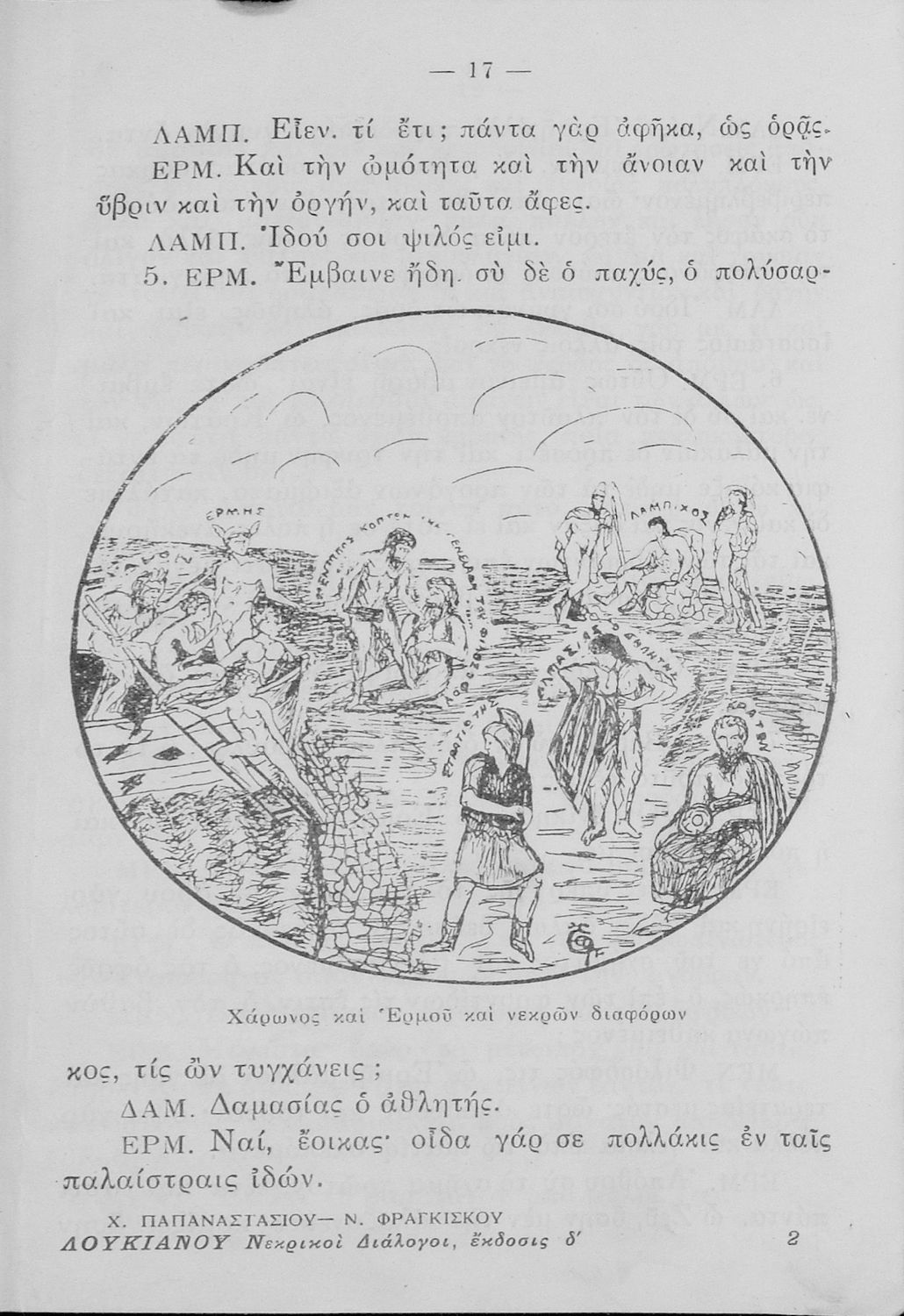 Σχολικό εγχειρίδιο Αρχαίων Ελληνικών Α΄ Γυμνασίου που περιλαμβάνει εισαγωγή στη ζωή και το έργο του Λουκιανού, αποσπάσματα από του Νεκρικούς διαλόγους και ερμηνευτικές σημειώσεις.