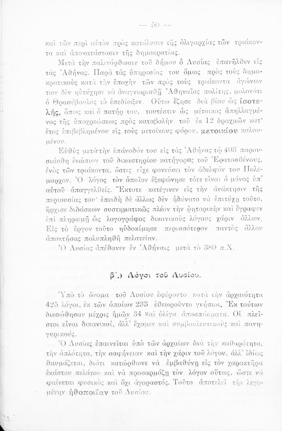 Σχολικό εγχειρίδιο της Γ΄ Γυμνασίου για τα Αρχαία Ελληνικά. Περιλαμβάνει Λόγους του Λυσία, Υπέρ Μαντιθέου, Κατά Εργοκλέους, Περί του σηκού απολογία, Υπέρ του αδυνάτου, Κατά των σιτοπωλών και ερμηνευτικές, πραγματολογικές και λεξιλογικές σημειώσεις.