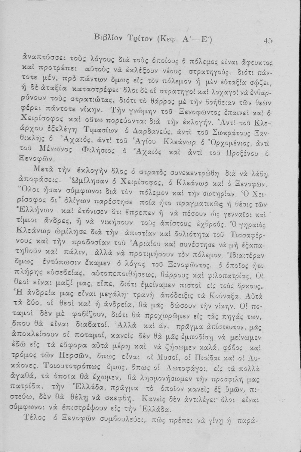 Βαθμίδα εκπαίδευσης: Δευτεροβάθμια Τάξη: Β' Γυμνασίου Μάθημα: Αρχαία Ελληνικά Γλώσσα: Απλή καθαρεύουσα Παρουσίαση περιεχομένου: Σχολικό εγχειρίδιο Αρχαίων Ελληνικών Β΄ Γυμνασίου που περιλαμβάνει αποσπάσματα από το έργο του Ξενοφώντα Κύρου Ανάβασις, εισαγωγικά σχόλια για τη ζωή και το έργο του, ερμηνευτικές και γραμματικές παρατηρήσεις. |