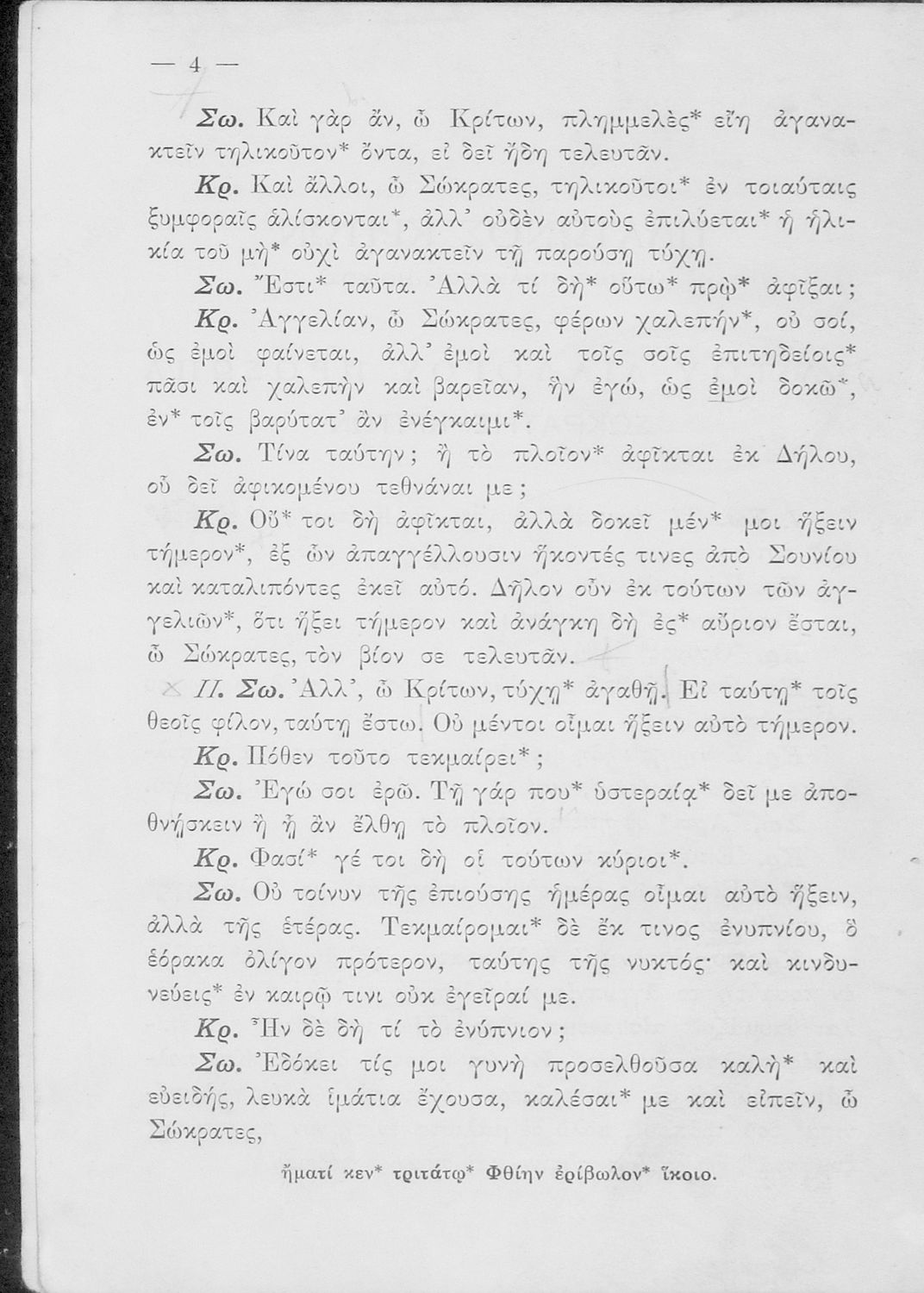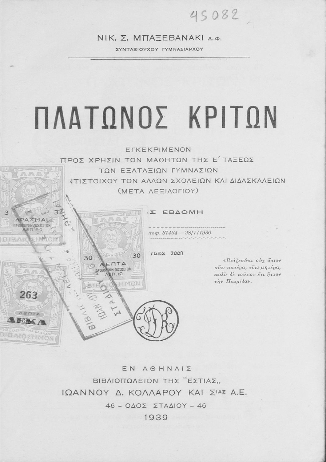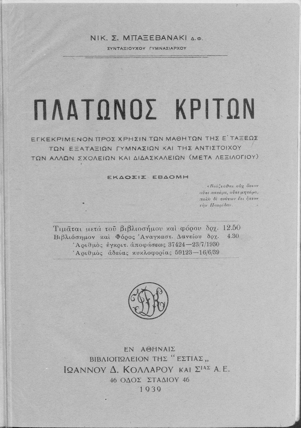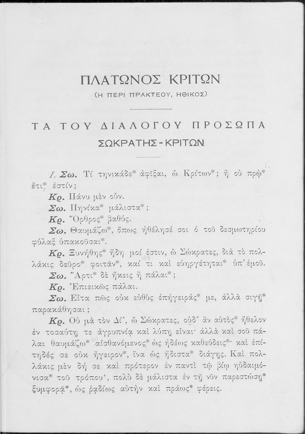 Τίτλος: Πλάτωνος Κρίτων. Προς χρήσιν της Ε΄ Τάξεως των Γυμνασίων