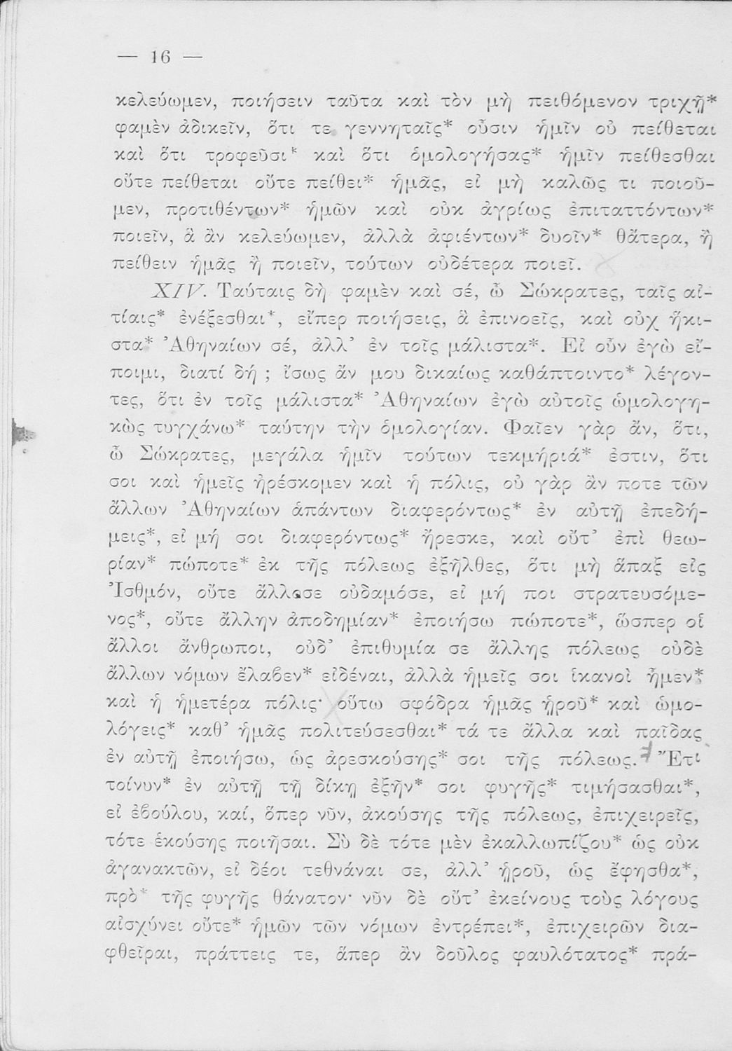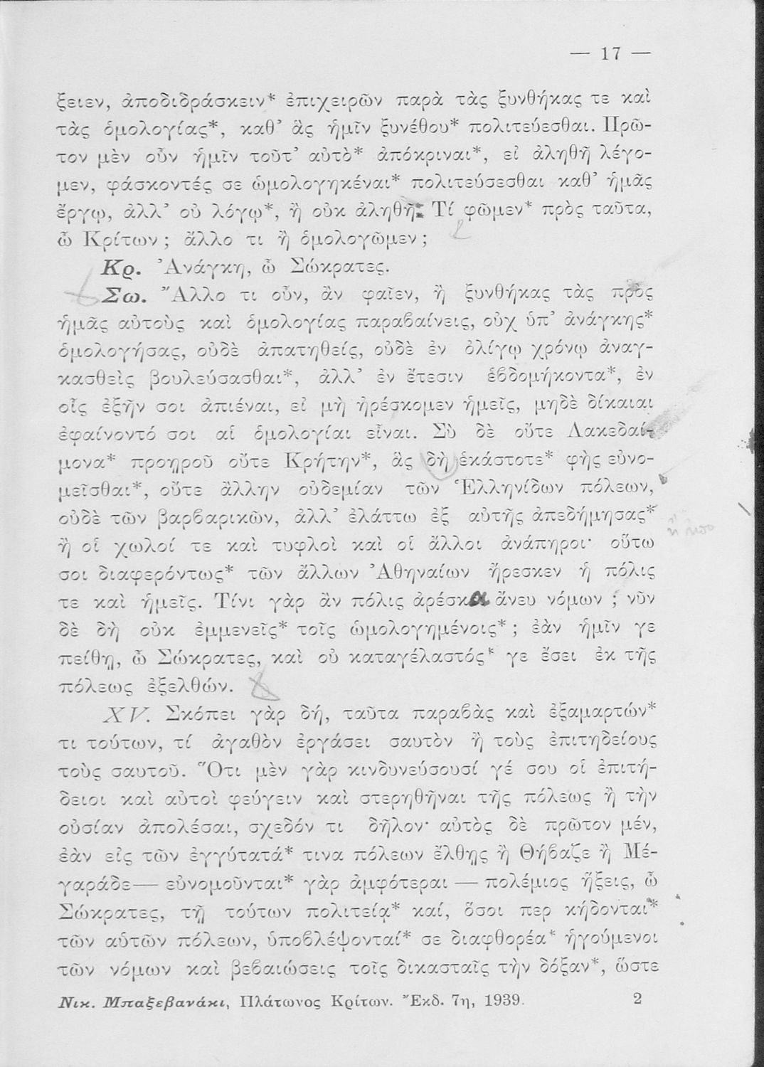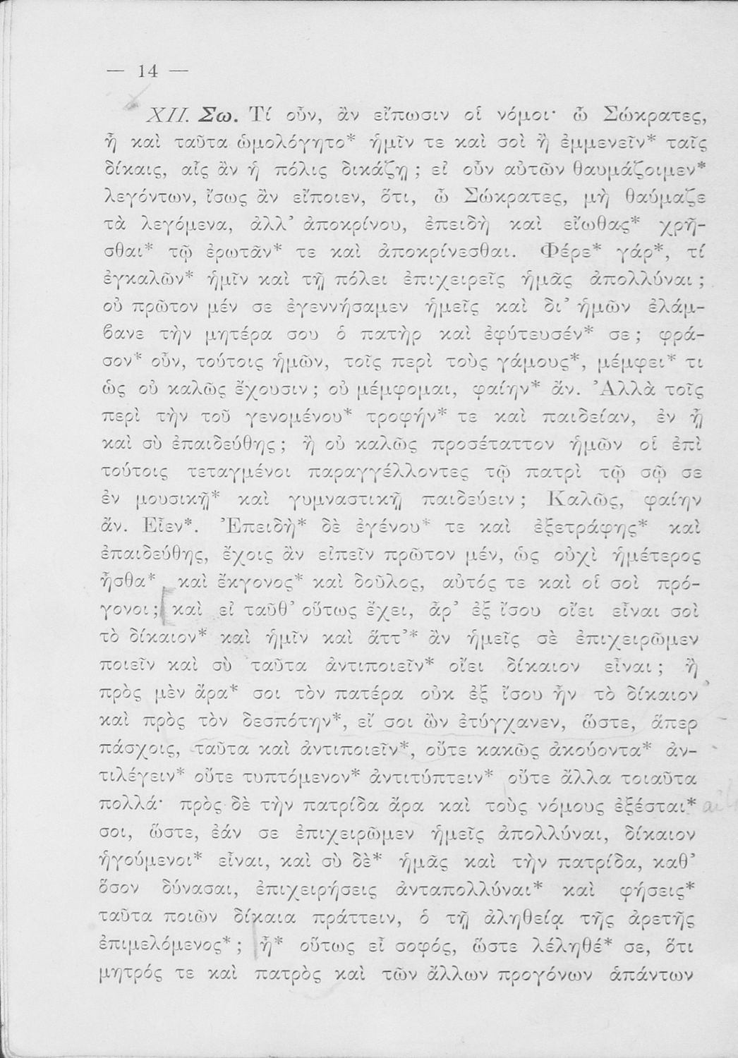 Σχολικό εγχειρίδιο της Ε΄ Γυμνασίου για το μάθημα των Αρχαίων. Περιέχει το πρωτότυπο κείμενο του Πλάτωνα από την απολογία του Κρίτωνα με ερμηνευτικά, πραγματολογικά σχόλια και λεξιλογικές παρατηρήσεις του συγγραφέα.