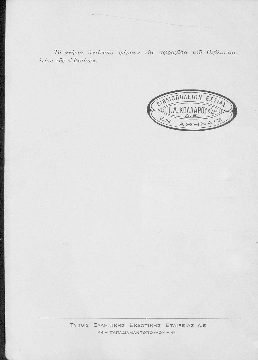 Εκδότης: Ιωάννης Δ. Κολλάρος και ΣΙΑ, Βιβλιοπωλείο της "Εστίας"