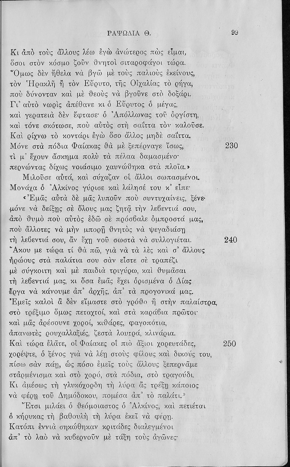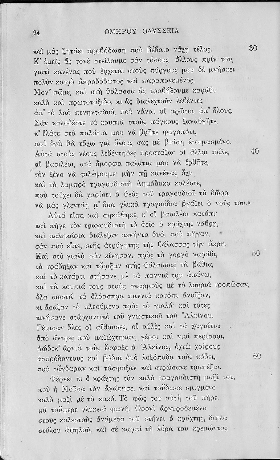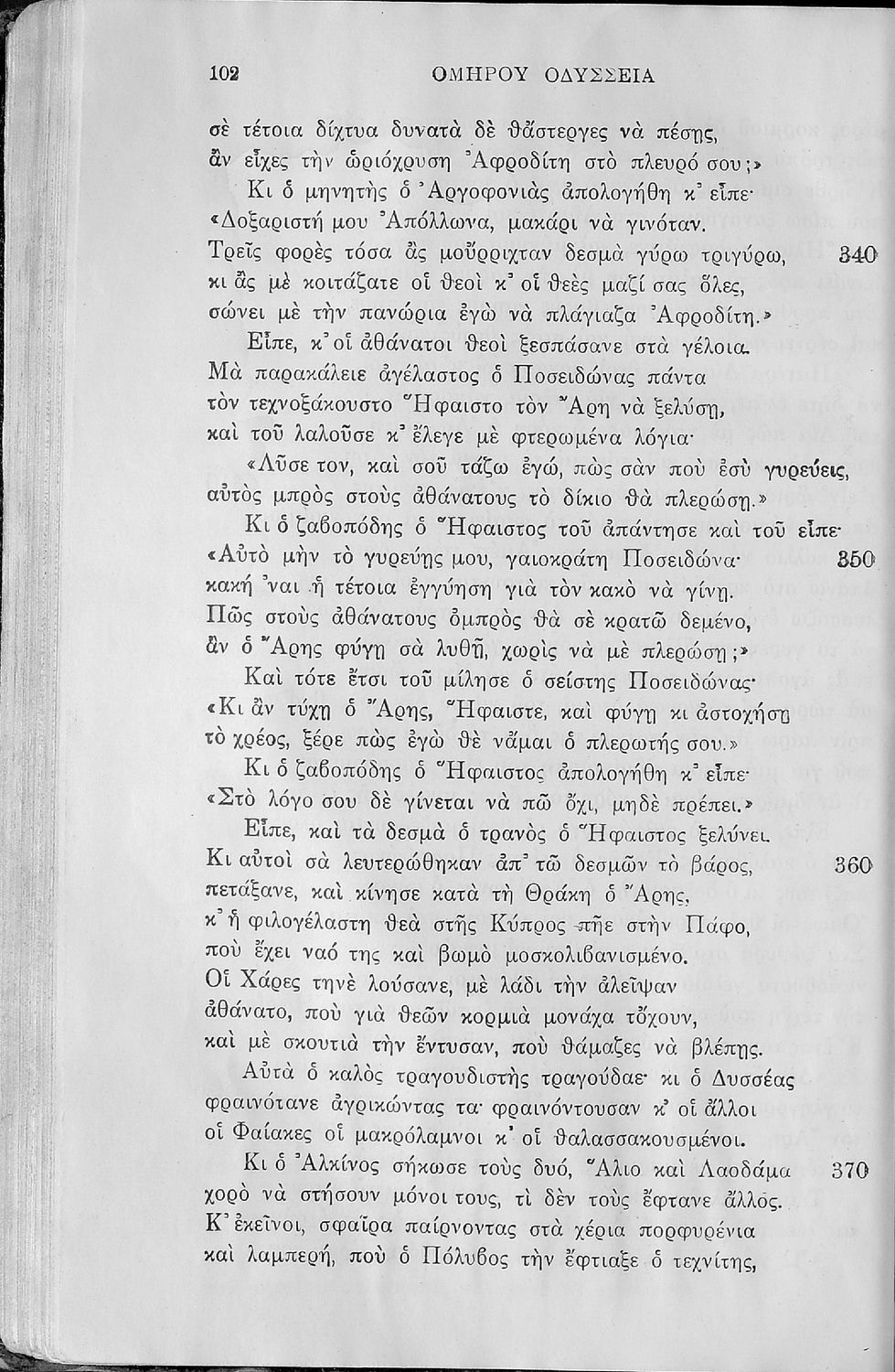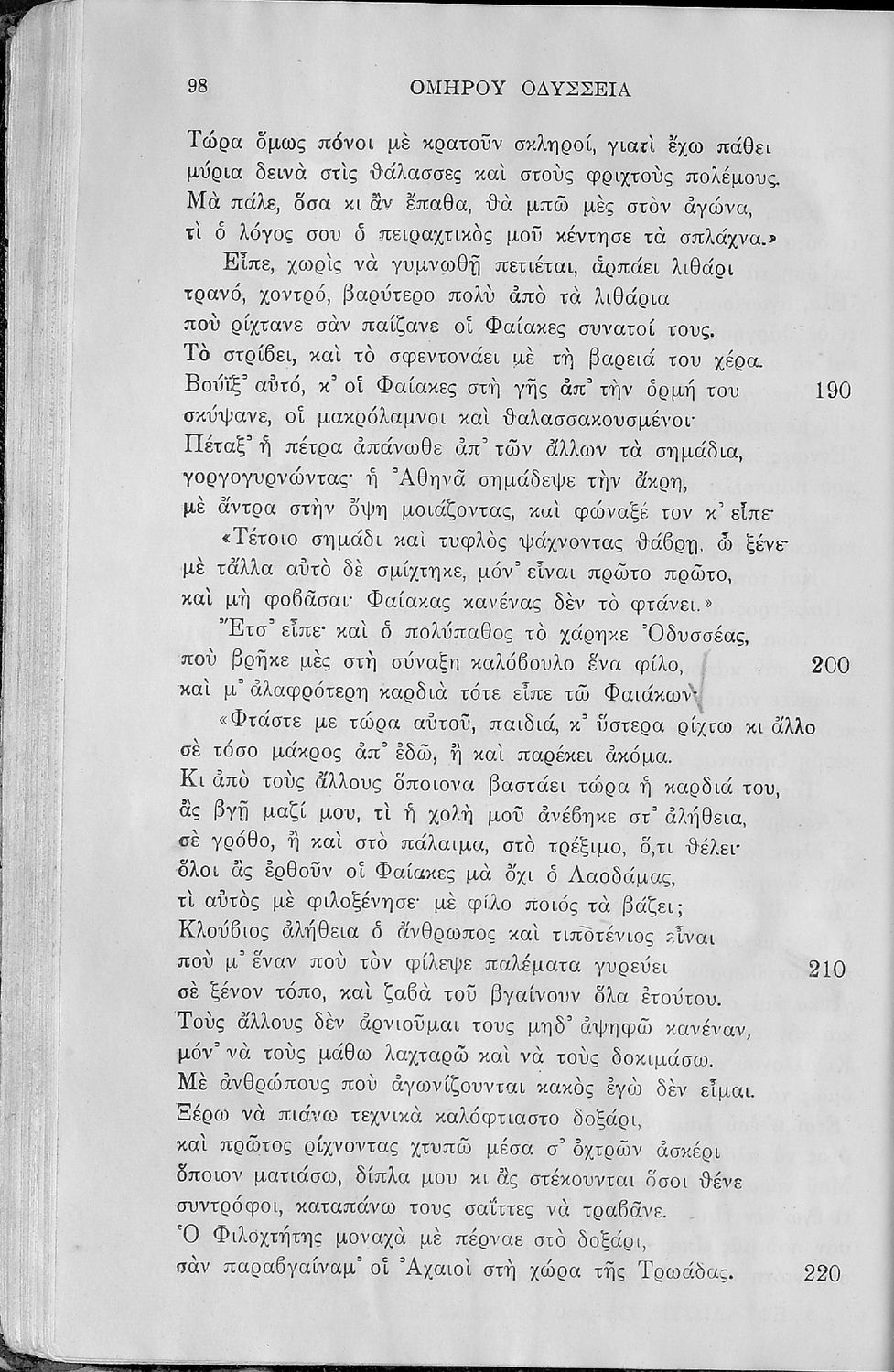 Παρουσίαση περιεχομένου: Σχολικό εγχειρίδιο της Α΄, Β΄, Γ΄ Γυμνασίου για το μάθημα των Αρχαίων Ελληνικών. Περιέχει τις ραψωδίες της Οδύσσειας και ερμηνευτικά, πραγματολογικά σχόλια, καθώς κ και γραμματικές παρατηρήσεις του συγγραφέα. Εγκρίθηκε για μια πενταετία 1932-1937.
