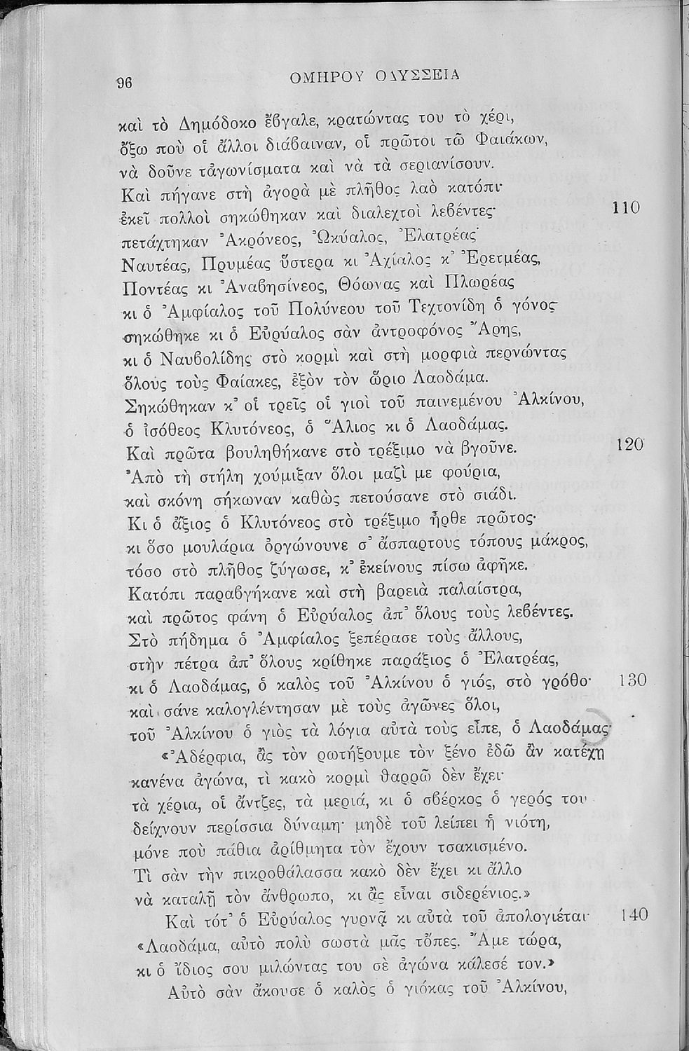 Σχολικό εγχειρίδιο της Α΄, Β΄, Γ΄ Γυμνασίου για το μάθημα των Αρχαίων Ελληνικών. Περιέχει τις ραψωδίες της Οδύσσειας, μετάφραση, ερμηνευτικά και πραγματολογικά σχόλια, καθώς και γραμματικές παρατηρήσεις.