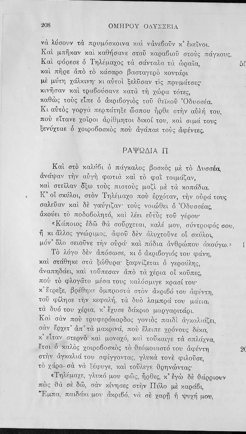 Σχολικό εγχειρίδιο της Α΄, Β΄, Γ΄ Γυμνασίου για το μάθημα των Αρχαίων Ελληνικών. Περιέχει τις ραψωδίες της Οδύσσειας, μετάφραση, ερμηνευτικά και πραγματολογικά σχόλια, καθώς και γραμματικές παρατηρήσεις.