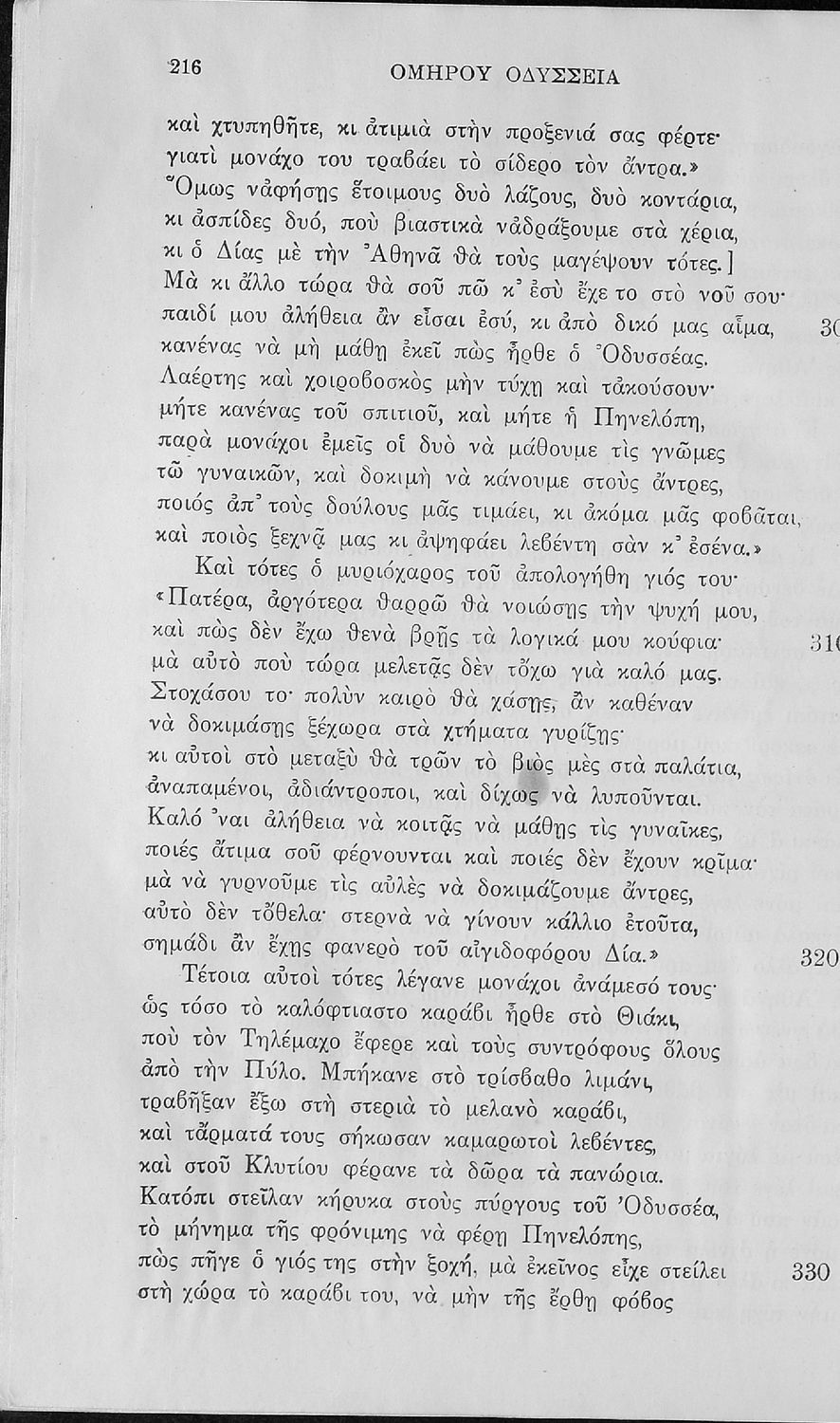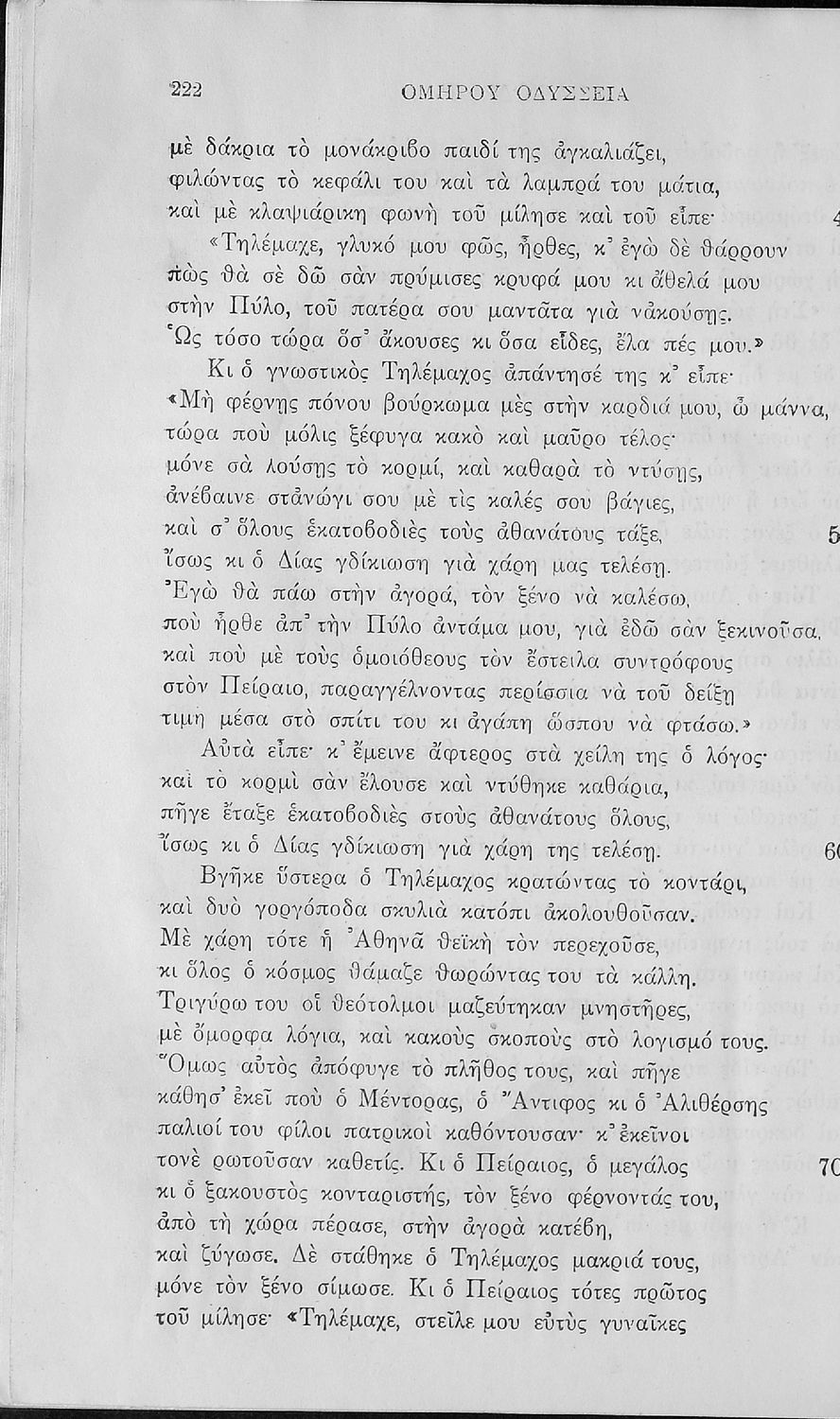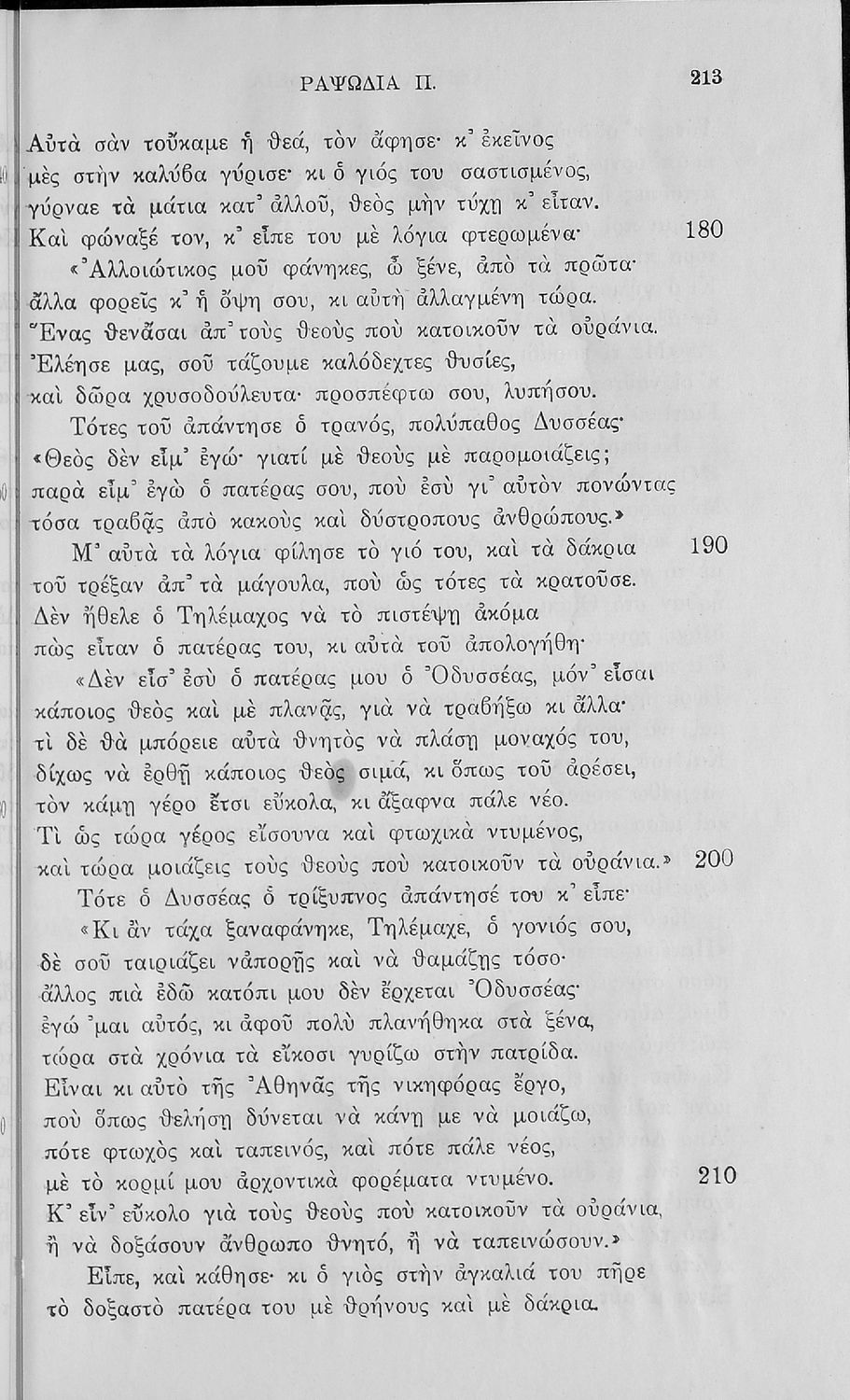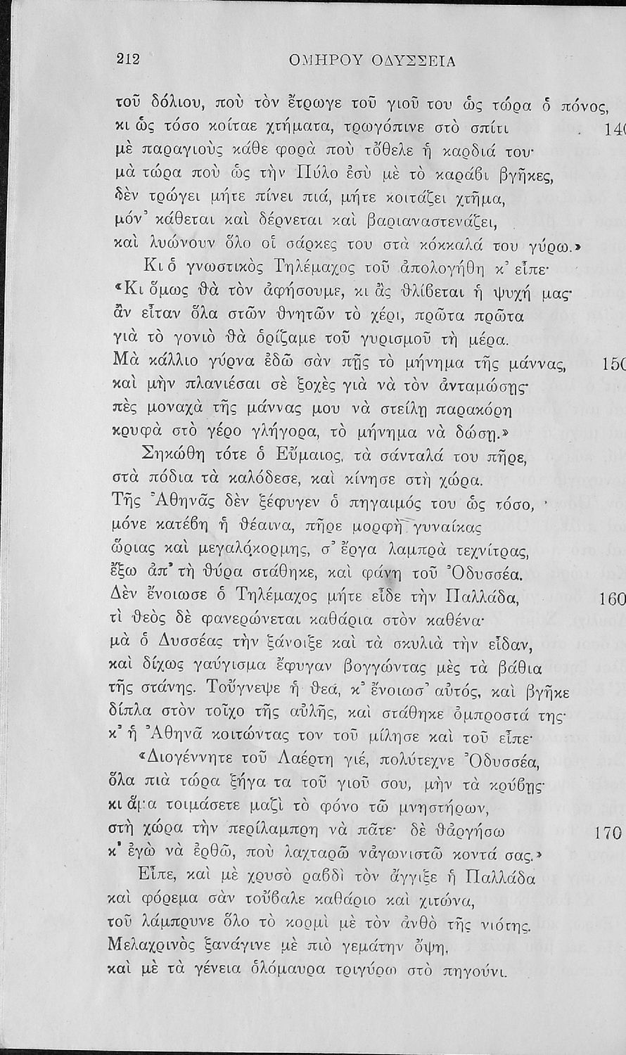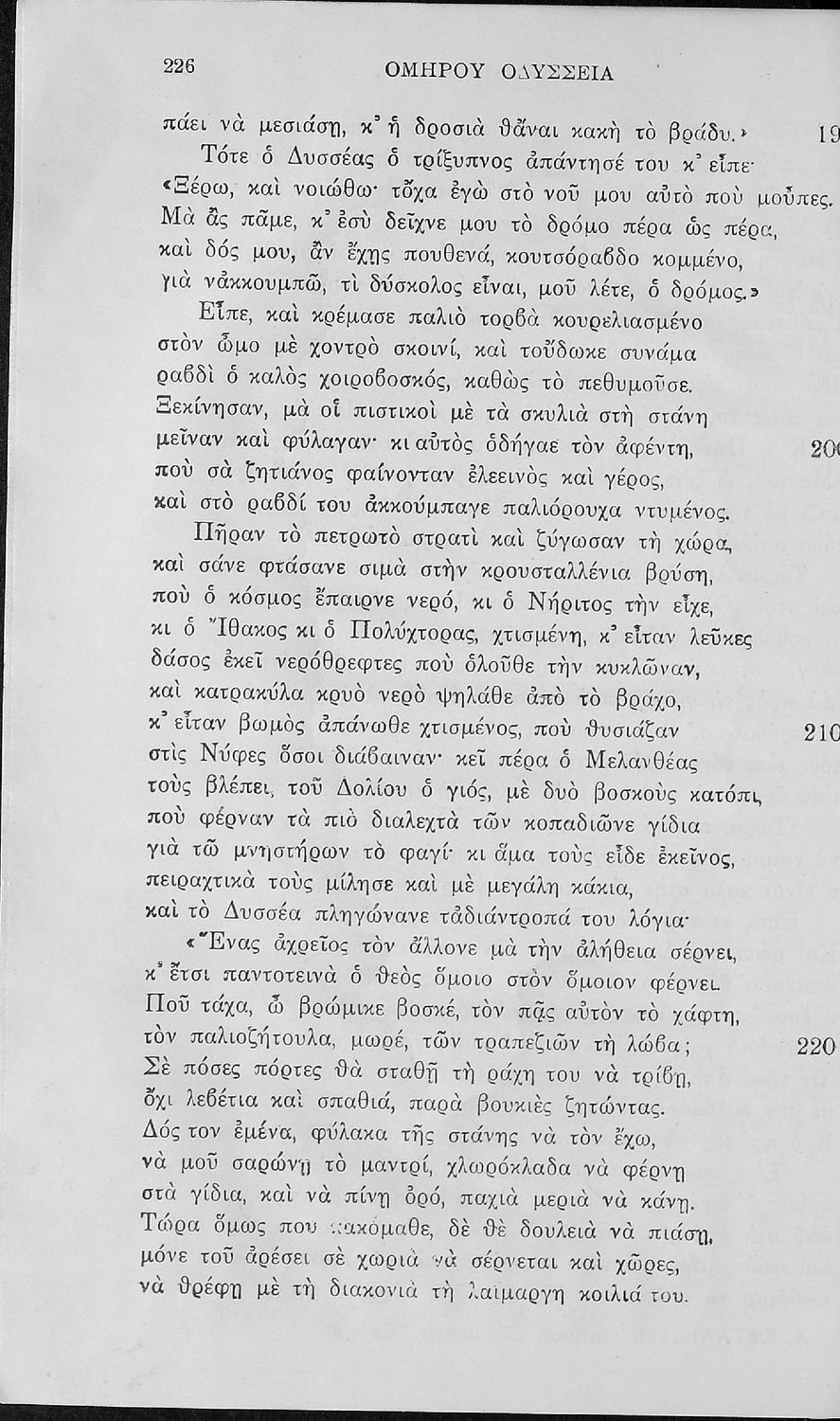 Σχολικό εγχειρίδιο της Α΄, Β΄, Γ΄ Γυμνασίου για το μάθημα των Αρχαίων Ελληνικών. Περιέχει τις ραψωδίες της Οδύσσειας, μετάφραση, ερμηνευτικά και πραγματολογικά σχόλια, καθώς και γραμματικές παρατηρήσεις.