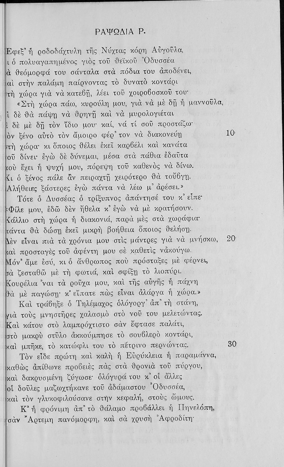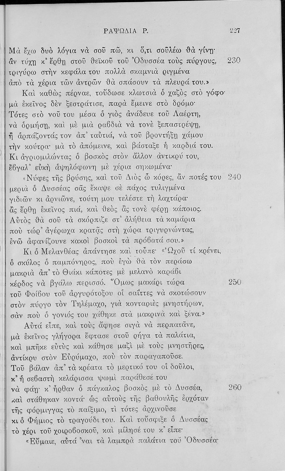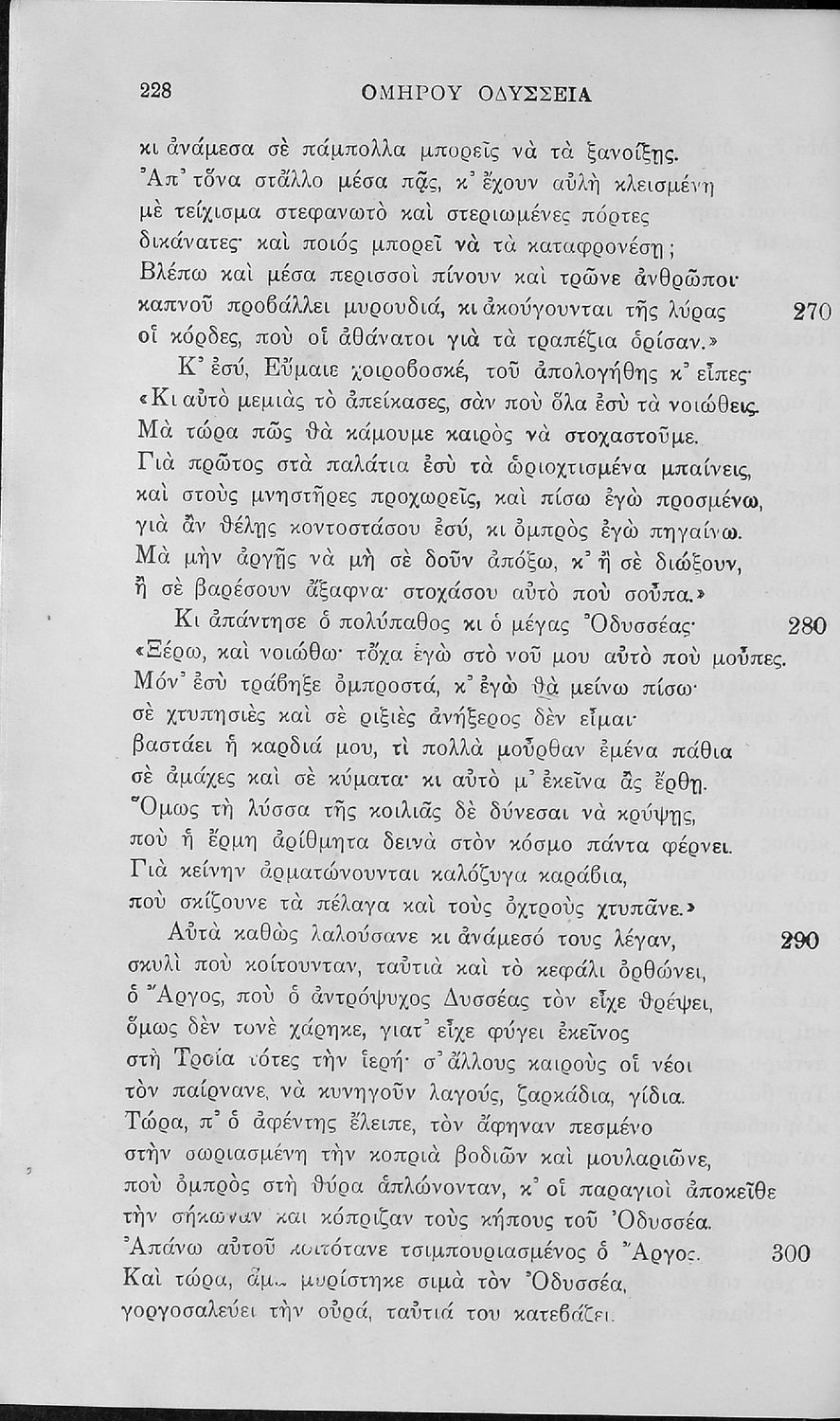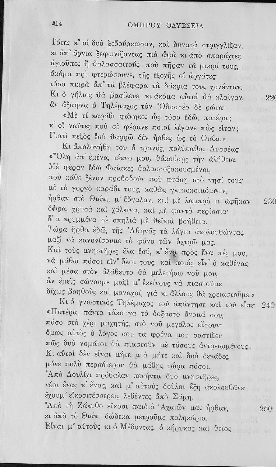 Σχολικό εγχειρίδιο της Α΄, Β΄, Γ΄ Γυμνασίου για το μάθημα των Αρχαίων Ελληνικών. Περιέχει τις ραψωδίες της Οδύσσειας και ερμηνευτικά, πραγματολογικά σχόλια, καθώς κ και γραμματικές παρατηρήσεις του συγγραφέα. Εγκρίθηκε για μια πενταετία 1932-1937.