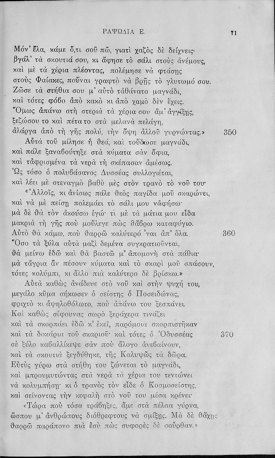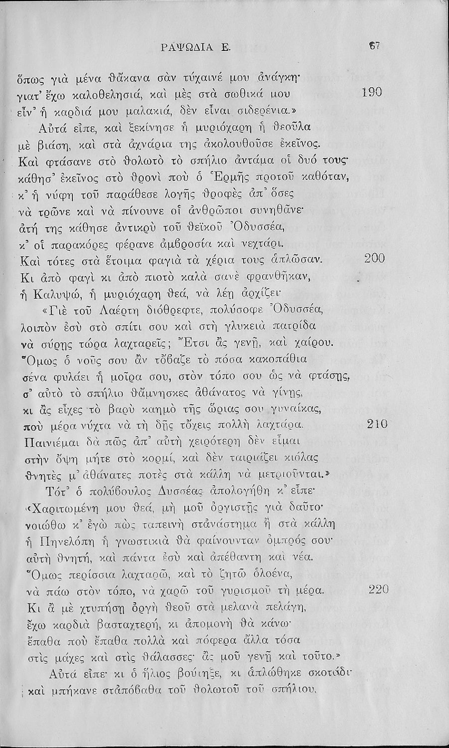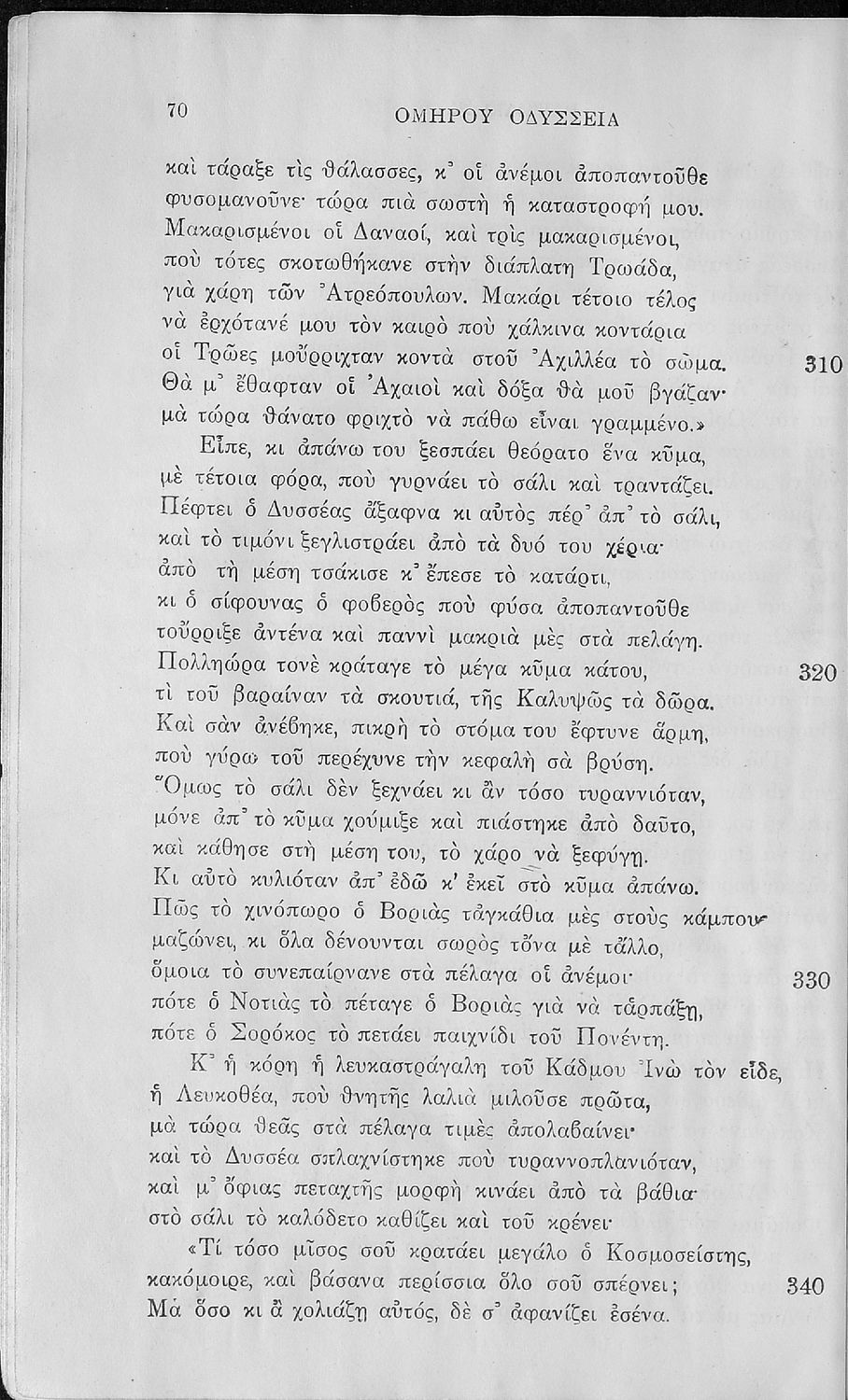 Σχολικό εγχειρίδιο της Α΄, Β΄, Γ΄ Γυμνασίου για το μάθημα των Αρχαίων Ελληνικών. Περιέχει τις ραψωδίες της Οδύσσειας, μετάφραση, ερμηνευτικά και πραγματολογικά σχόλια, καθώς και γραμματικές παρατηρήσεις.