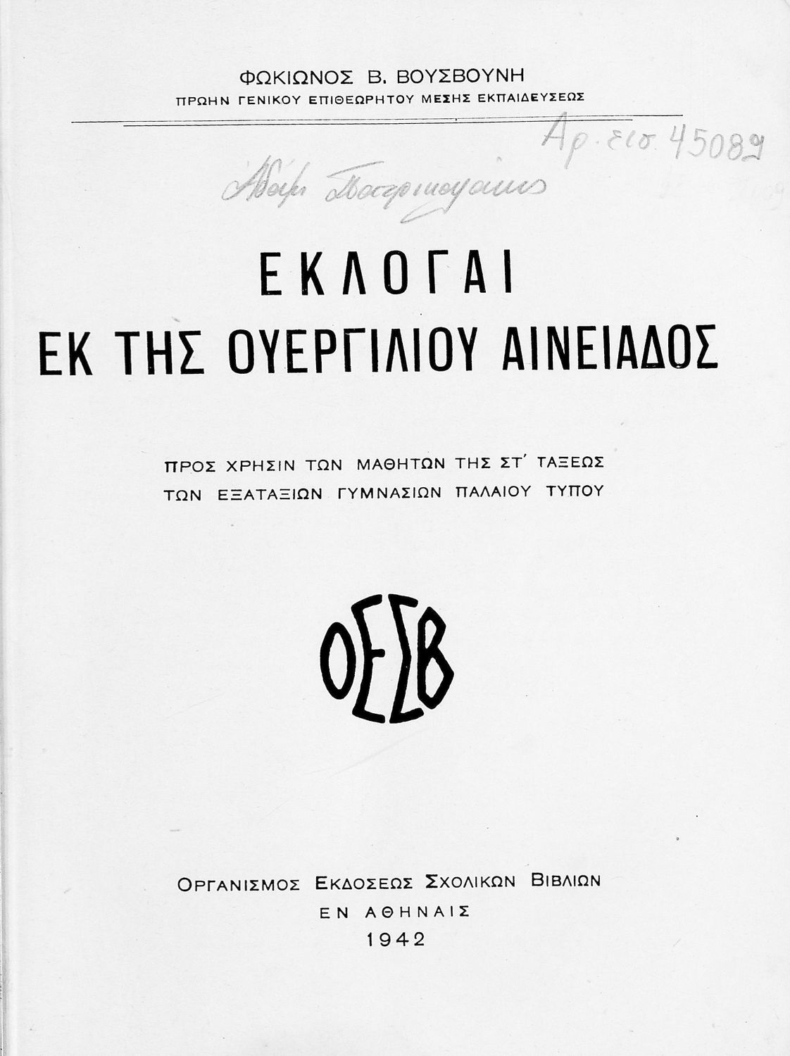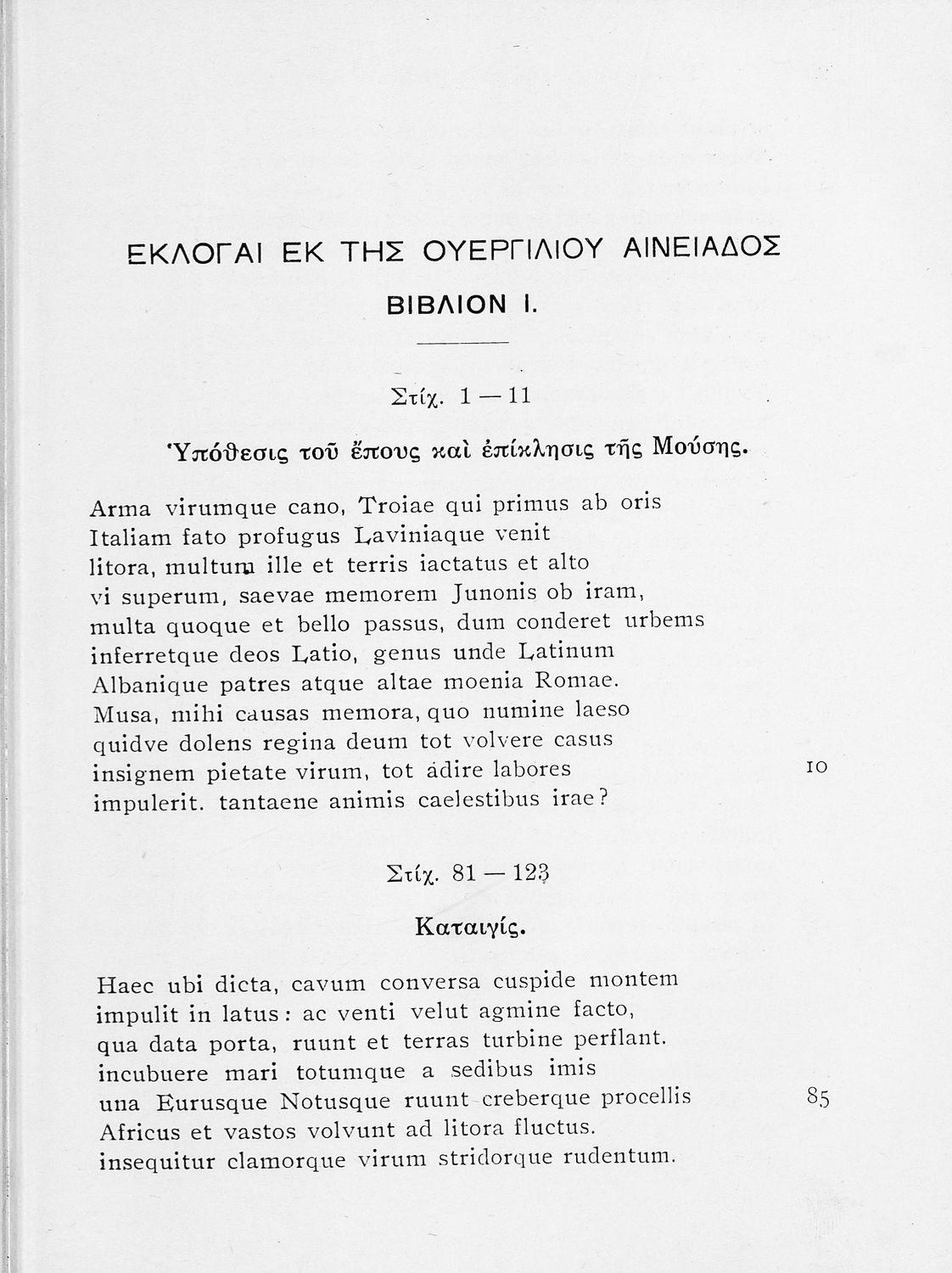 Τίτλος: Εκλογαί εκ της Ουεργιλίου Αινειάδος προς χρήσιν των μαθητών της ΣΤ΄ τάξεως των Εξαταξίων Γυμνασίων παλαιού τύπου
