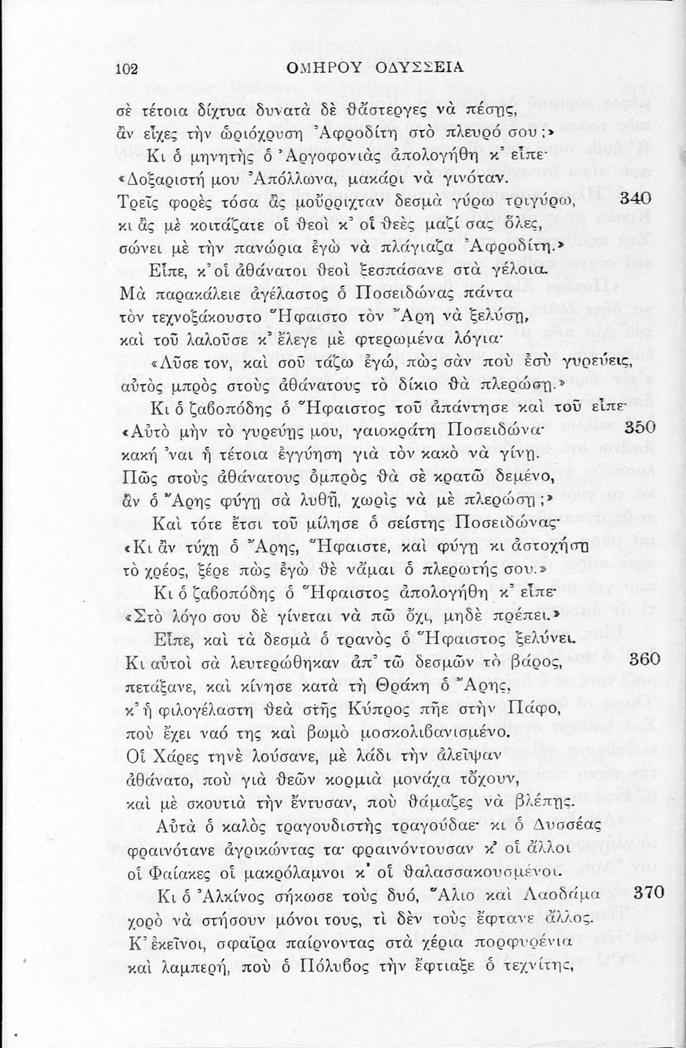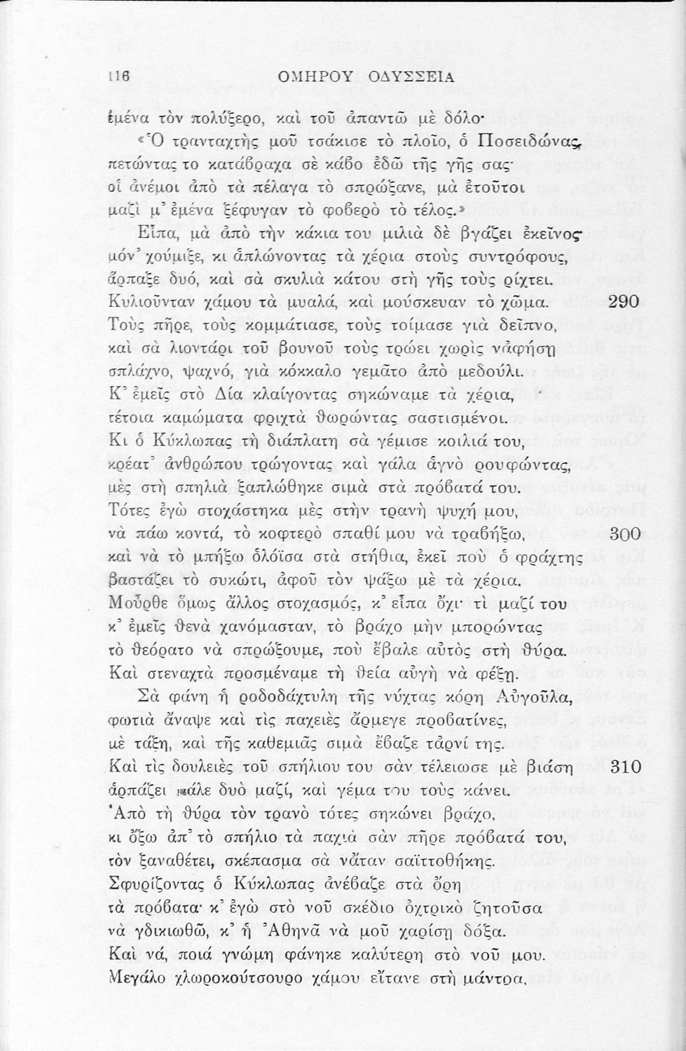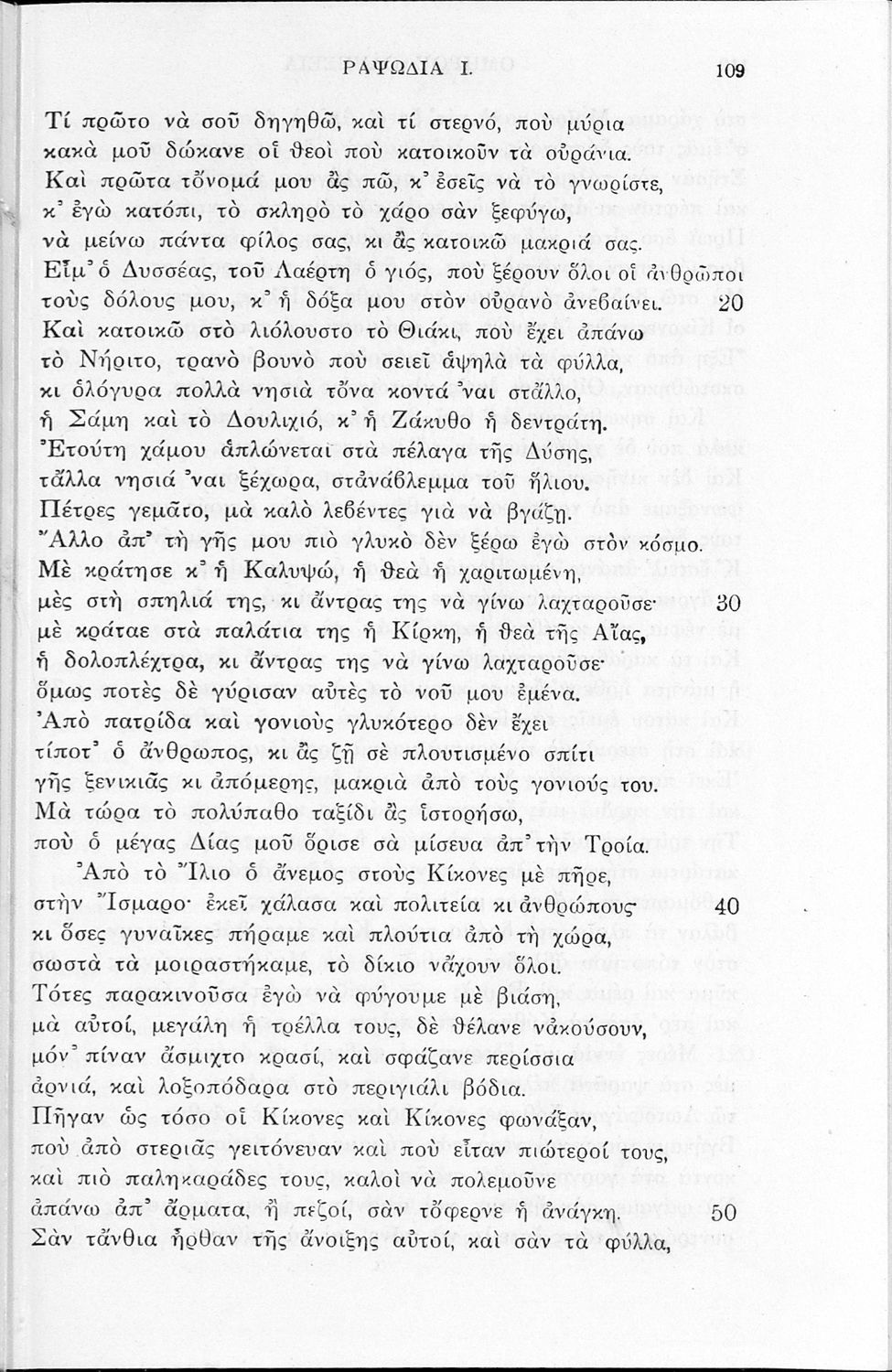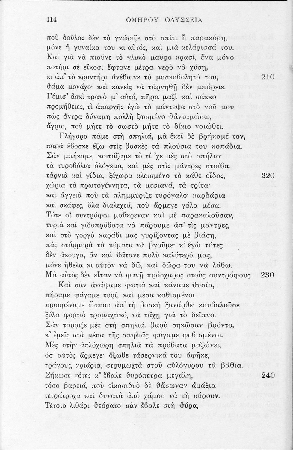Σχολικό εγχειρίδιο της Α΄, Β΄, Γ΄ Γυμνασίου για το μάθημα των Αρχαίων Ελληνικών. Περιέχει τις ραψωδίες της Οδύσσειας, μετάφραση, ερμηνευτικά και πραγματολογικά σχόλια, καθώς και γραμματικές παρατηρήσεις.