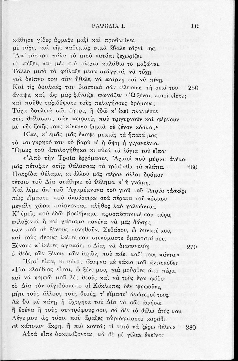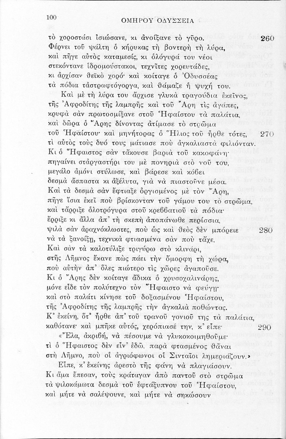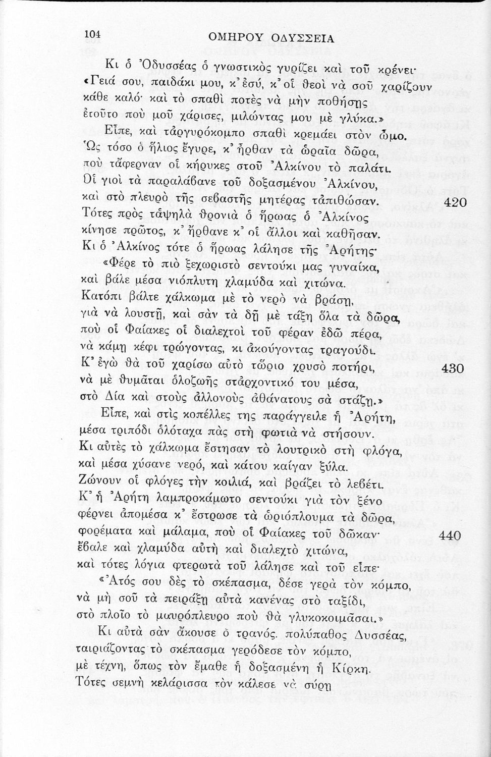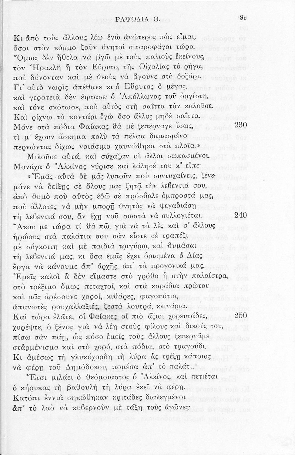 Σχολικό εγχειρίδιο της Α΄, Β΄, Γ΄ Γυμνασίου για το μάθημα των Αρχαίων Ελληνικών. Περιέχει τις ραψωδίες της Οδύσσειας, μετάφραση, ερμηνευτικά και πραγματολογικά σχόλια, καθώς και γραμματικές παρατηρήσεις.
