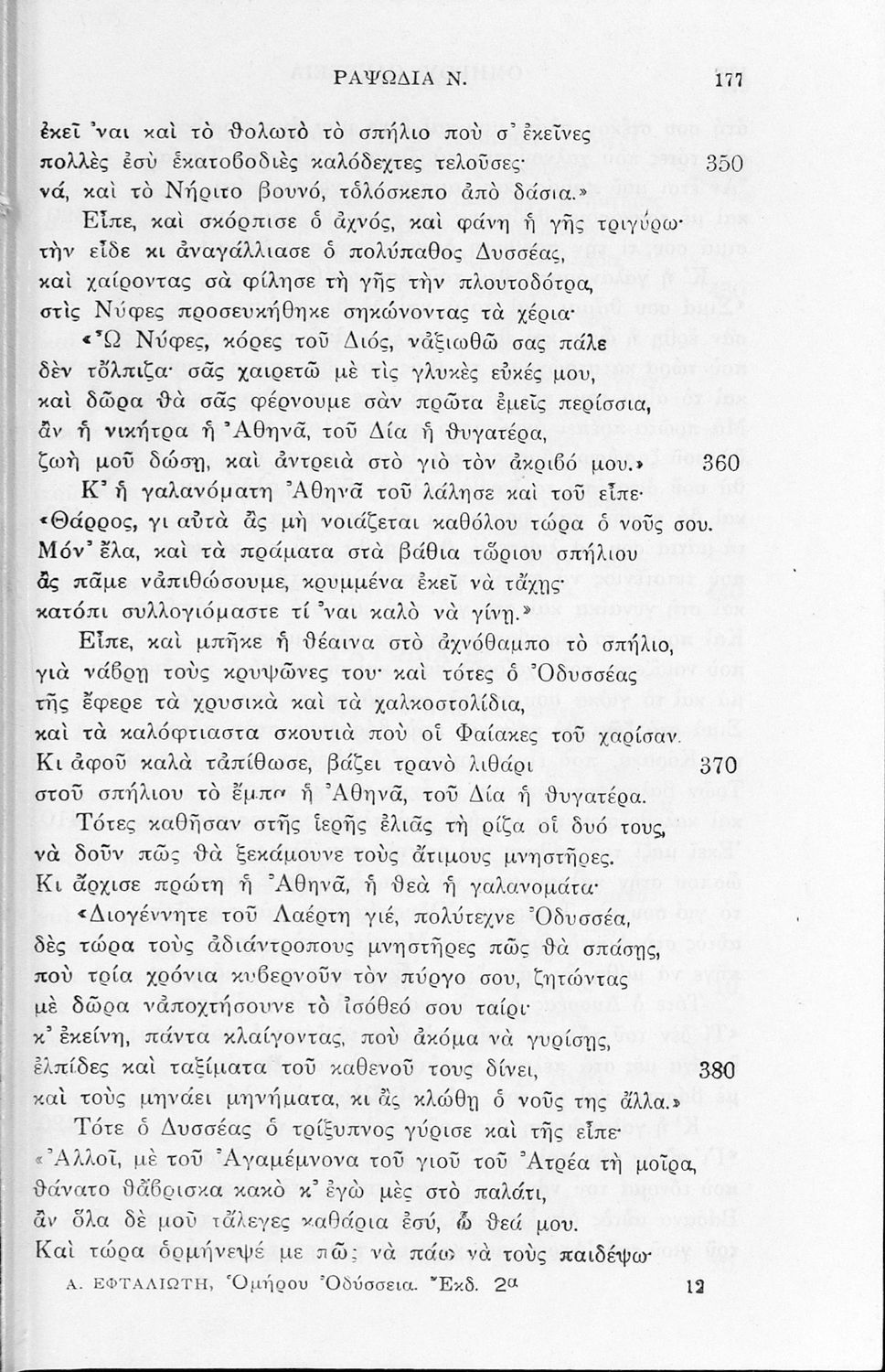 Σχολικό εγχειρίδιο της Α΄, Β΄, Γ΄ Γυμνασίου για το μάθημα των Αρχαίων Ελληνικών. Περιέχει τις ραψωδίες της Οδύσσειας, μετάφραση, ερμηνευτικά και πραγματολογικά σχόλια, καθώς και γραμματικές παρατηρήσεις.