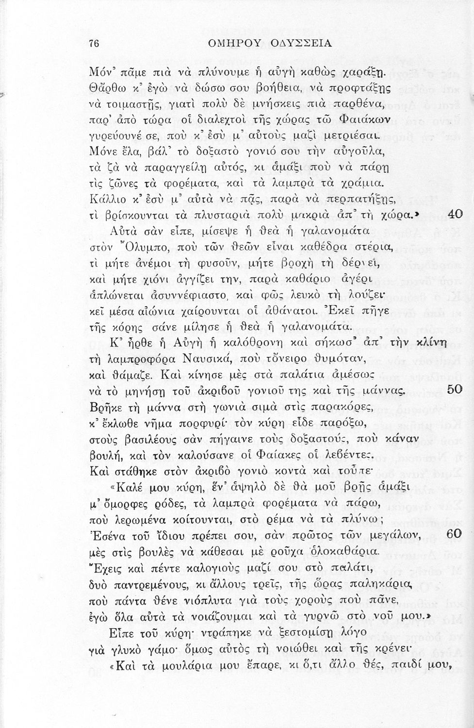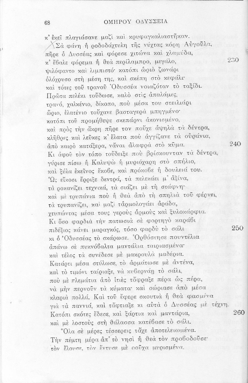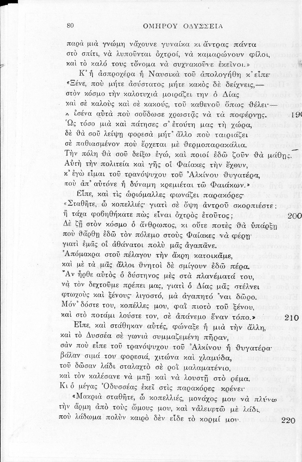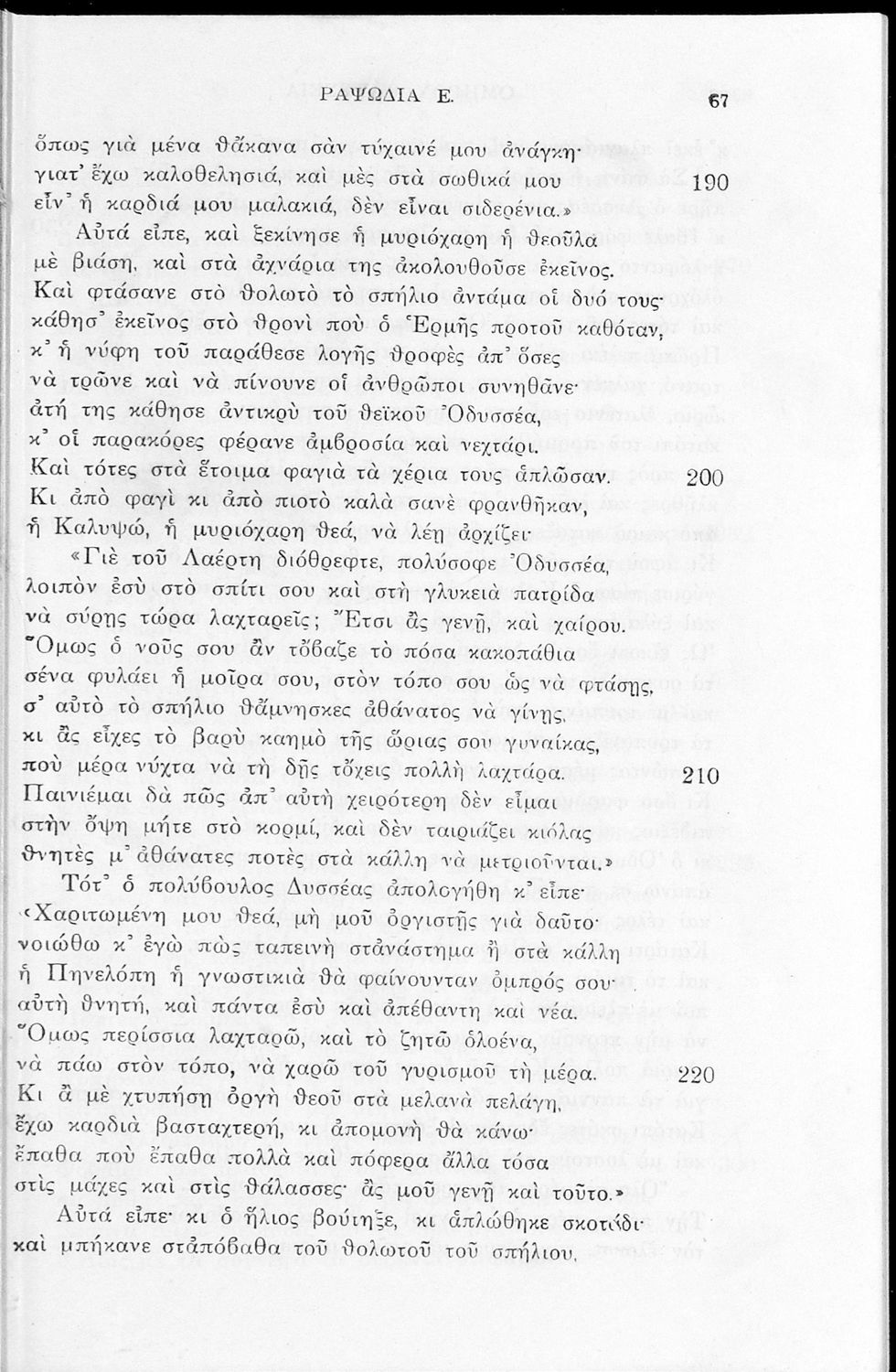 Σχολικό εγχειρίδιο της Α΄, Β΄, Γ΄ Γυμνασίου για το μάθημα των Αρχαίων Ελληνικών. Περιέχει τις ραψωδίες της Οδύσσειας, μετάφραση, ερμηνευτικά και πραγματολογικά σχόλια, καθώς και γραμματικές παρατηρήσεις.
