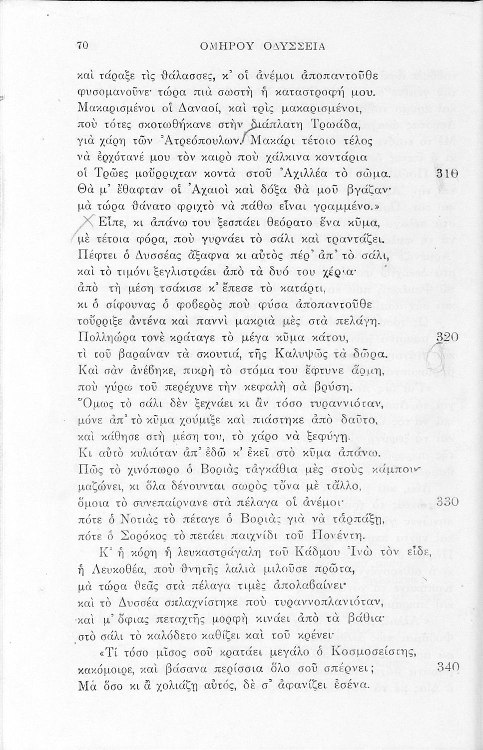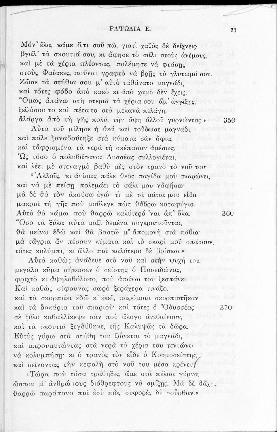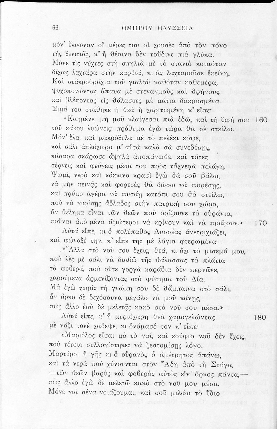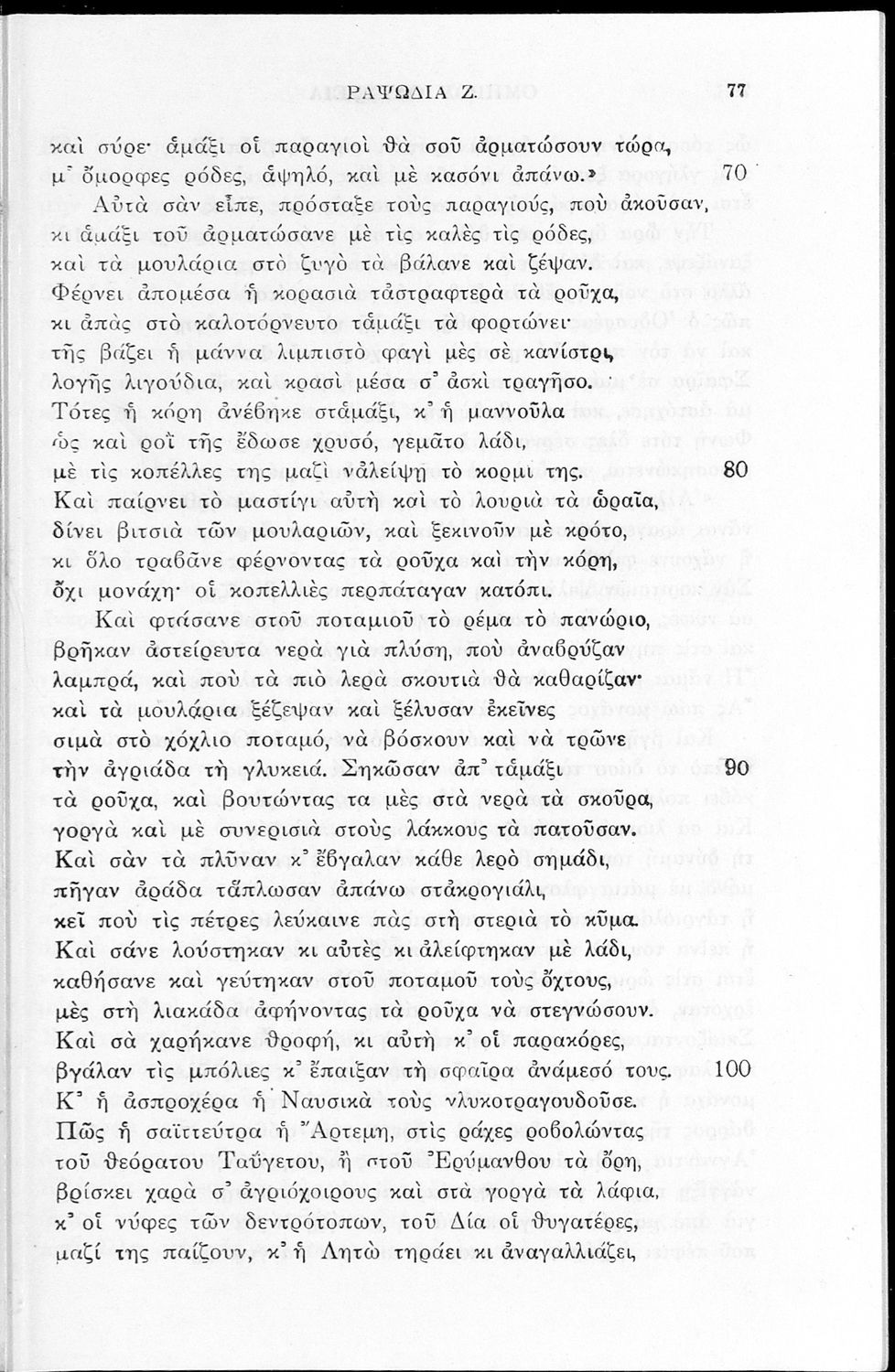Σχολικό εγχειρίδιο της Α΄, Β΄, Γ΄ Γυμνασίου για το μάθημα των Αρχαίων Ελληνικών. Περιέχει τις ραψωδίες της Οδύσσειας, μετάφραση, ερμηνευτικά και πραγματολογικά σχόλια, καθώς και γραμματικές παρατηρήσεις.
