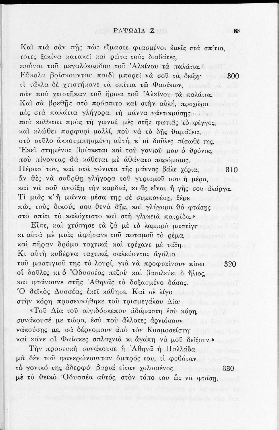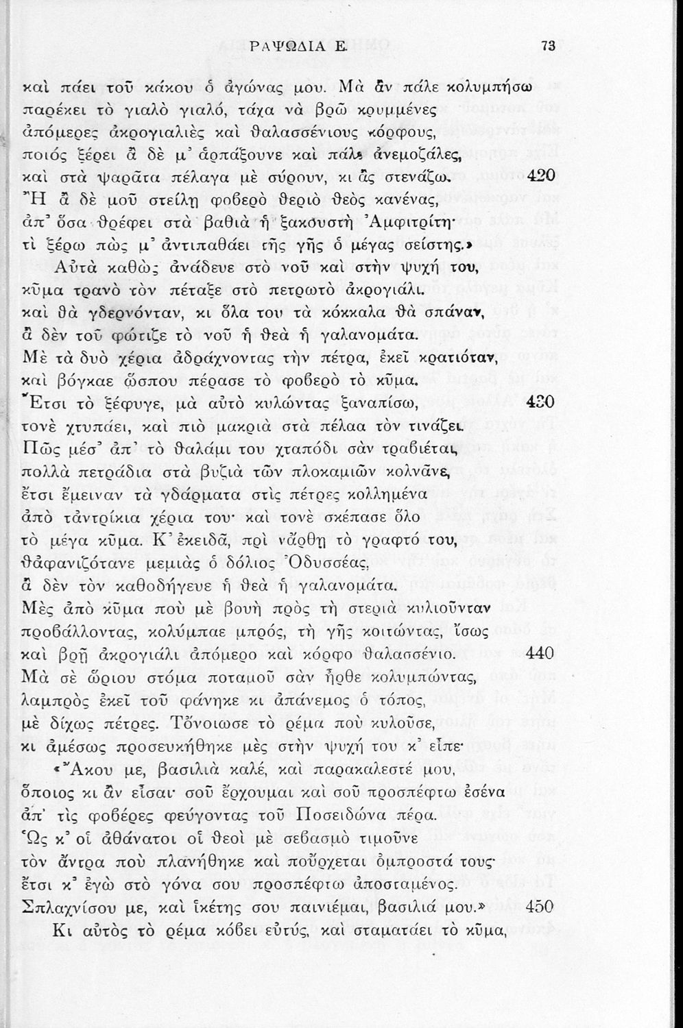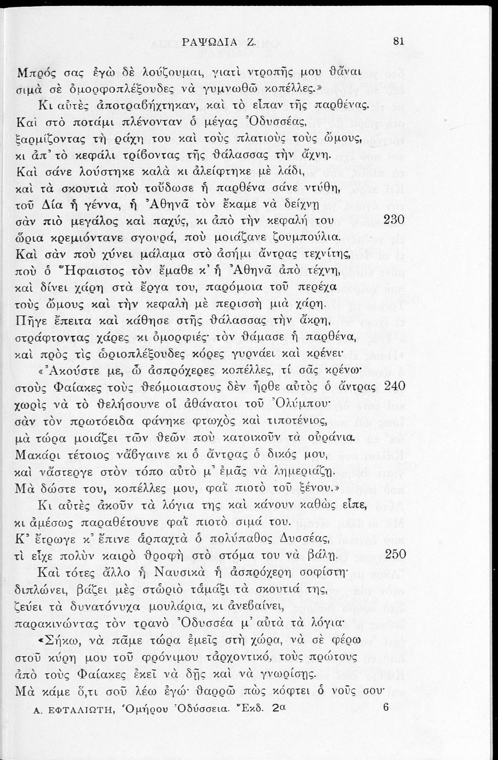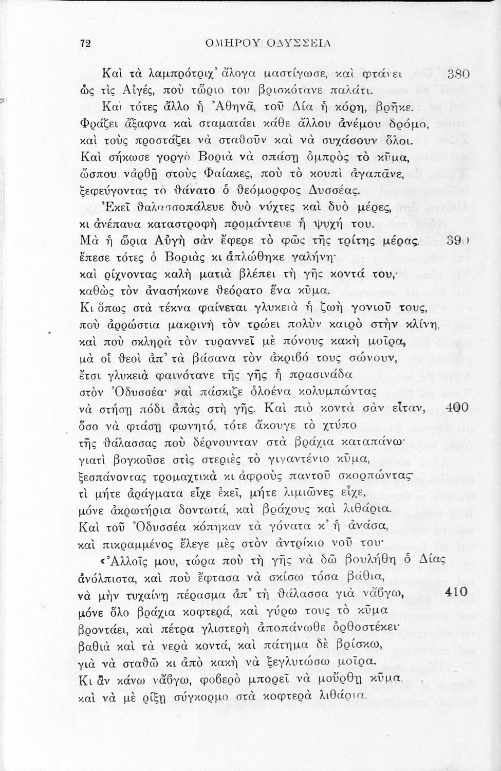 Σχολικό εγχειρίδιο της Α΄, Β΄, Γ΄ Γυμνασίου για το μάθημα των Αρχαίων Ελληνικών. Περιέχει τις ραψωδίες της Οδύσσειας, μετάφραση, ερμηνευτικά και πραγματολογικά σχόλια, καθώς και γραμματικές παρατηρήσεις.