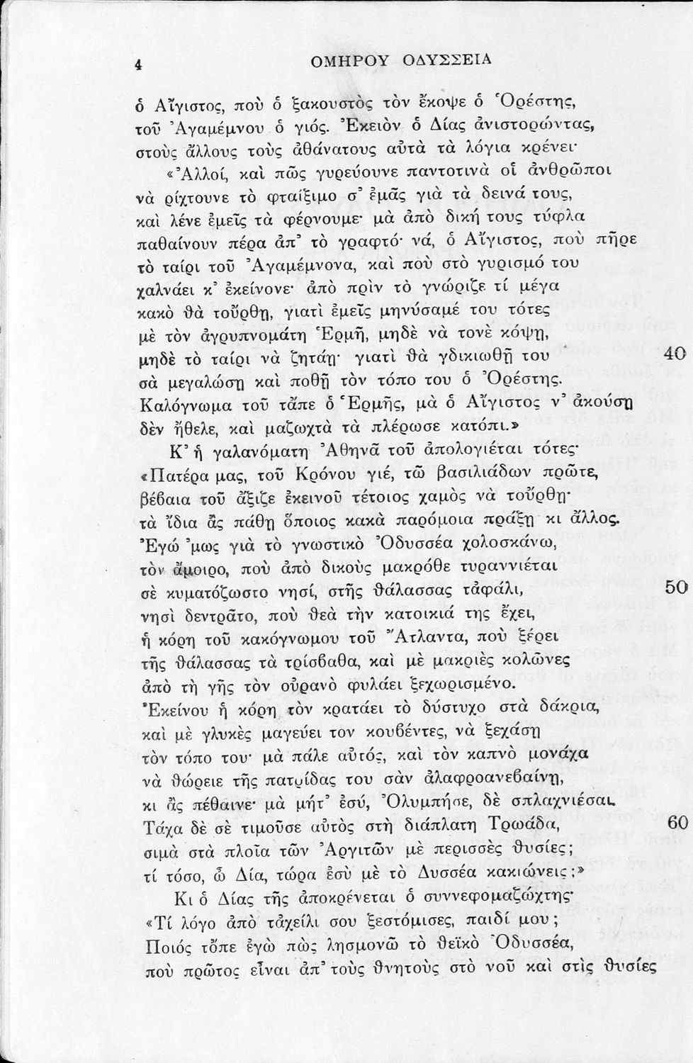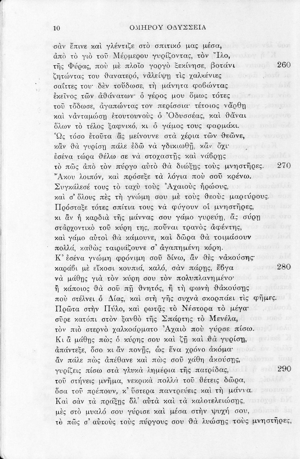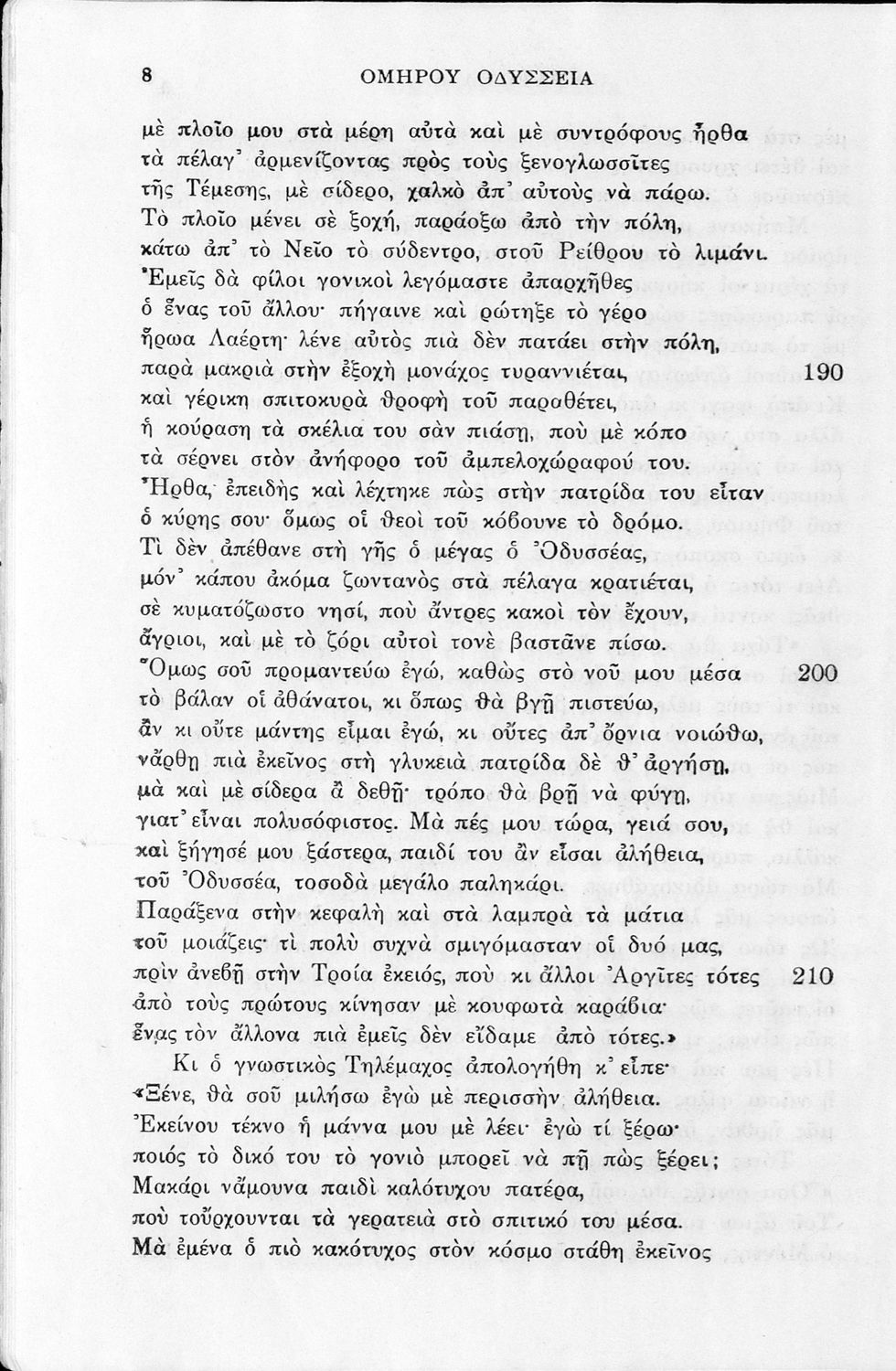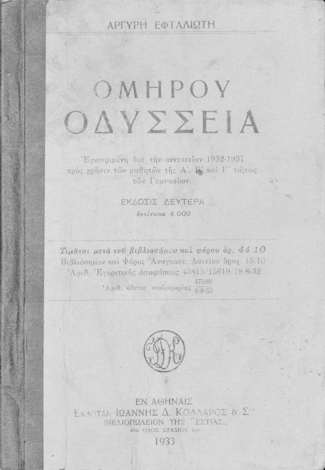 Σχολικό εγχειρίδιο της Α΄, Β΄, Γ΄ Γυμνασίου για το μάθημα των Αρχαίων Ελληνικών. Περιέχει τις ραψωδίες της Οδύσσειας, μετάφραση, ερμηνευτικά και πραγματολογικά σχόλια, καθώς και γραμματικές παρατηρήσεις.