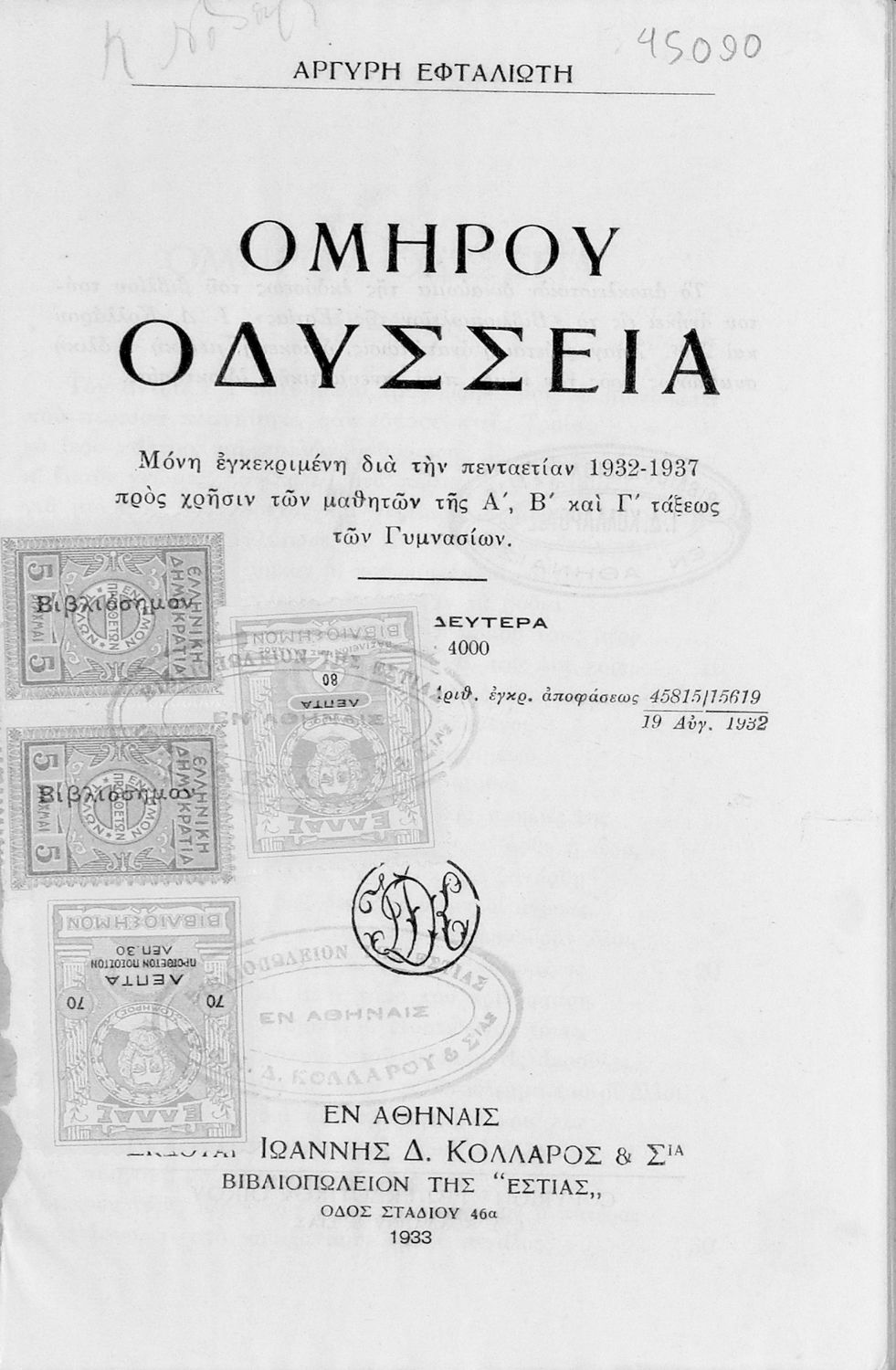 Τίτλος: Ομήρου Οδύσσεια. Προς χρήσιν των μαθητών της Α΄, Β΄ και Γ΄ Τάξεων των Γυμνασίων