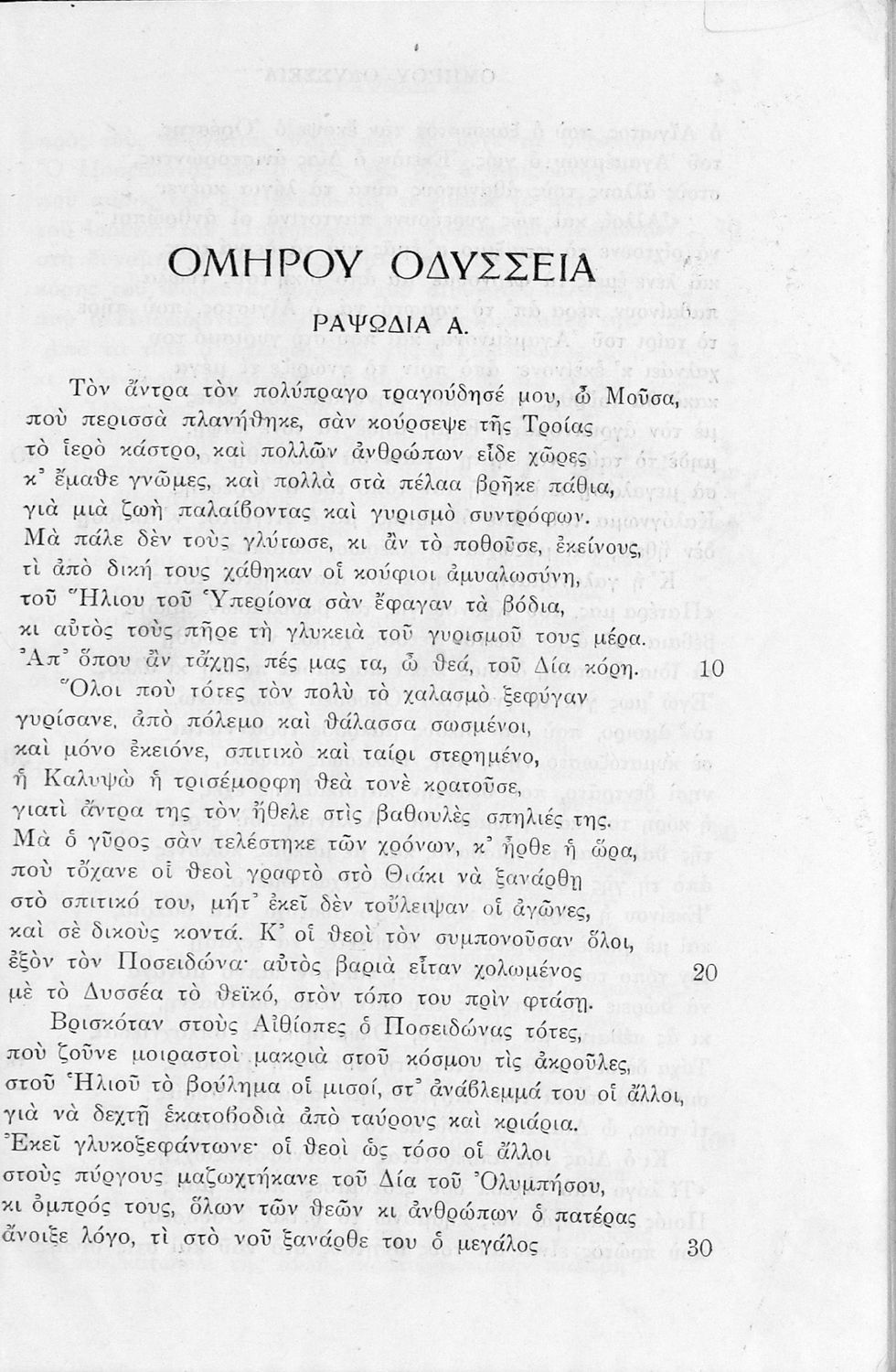 Παρουσίαση περιεχομένου: Σχολικό εγχειρίδιο της Α΄, Β΄, Γ΄ Γυμνασίου για το μάθημα των Αρχαίων Ελληνικών. Περιέχει τις ραψωδίες της Οδύσσειας, μετάφραση, ερμηνευτικά και πραγματολογικά σχόλια, καθώς και γραμματικές παρατηρήσεις.