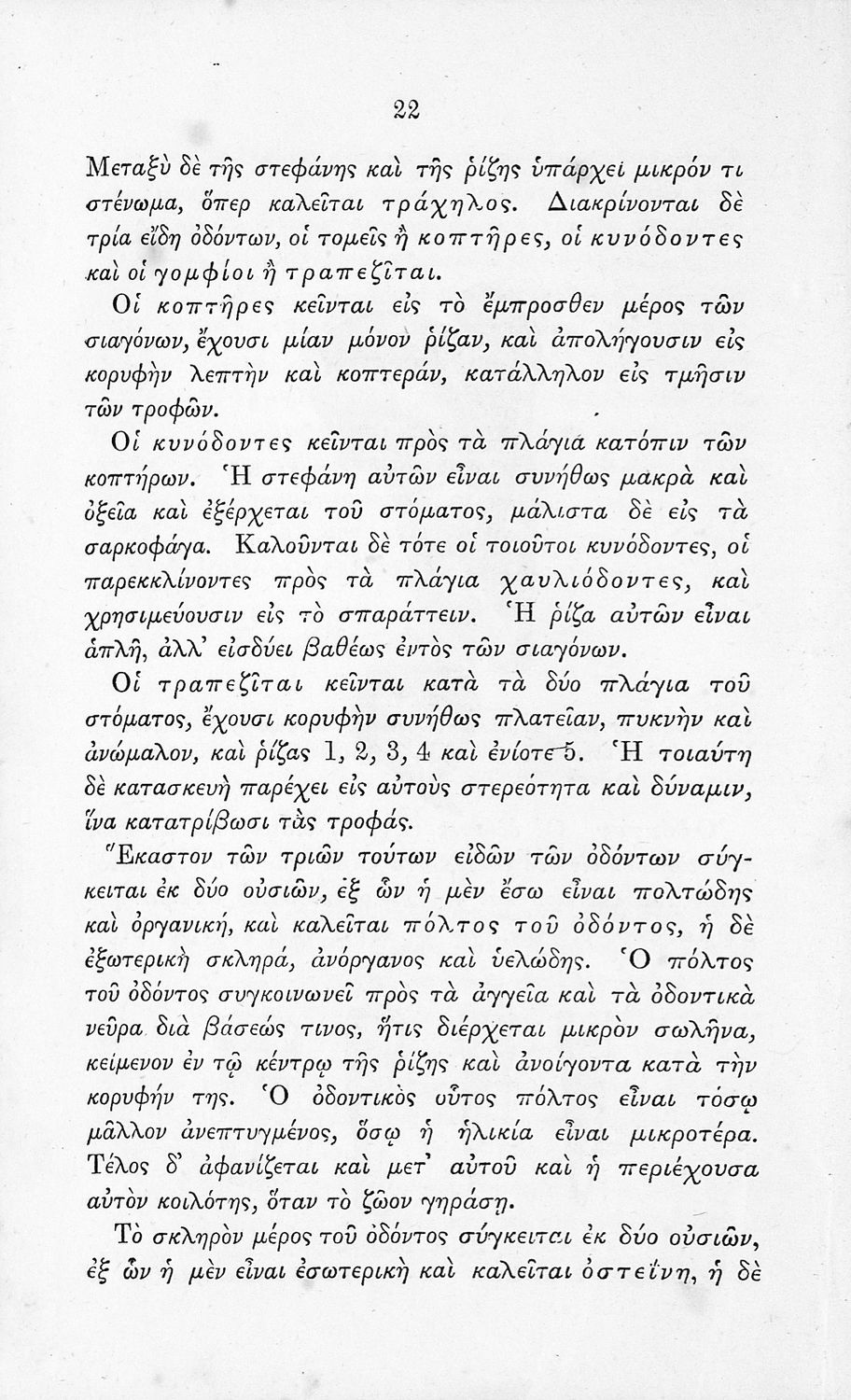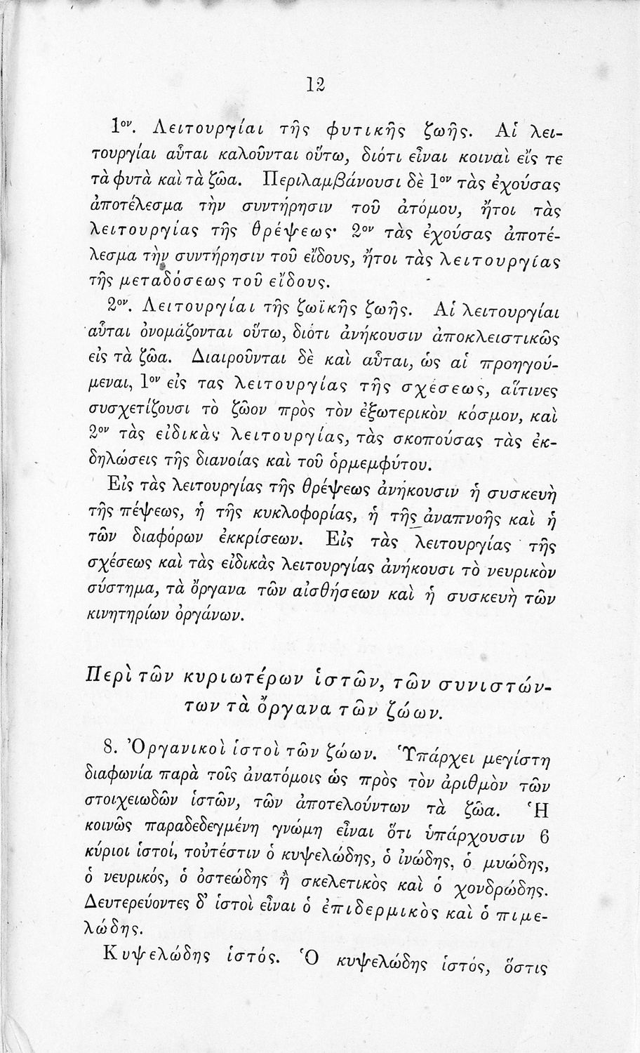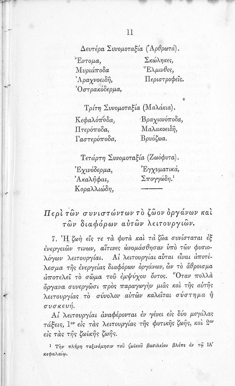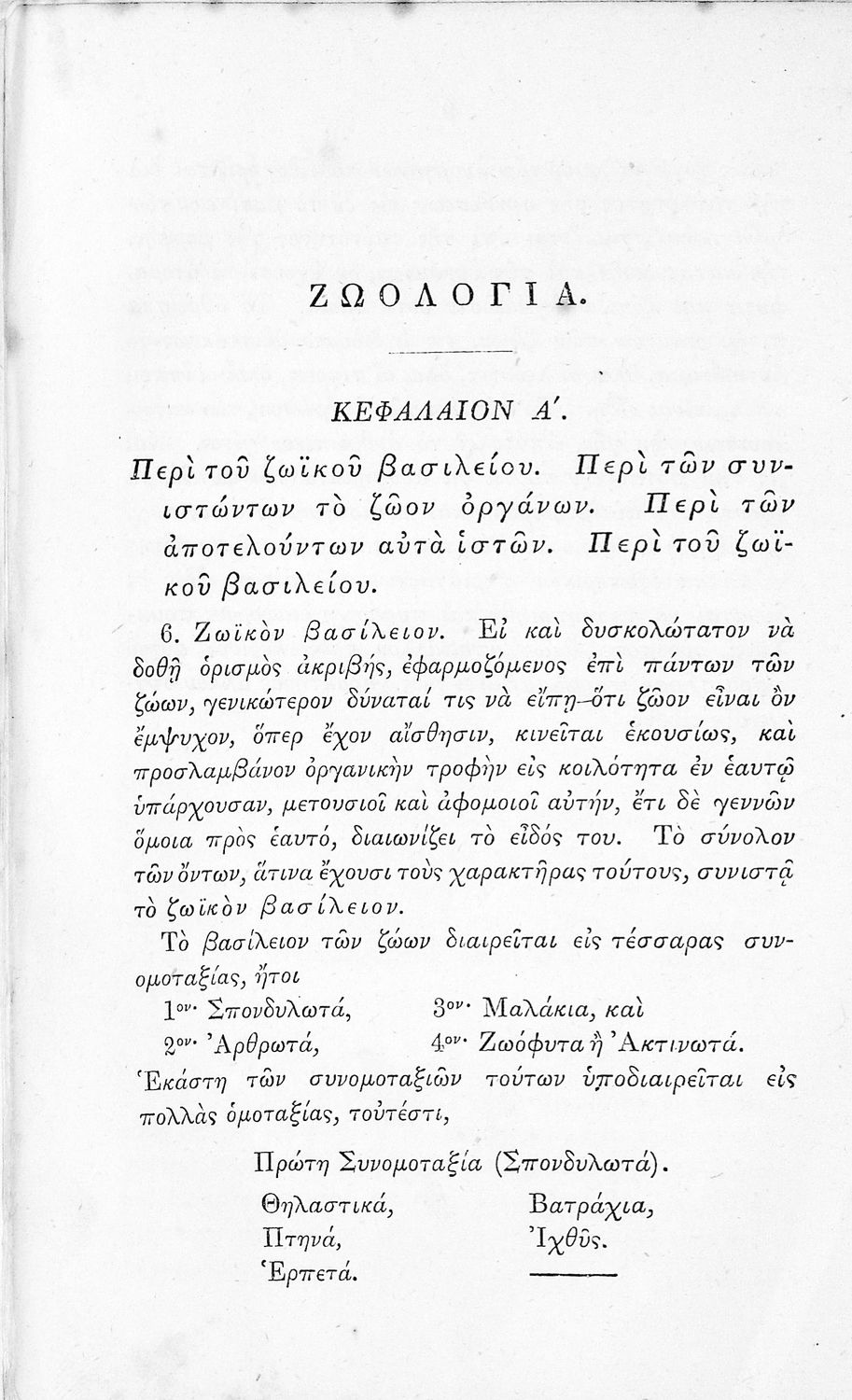 Βαθμίδα εκπαίδευσης: Δευτεροβάθμια Τάξη: Γυμνάσιο Μάθημα: Ζωολογία Γλώσσα: Καθαρεύουσα Παρουσίαση περιεχομένου: Σχολικό εγχειρίδιο Ζωολογίας που αντιμετωπίζει τις φυσικές επιστήμες ως "υπηρέτριες της θρησκείας" και εκκινεί από την "ηθική ωφέλεια που προκύπτει από την κατανόηση της άπειρης σοφίας και αγαθότητας του Δημιουργού". |