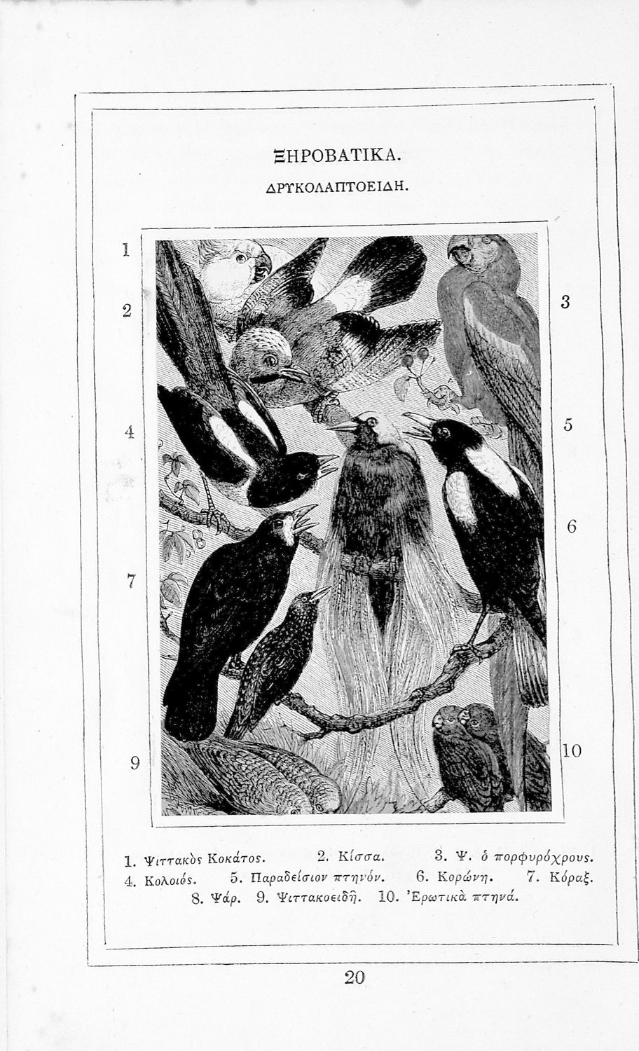 Βαθμίδα εκπαίδευσης: Δευτεροβάθμια Τάξη: Γυμνάσιο Μάθημα: Ζωολογία Γλώσσα: Καθαρεύουσα Παρουσίαση περιεχομένου: Σχολικό εγχειρίδιο Ζωολογίας που αντιμετωπίζει τις φυσικές επιστήμες ως "υπηρέτριες της θρησκείας" και εκκινεί από την "ηθική ωφέλεια που προκύπτει από την κατανόηση της άπειρης σοφίας και αγαθότητας του Δημιουργού". |