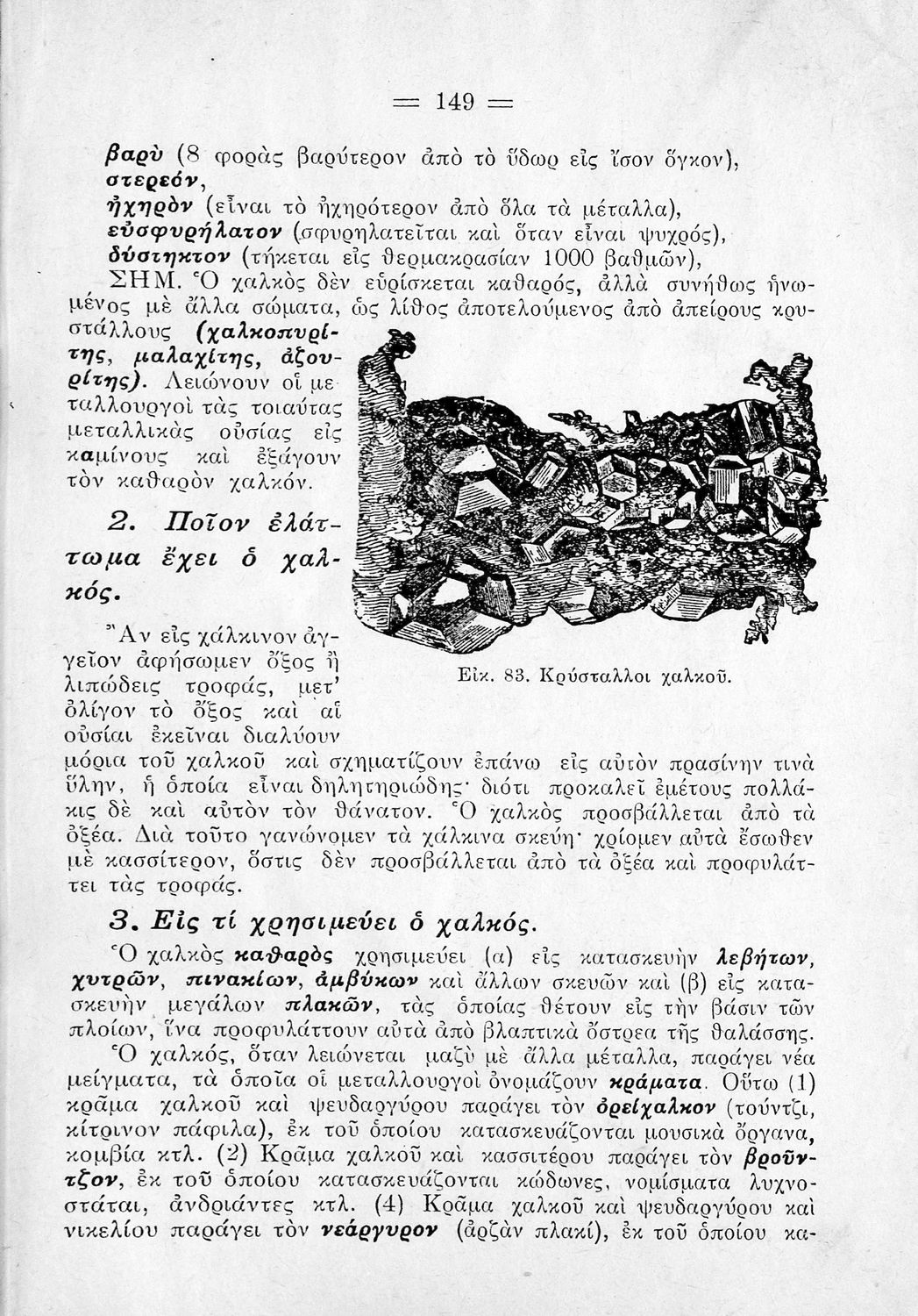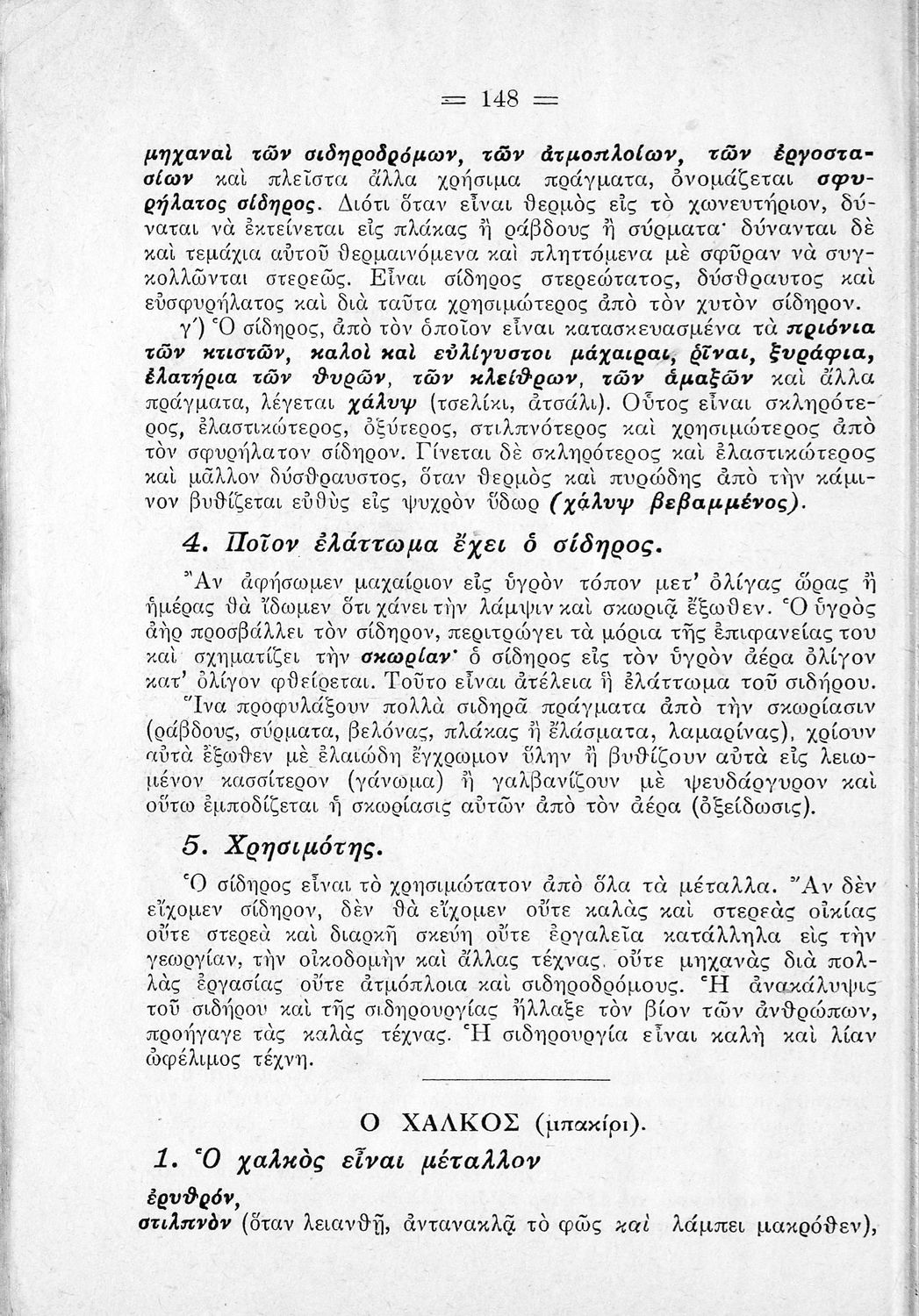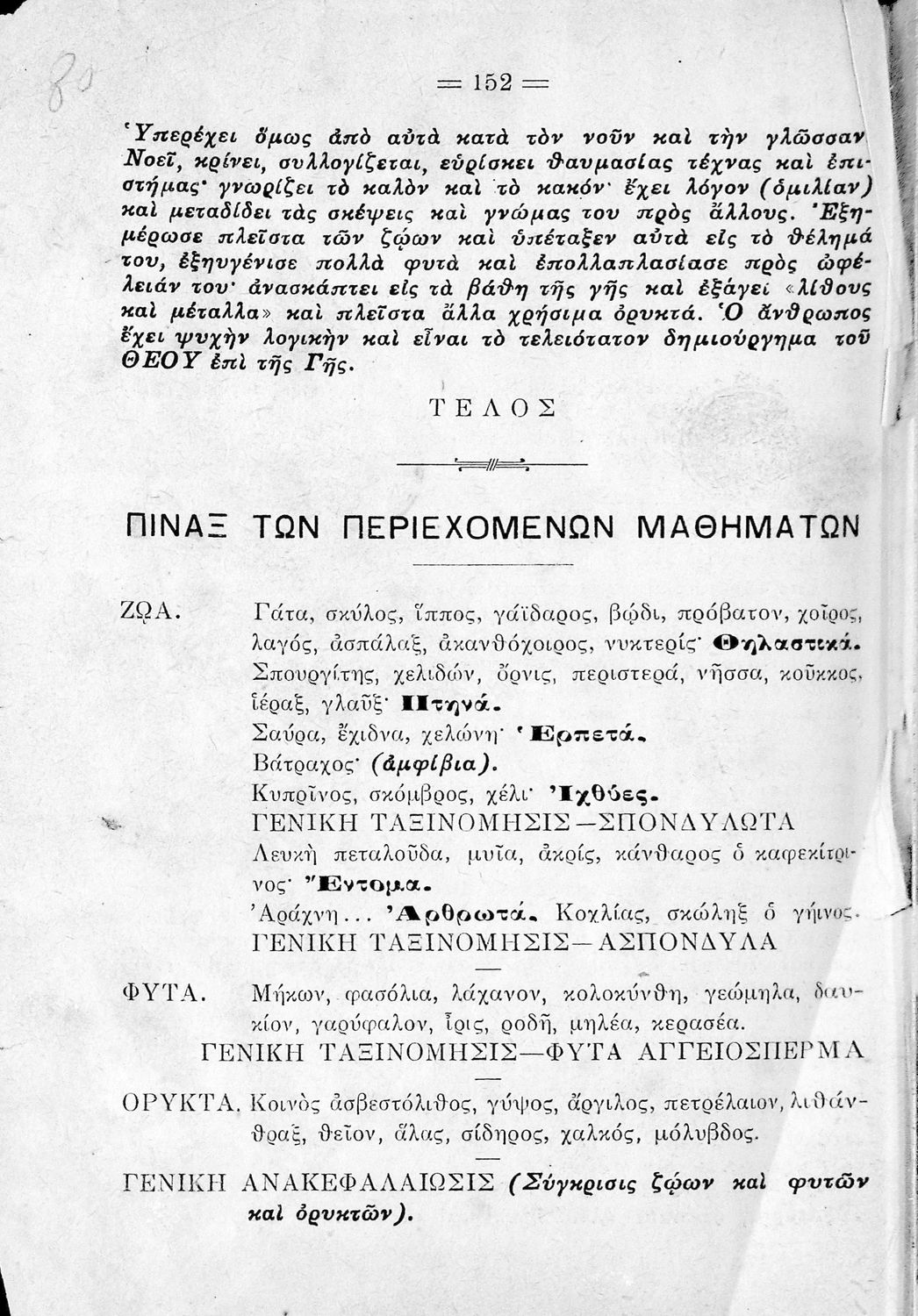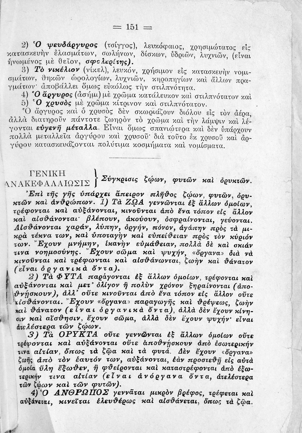 Βαθμίδα εκπαίδευσης: Δευτεροβάθμια Τάξη: Α' Ελληνικού Σχολείου Μάθημα: Φυσική Ιστορία Γλώσσα: Απλή καθαρεύουσα Παρουσίαση περιεχομένου: Σχολικό εγχειρίδιο της Α' Ελληνικού Σχολείου για το μάθημα της Φυσικής Ιστορίας. Περιέχει πληροφορίες για τη φυτολογία, την ορυκτολογία και τη ζωολογία. Το βιβλίο έχει εικόνες, οι οποίες διευκολύνουν τη διδασκαλία. Ο λόγος των κειμένων είναι απλός και κατανοητός για τους μαθητές. |