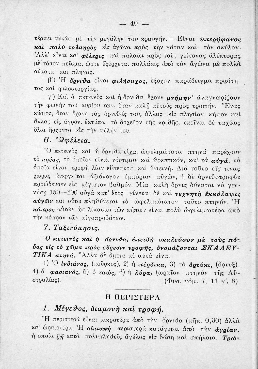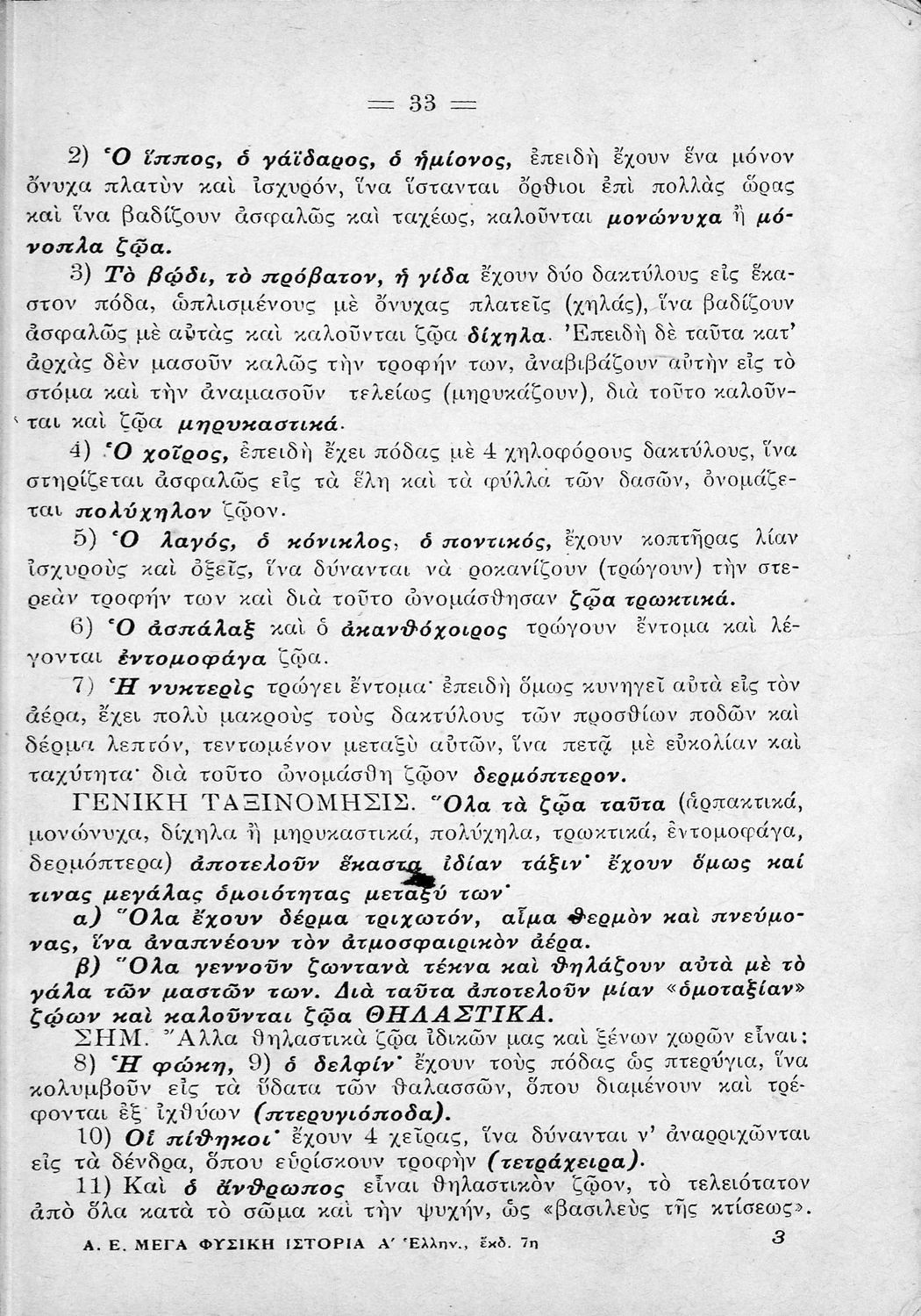 Σχολικό εγχειρίδιο της Α' Ελληνικού Σχολείου για το μάθημα της Φυσικής Ιστορίας. Το εγχειρίδιο περιλαμβάνει τα βασικά ζητήματα της επιστήμης της ζωολογίας (κατηγορίες και διαφορές μεταξύ ζώων, πτηνών και ...