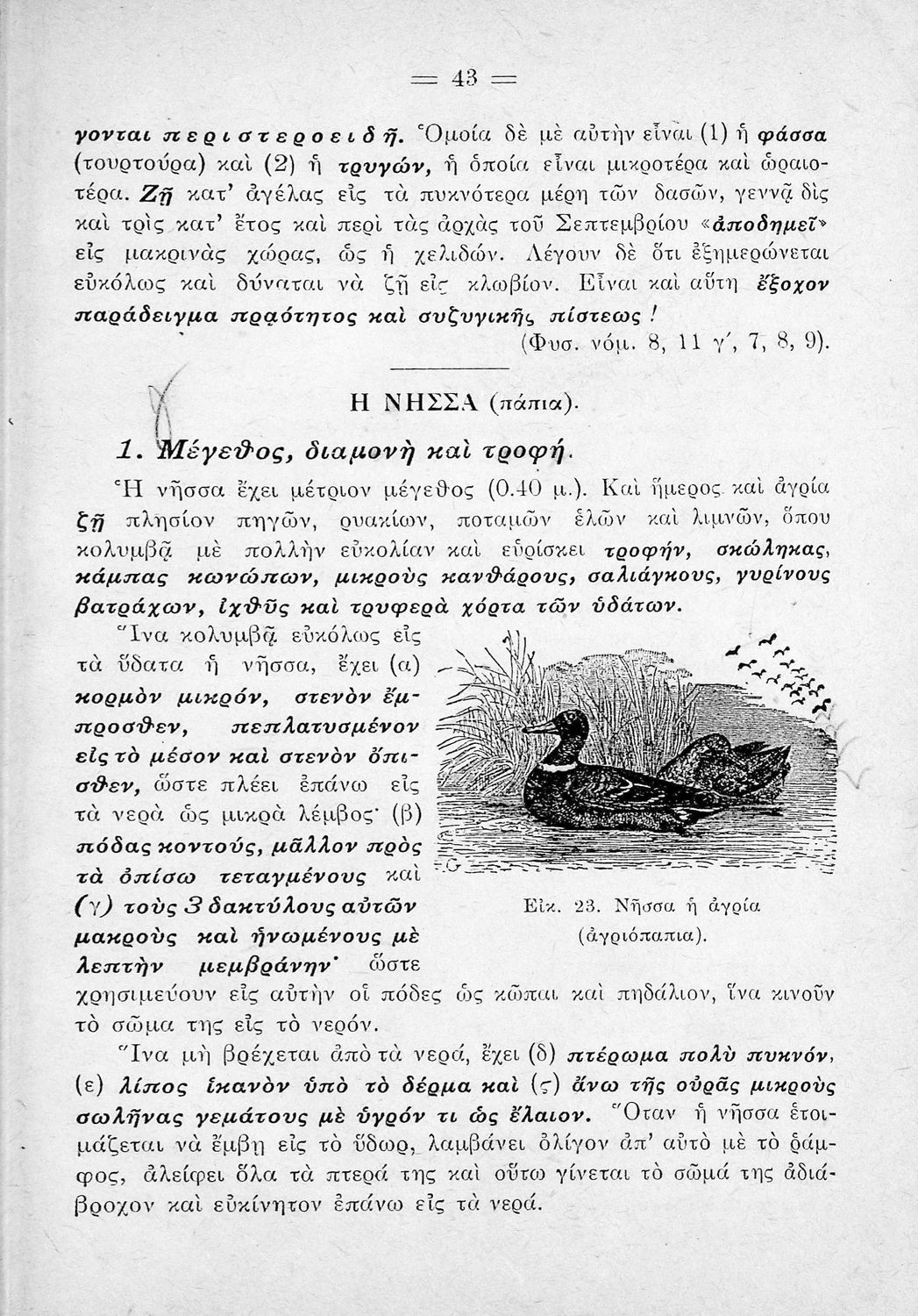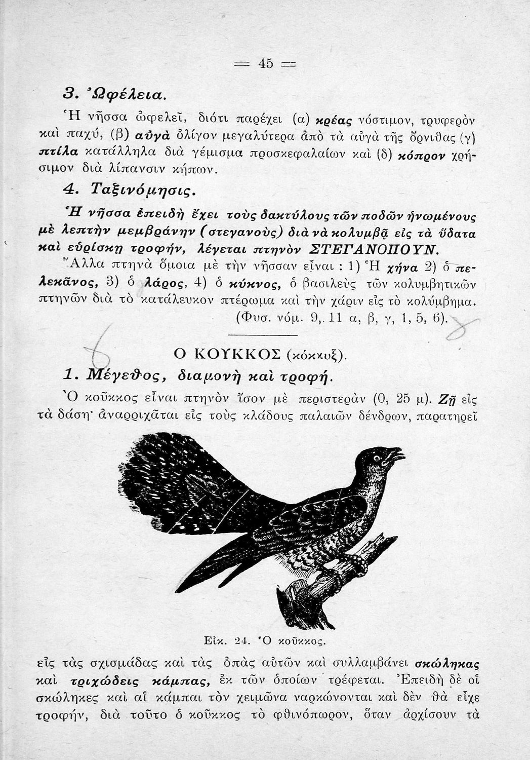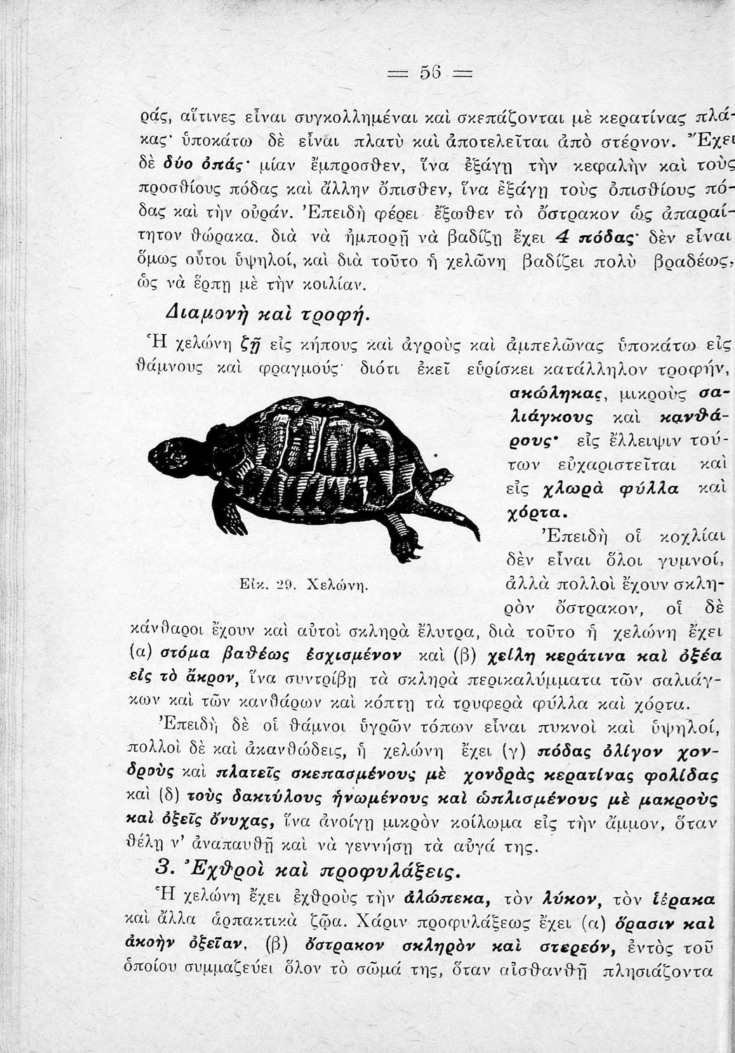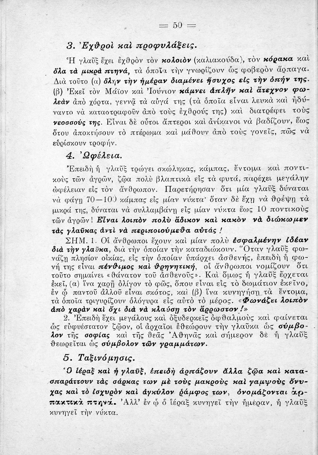 Σχολικό εγχειρίδιο Γεωγραφίας για την Α΄ Ελληνικών Σχολείων. Βιβλίο Φυσικής Ιστορίας με ζώα και φυτά που αναφέρονται οι χρήσεις τους, οι εχθροί και οι προφυλάξεις.