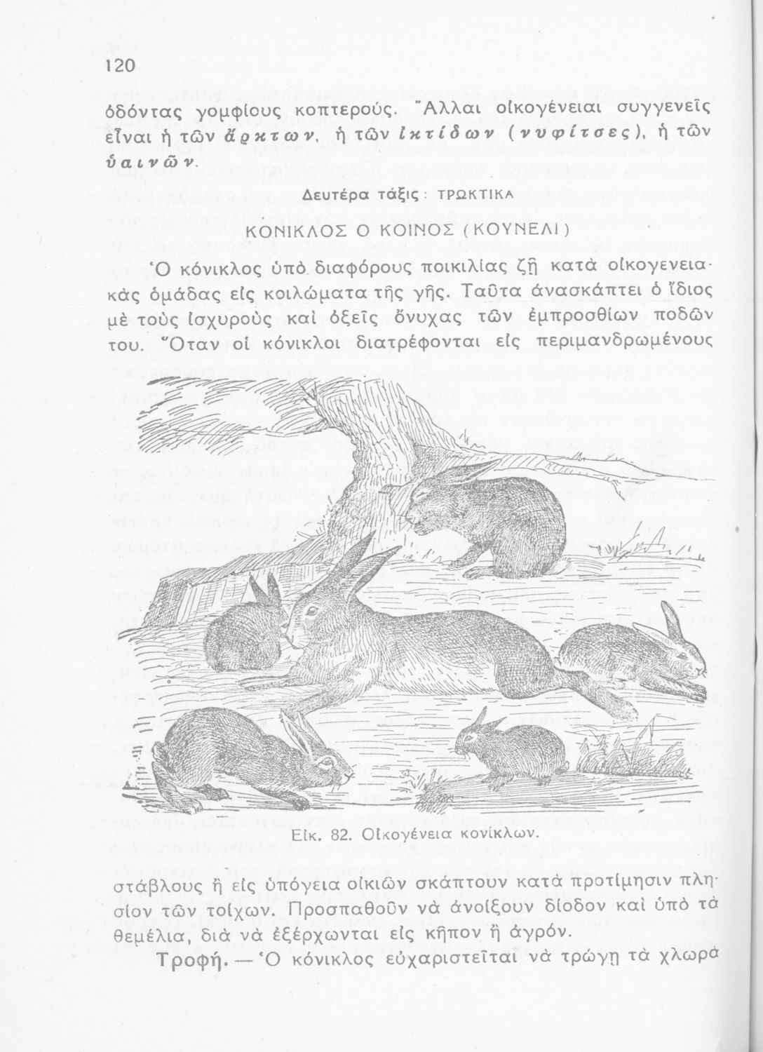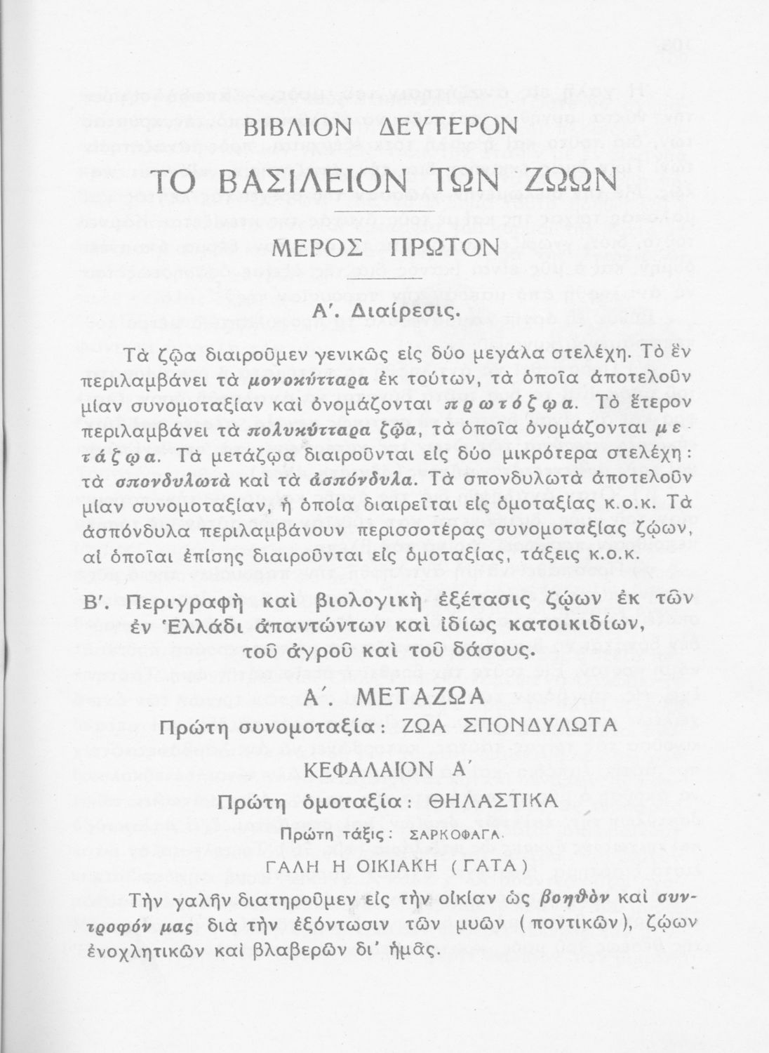 Σχολικό εγχειρίδιο Ζωολογίας/Φυτολογίας για τα Γυμνάσια και Αστικά Σχολεία που παρουσιάζει διάφορα ζώα και φυτά ανάλογα με τη συνομοταξία στην οποία ανήκουν.