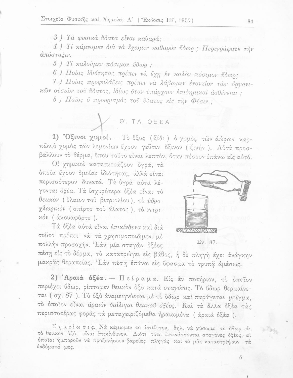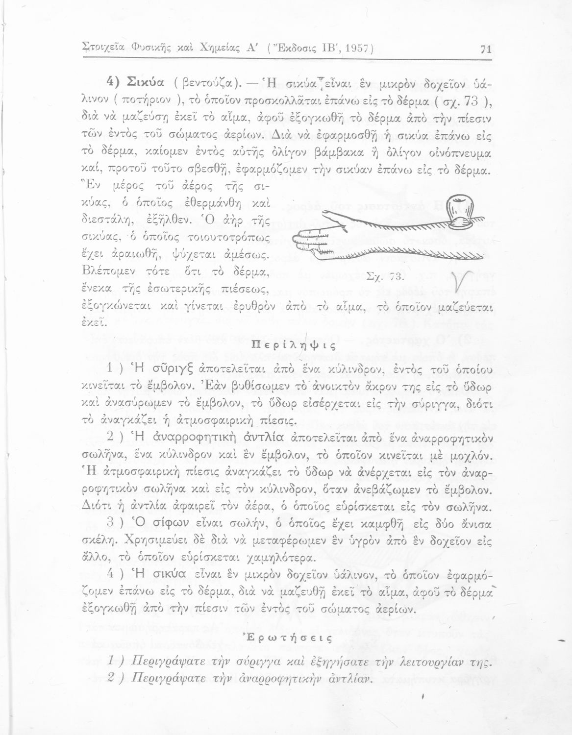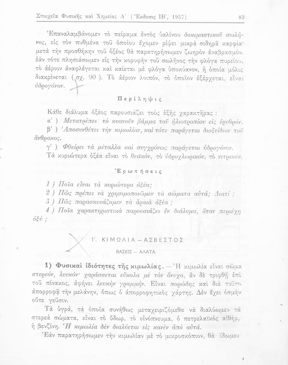 Σχολικό εγχειρίδιο για το μάθημα της Φυσικής στο Γυμνάσιο . Παρέχει βασικές γνώσεις της φυσικής επιστήμης. Αναλύει τα φαινόμενα της αδράνειας, της βαρύτητας, της υδροστατικής πίεσης κ.α. Όσον αφορά τη χημεία αναφέρεται στις ιδιότητες των μετάλλων, τα οξέα, τις βάσεις και τα άλατα. Αναφέρεται στην πρακτική εφαρμογή της φυσικής και της χημείας στην καθημερινότητά. Επίσης, περιλαμβάνει πολλά από τα όργανα, που χρησιμοποιούνται στη φυσική. Περιέχει εικόνες και σχεδιαγράμματα τα οποία βοηθούν τη διδασκαλία.