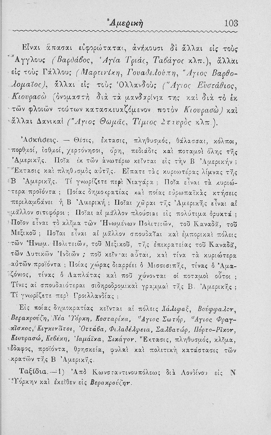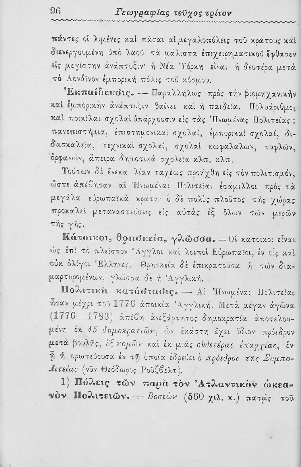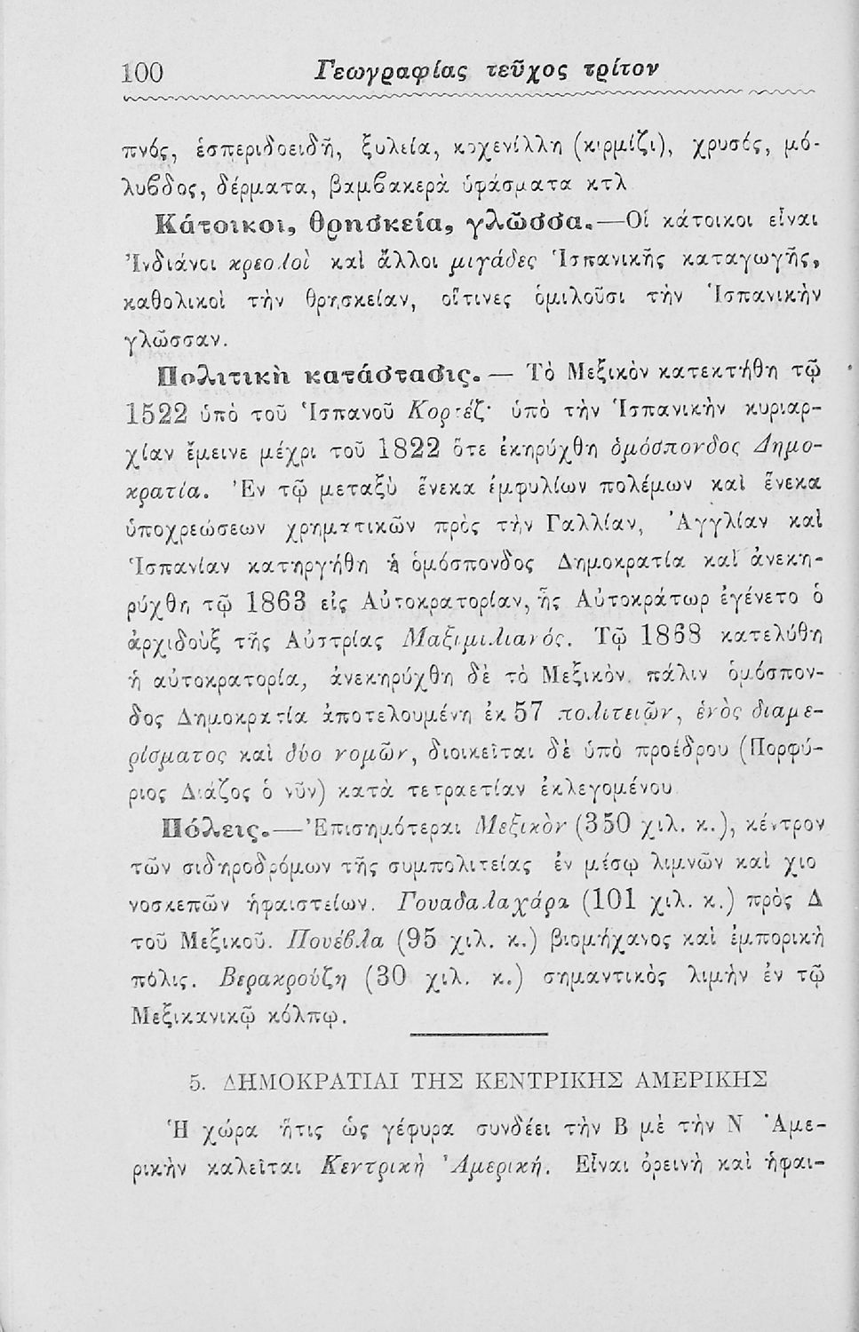 Μαθητικό βοήθημα Γεωγραφίας για τις Ανώτερες τάξεις των Αστικών Σχολείων που περιλαμβάνει στοιχεία φυσικής και μαθηματικής γεωγραφίας και εξετάζει κράτη από τις πέντε ηπείρους από γεωφυσική, πολιτική και οικονομική άποψη.