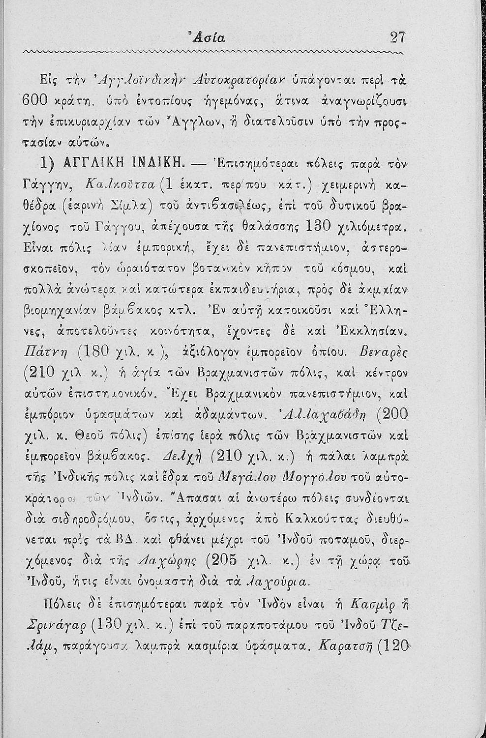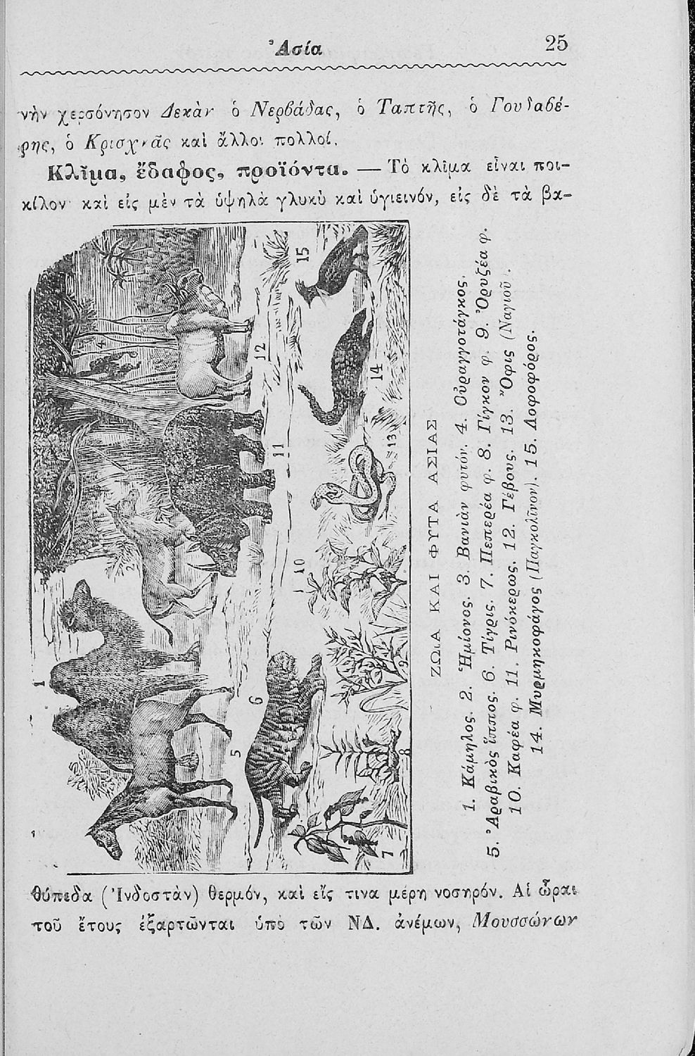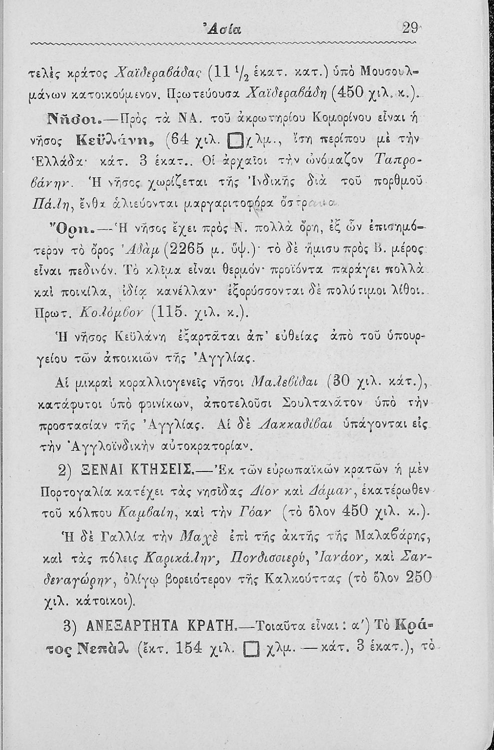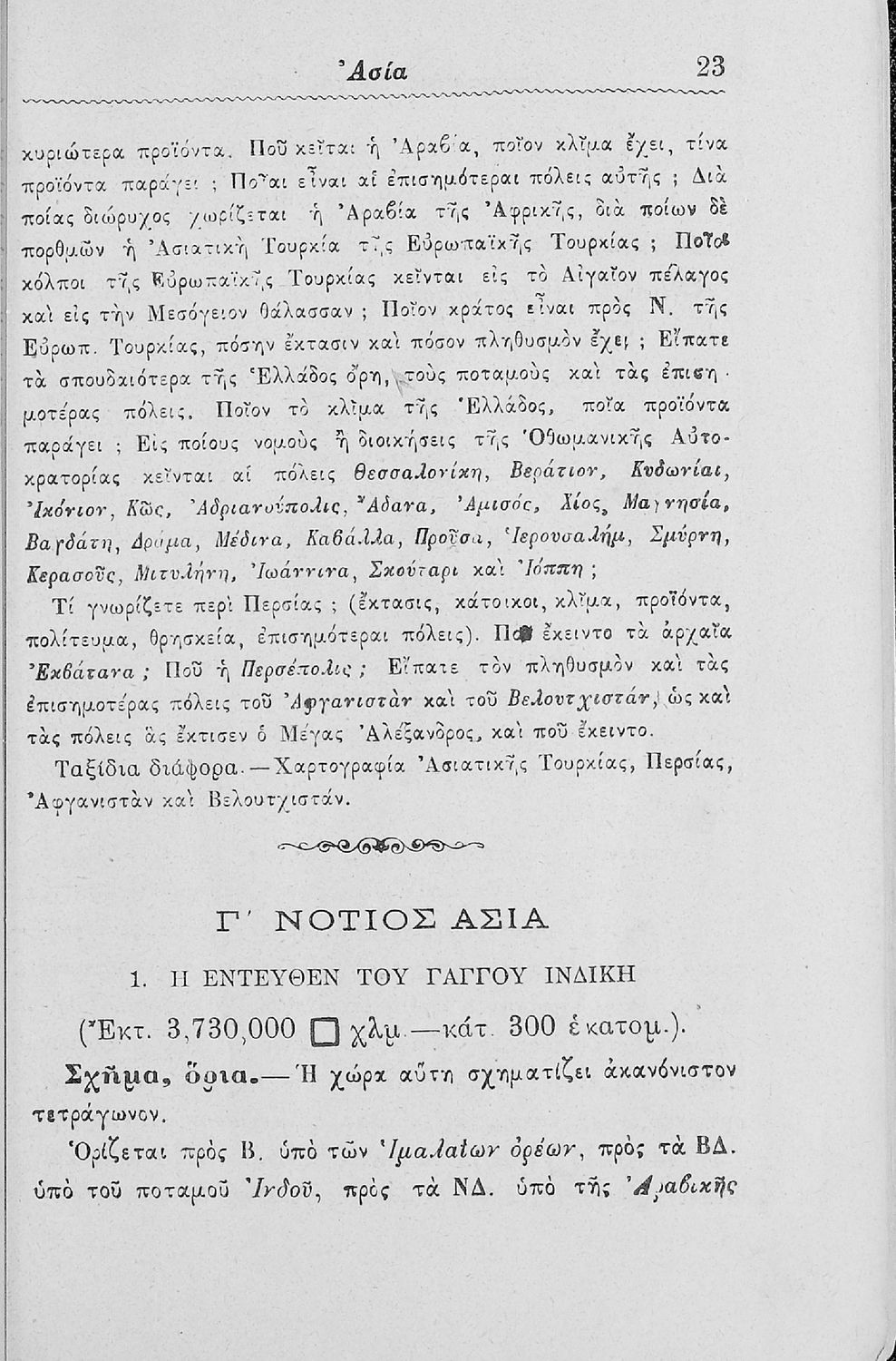Μαθητικό βοήθημα Γεωγραφίας για τις Ανώτερες τάξεις των Αστικών Σχολείων που περιλαμβάνει στοιχεία φυσικής και μαθηματικής γεωγραφίας και εξετάζει κράτη από τις πέντε ηπείρους από γεωφυσική, πολιτική και οικονομική άποψη.