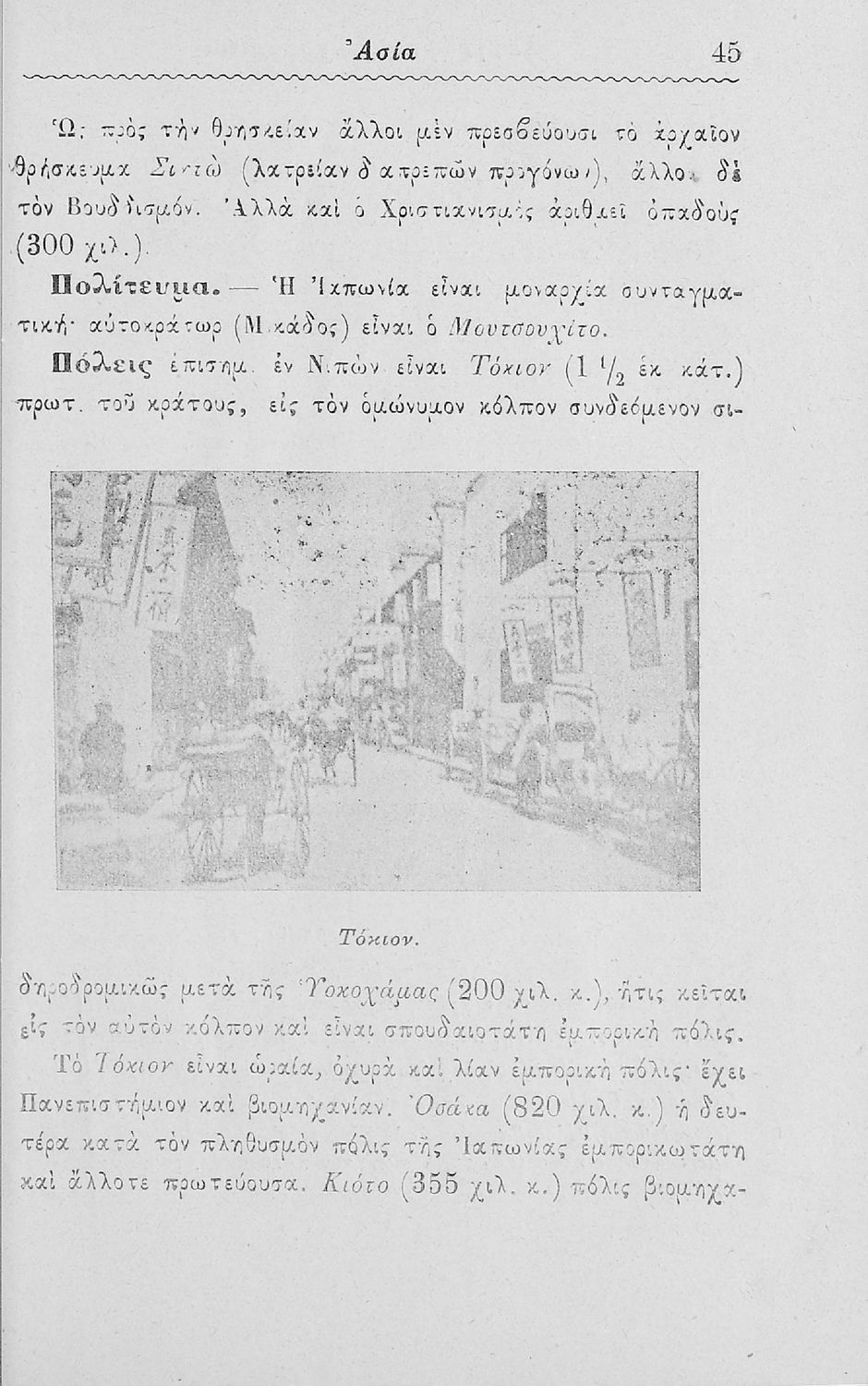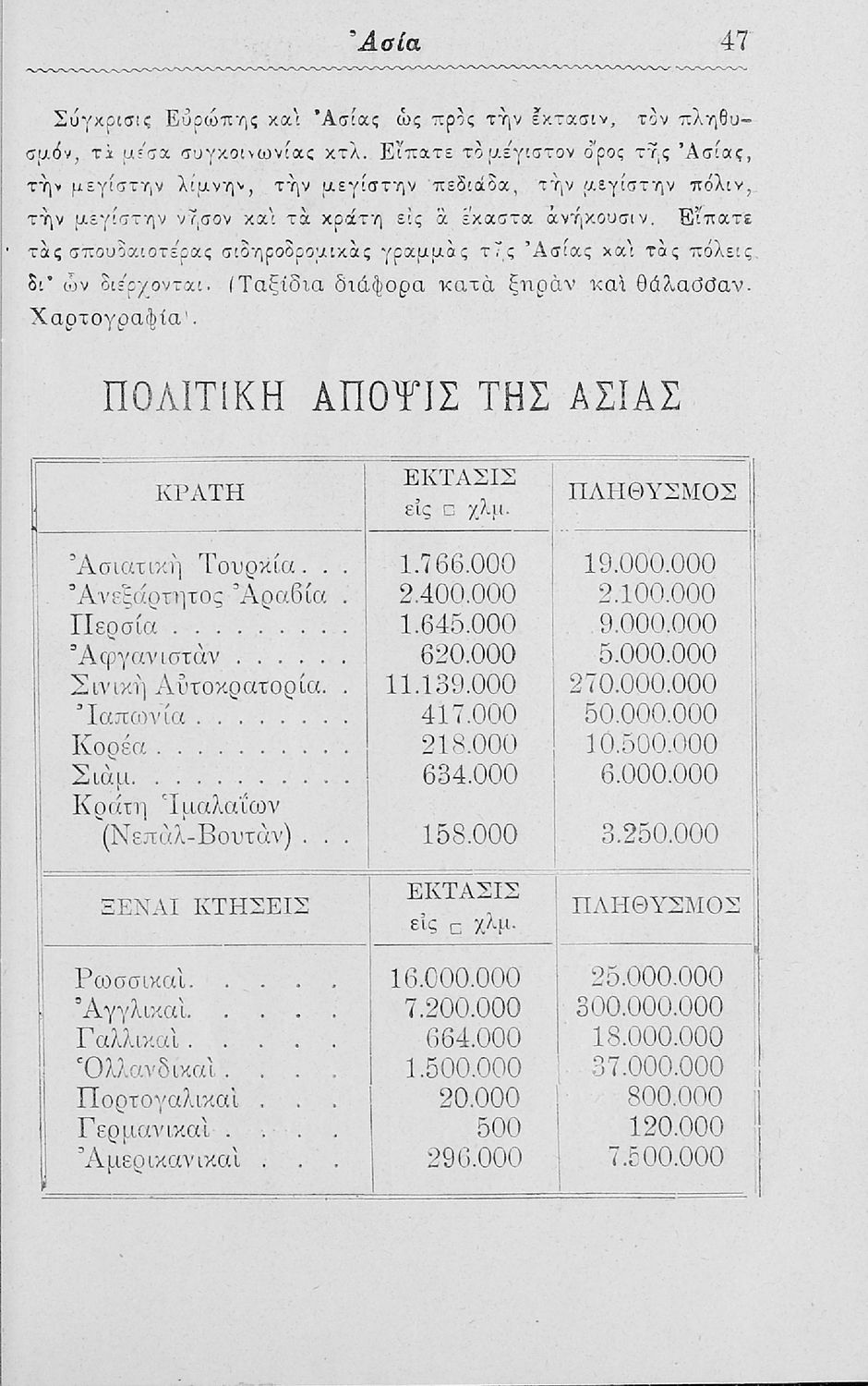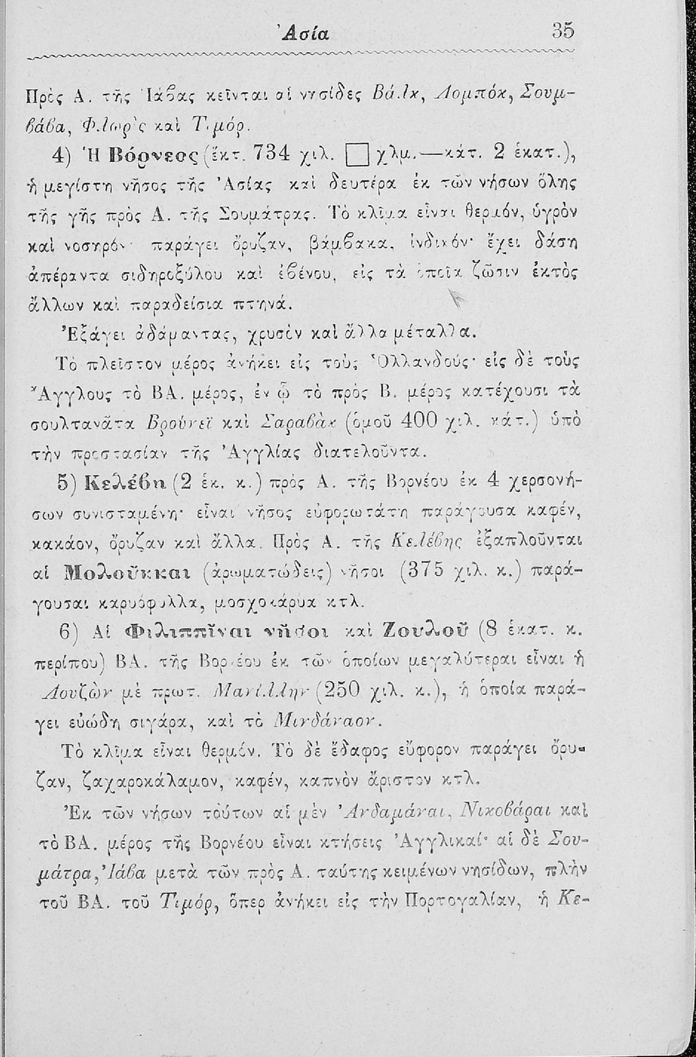 Μαθητικό βοήθημα Γεωγραφίας για τις Ανώτερες τάξεις των Αστικών Σχολείων που περιλαμβάνει στοιχεία φυσικής και μαθηματικής γεωγραφίας και εξετάζει κράτη από τις πέντε ηπείρους από γεωφυσική, πολιτική και οικονομική άποψη.