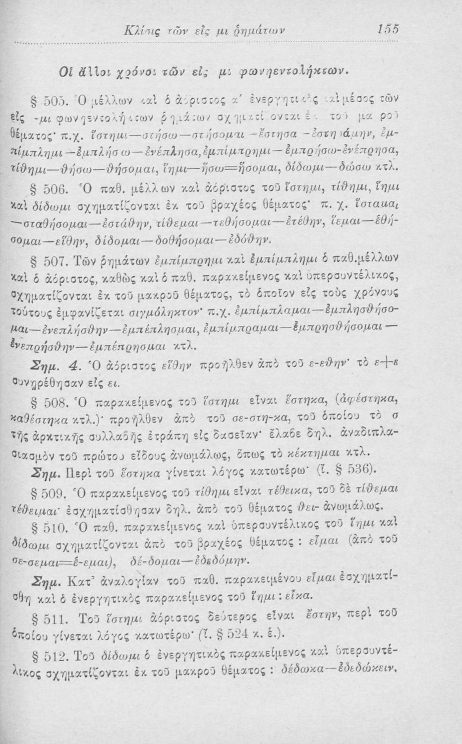 Σχολικό εγχειρίδιο Αρχαίων Ελληνικών για τα Ελληνικά Σχολεία, Παρθεναγωγεία και Γυμνάσια που περιέχει τους κανόνες γραμματικής και είναι χωρισμένο σε φθογγολογικό, τυπολογικό και ετυμολογικό μέρος.