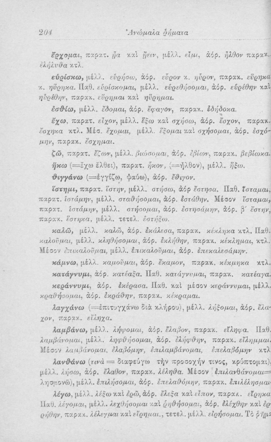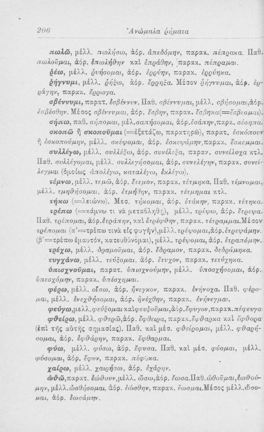Μαθητικό βοήθημα Αρχαίων Ελληνικών Γυμνασίου, Ελληνικού Σχολείου και Παρθεναγωγείου που περιέχει τα ανώμαλα ρήματα της αττικής διαλέκτου και γραμματικές σημειώσεις.