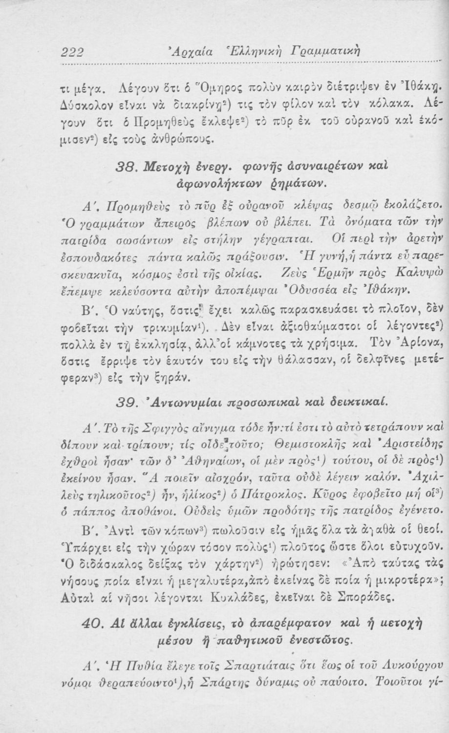 Σχολικό εγχειρίδιο Αρχαίων Ελληνικών για τα Ελληνικά Σχολεία, Παρθεναγωγεία και Γυμνάσια που περιέχει τους κανόνες γραμματικής και είναι χωρισμένο σε φθογγολογικό, τυπολογικό και ετυμολογικό μέρος.