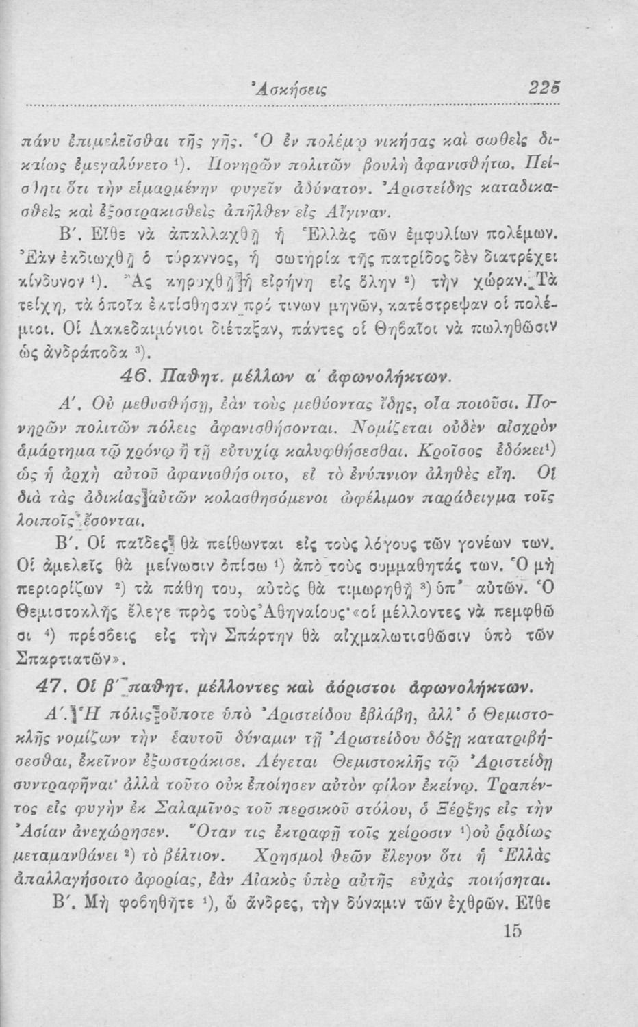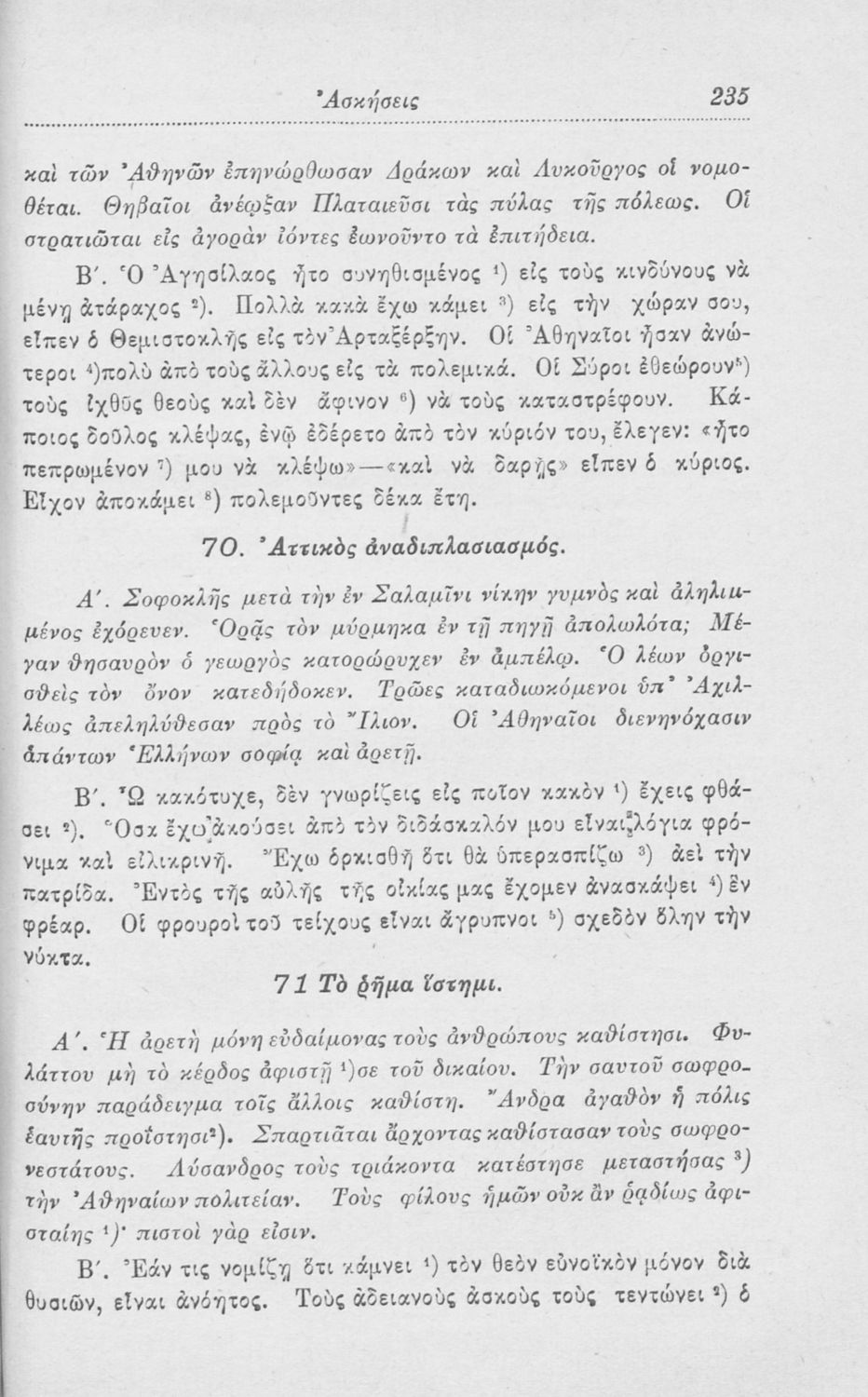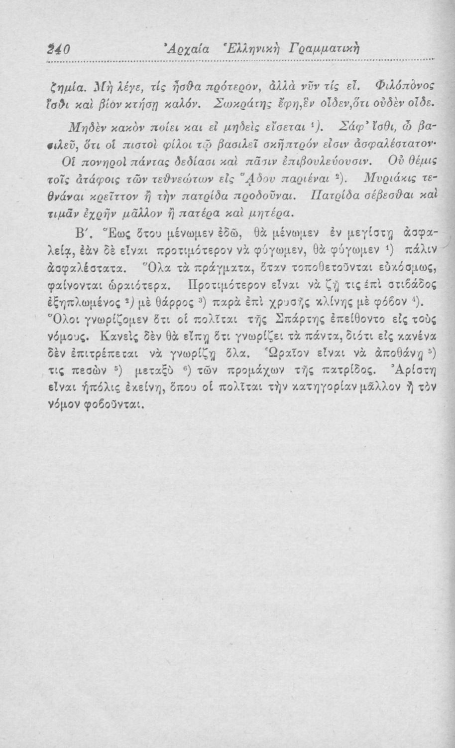 Σχολικό εγχειρίδιο Αρχαίων Ελληνικών Γ' Ελληνικού Σχολείου που περιλαμβάνει γραμματική της αρχαίας ελληνικής, αποσπάσματα από το έργο του Ξενοφώντα Ελληνικά και τα έργα του Λουκιανού Ενύπνιον και Ανάχαρσις, ...