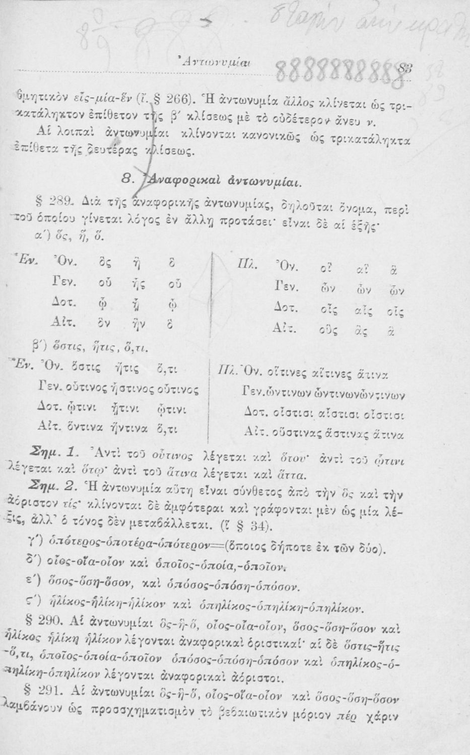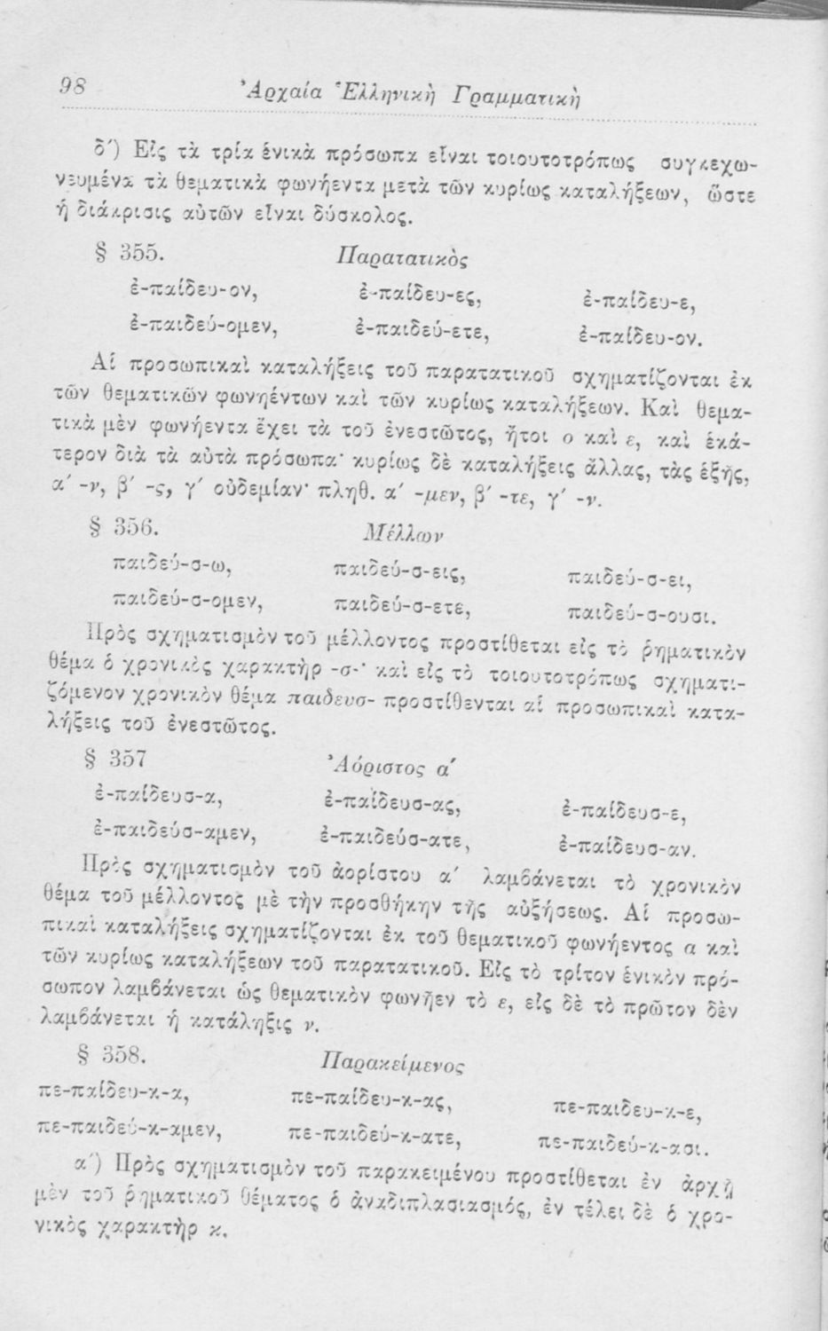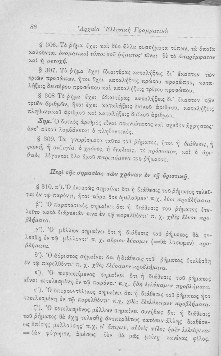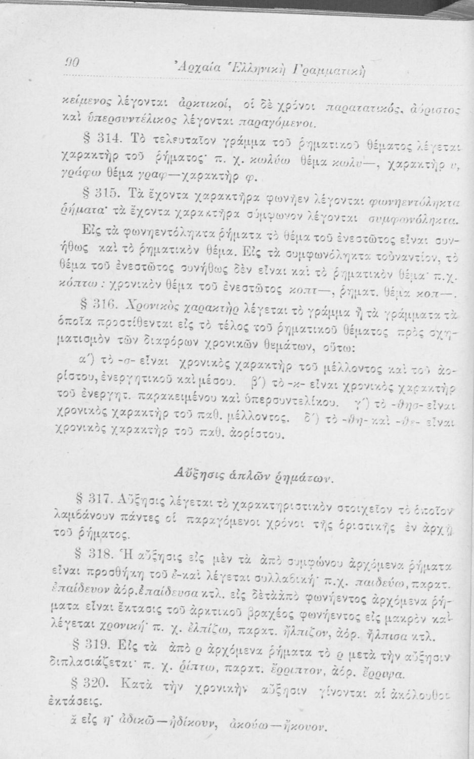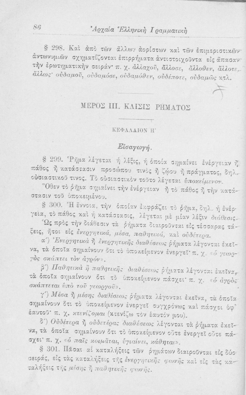 Σχολικό εγχειρίδιο Αρχαίων Ελληνικών για τα Ελληνικά Σχολεία, Παρθεναγωγεία και Γυμνάσια που περιέχει τους κανόνες γραμματικής και είναι χωρισμένο σε φθογγολογικό, τυπολογικό και ετυμολογικό μέρος.