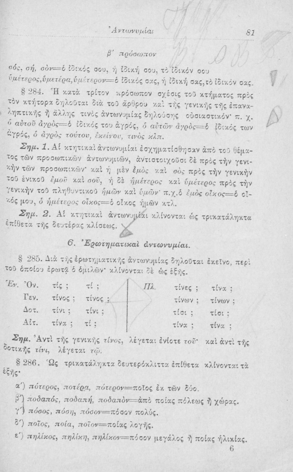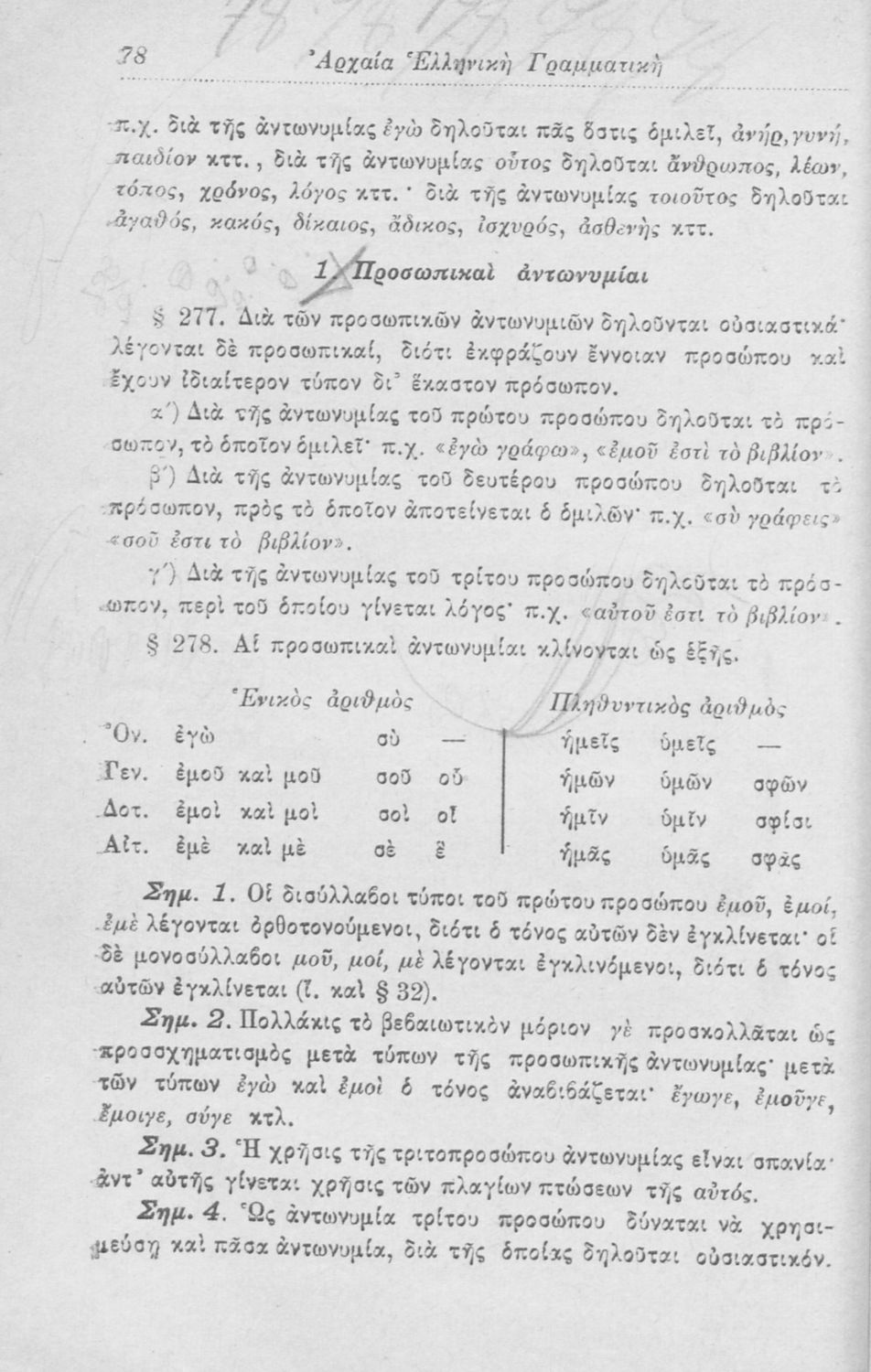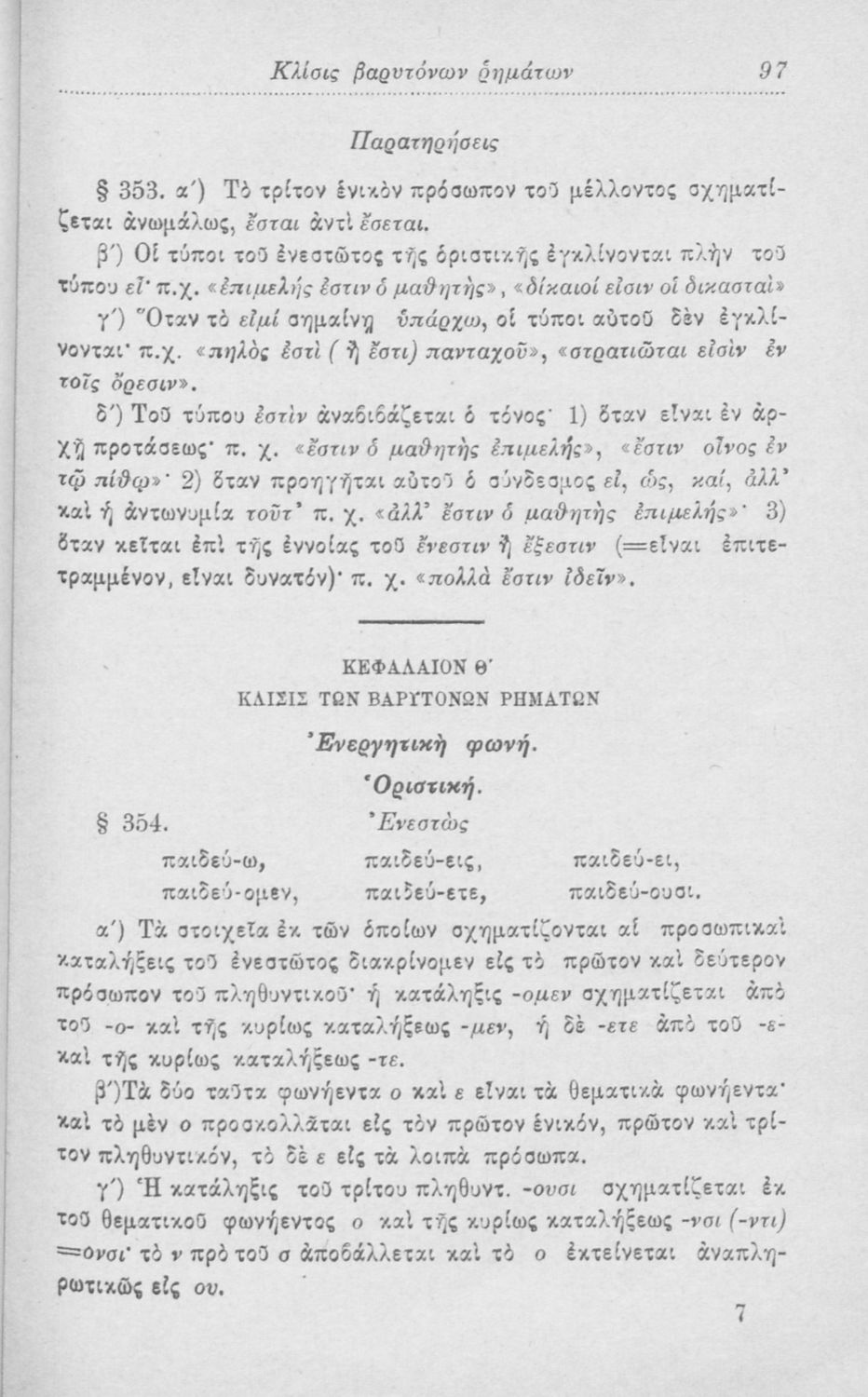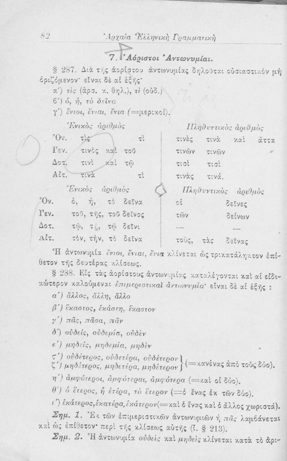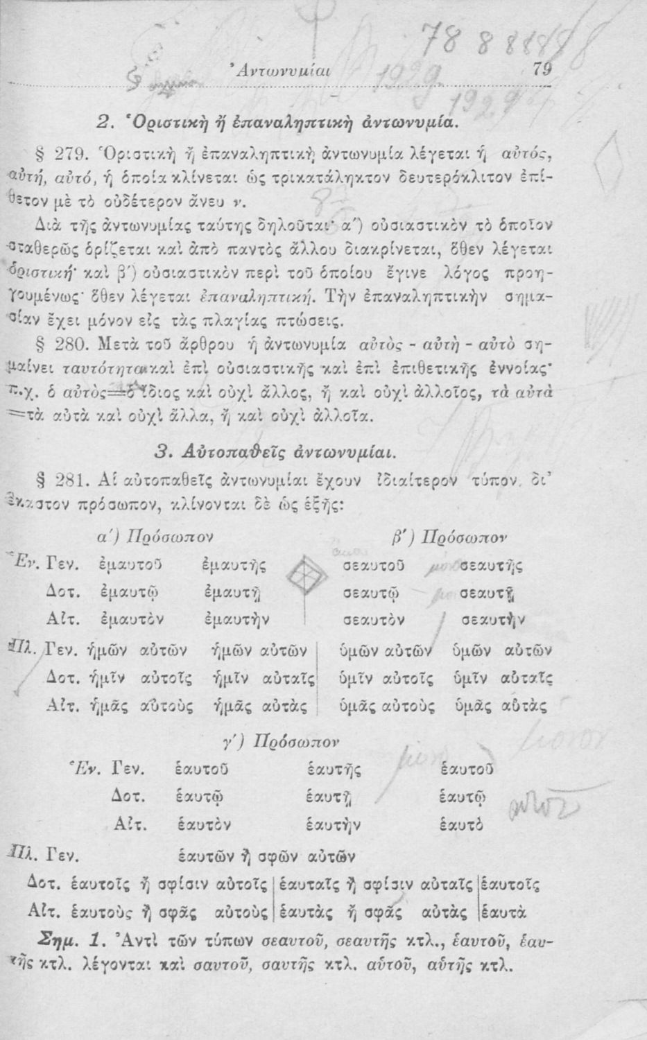Σχολικό εγχειρίδιο Αρχαίων Ελληνικών για τα Ελληνικά Σχολεία, Παρθεναγωγεία και Γυμνάσια που περιέχει τους κανόνες γραμματικής και είναι χωρισμένο σε φθογγολογικό, τυπολογικό και ετυμολογικό μέρος.