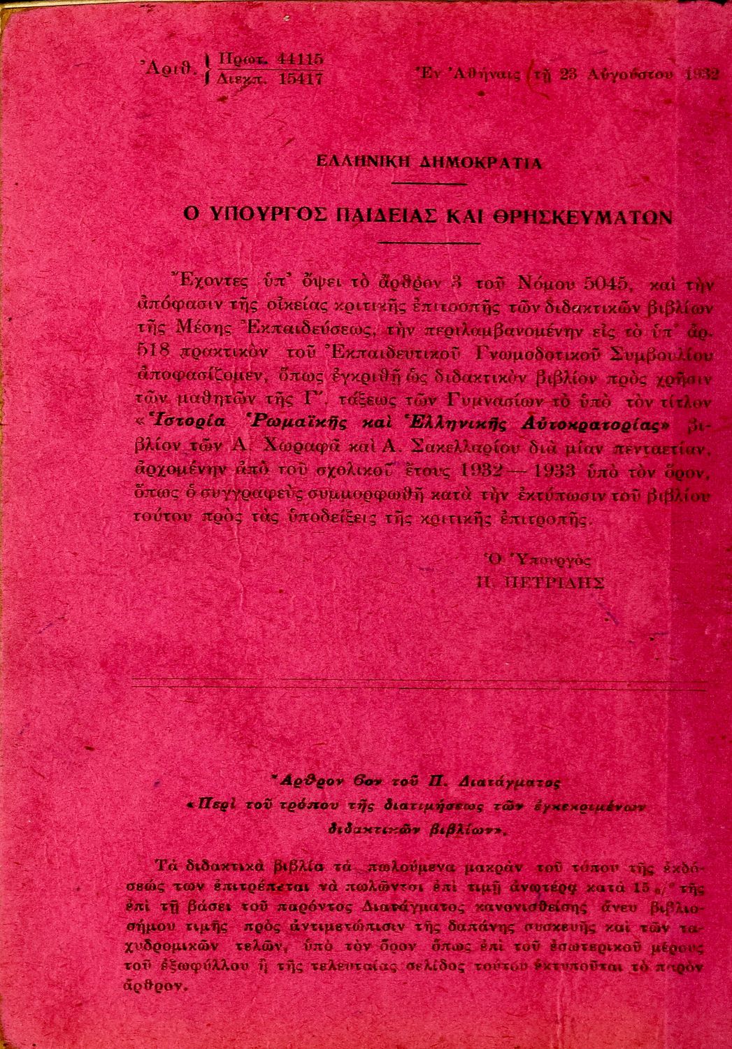 Τίτλος: Ιστορία Ρωμαϊκή και Βυζαντινή από της υποταγής της Ελλάδος εις τους Ρωμαίους μέχρι του 8ου αιώνος μ. Χ. Δια την Γ΄ Τάξιν του Γυμνασίου